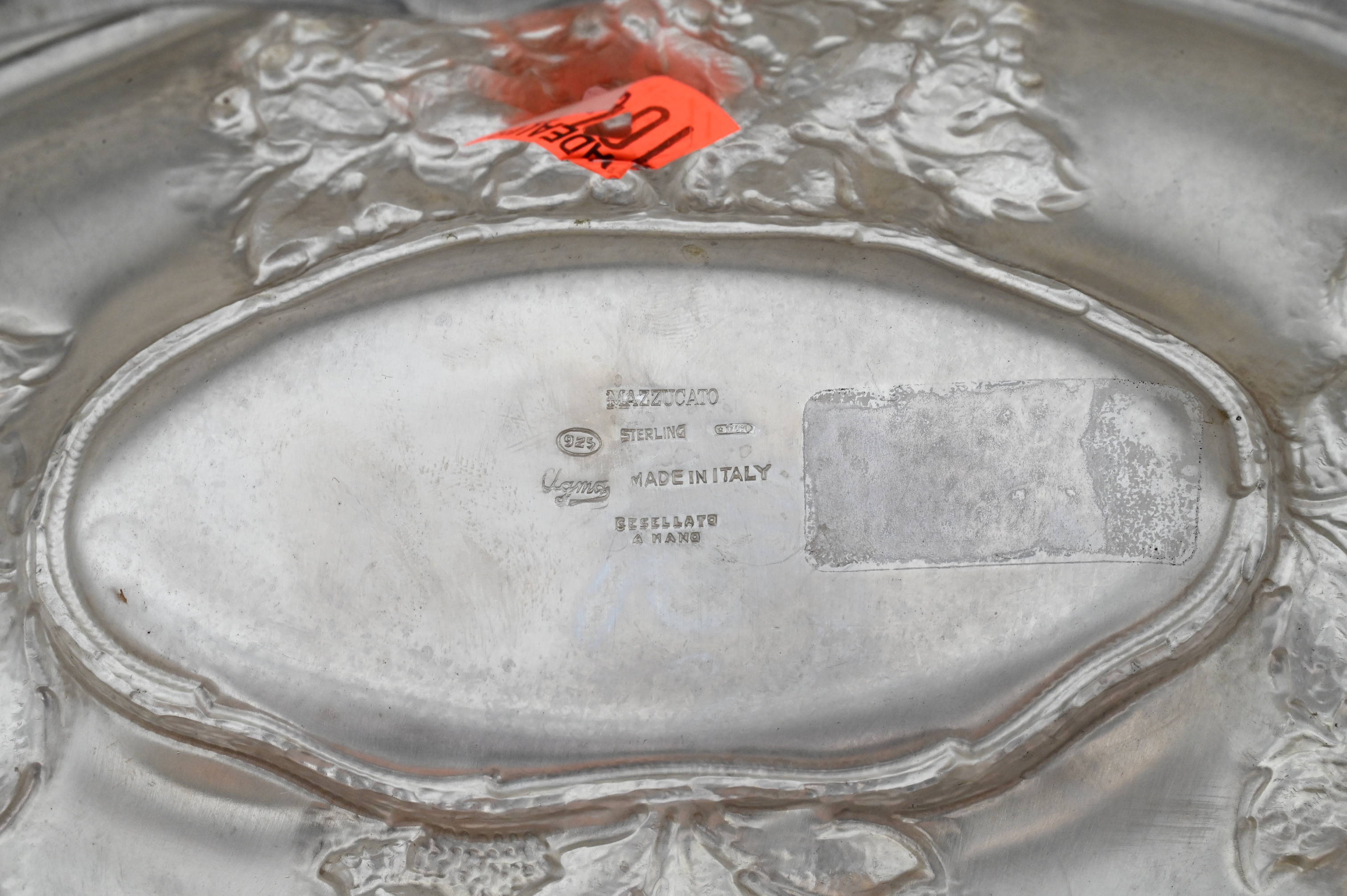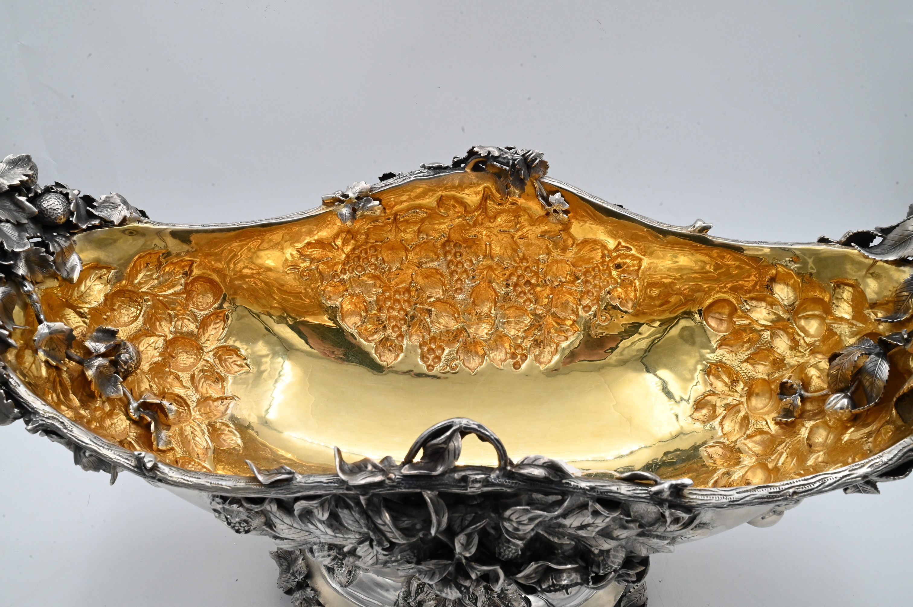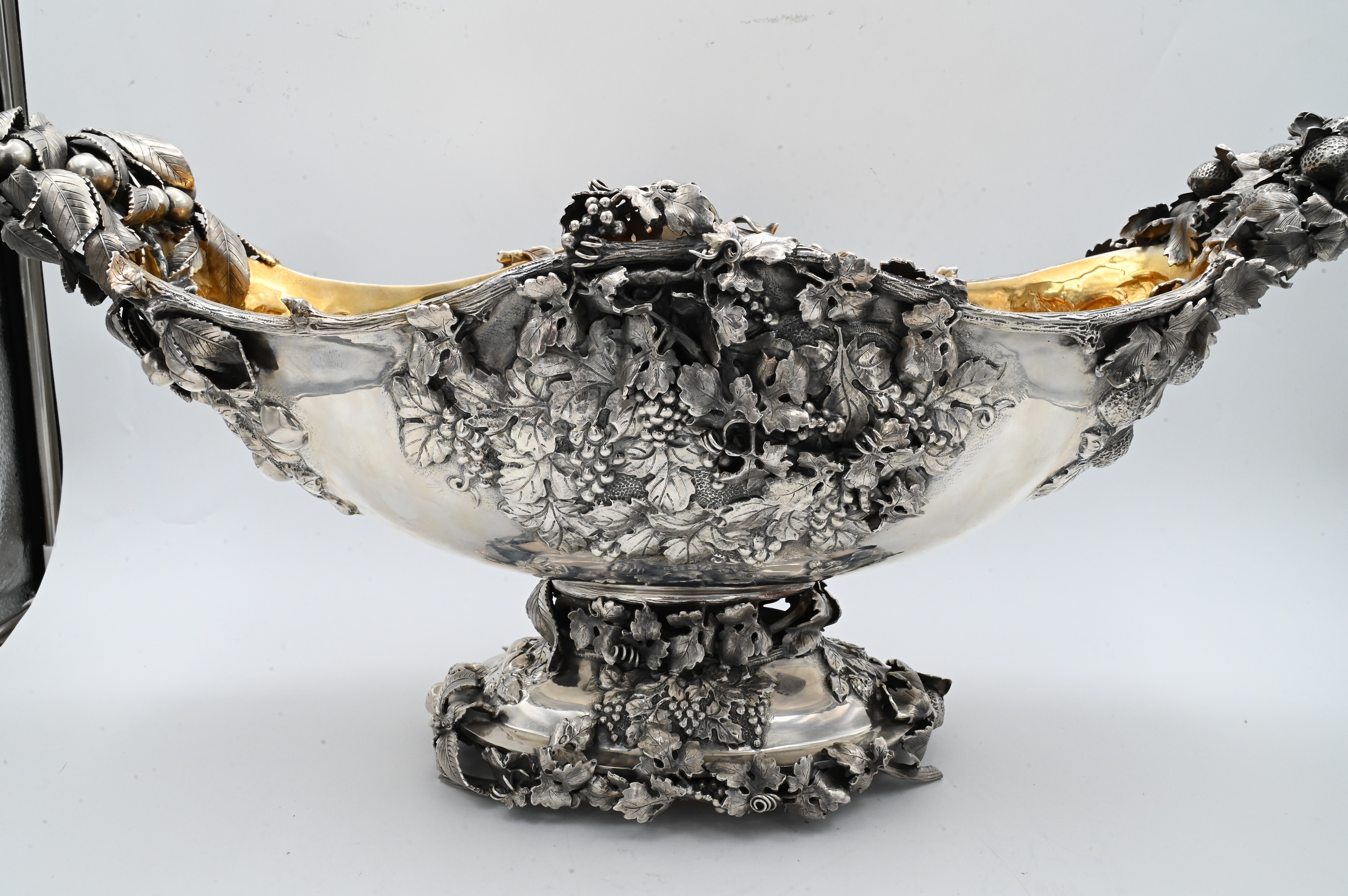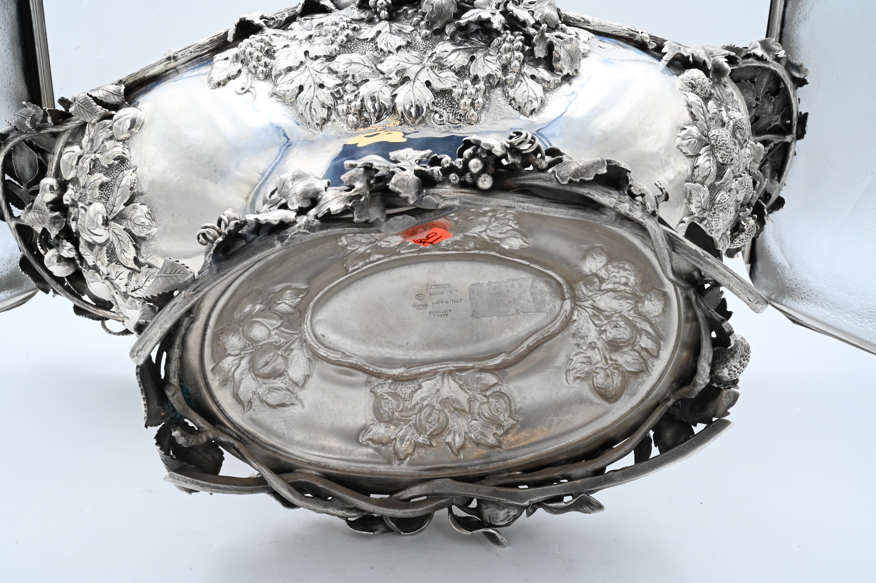 made in Italy, having bunches of grapes, strawberrys, pomegranates, and cherries on all four sides, having vermeil interior, marked Mazzucato 920 made in Italy Gesellato
