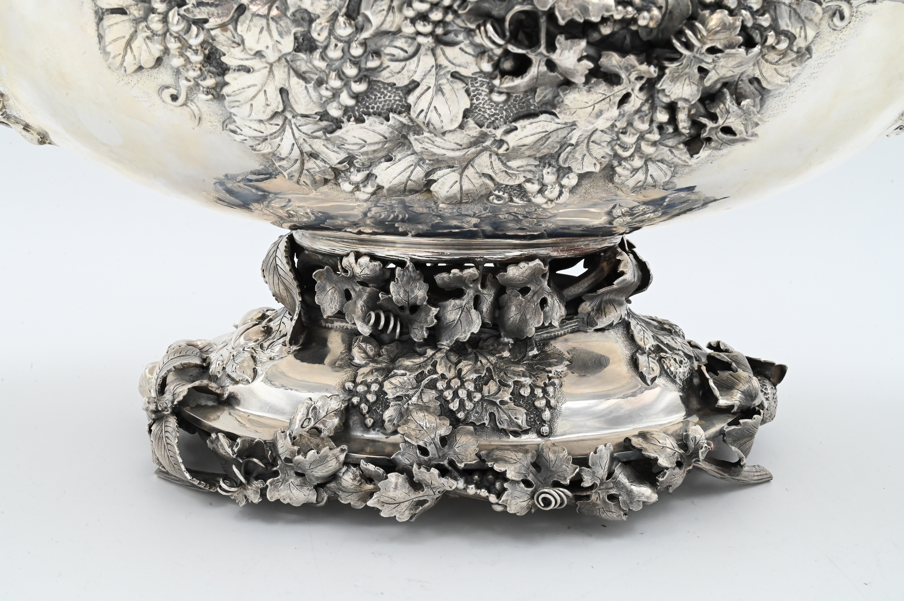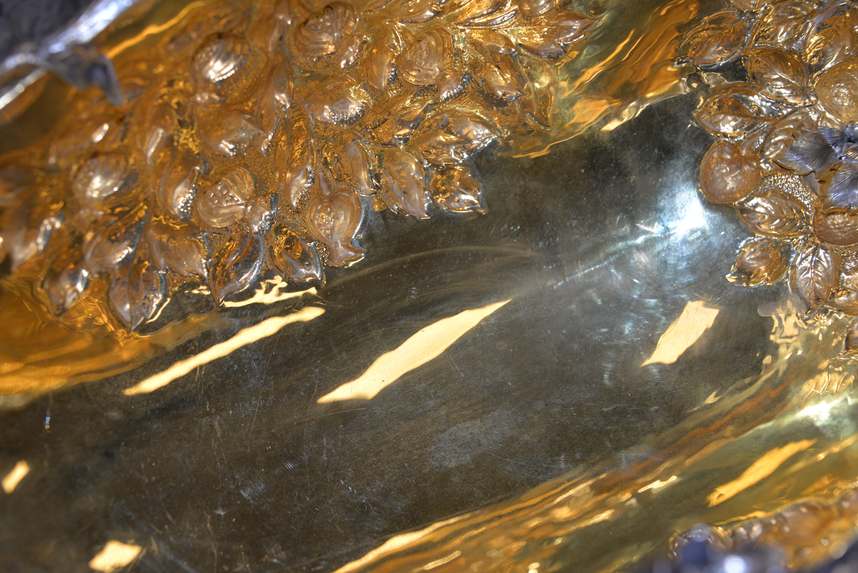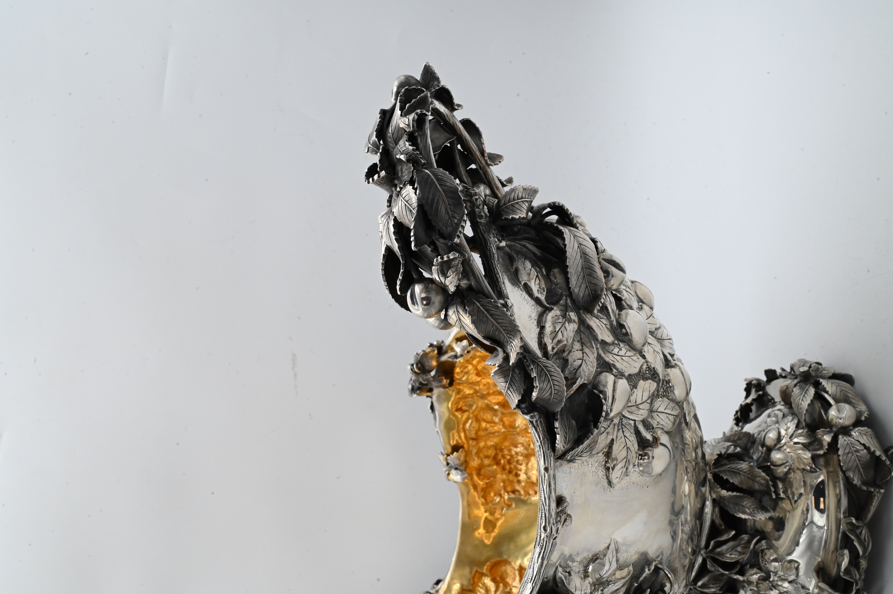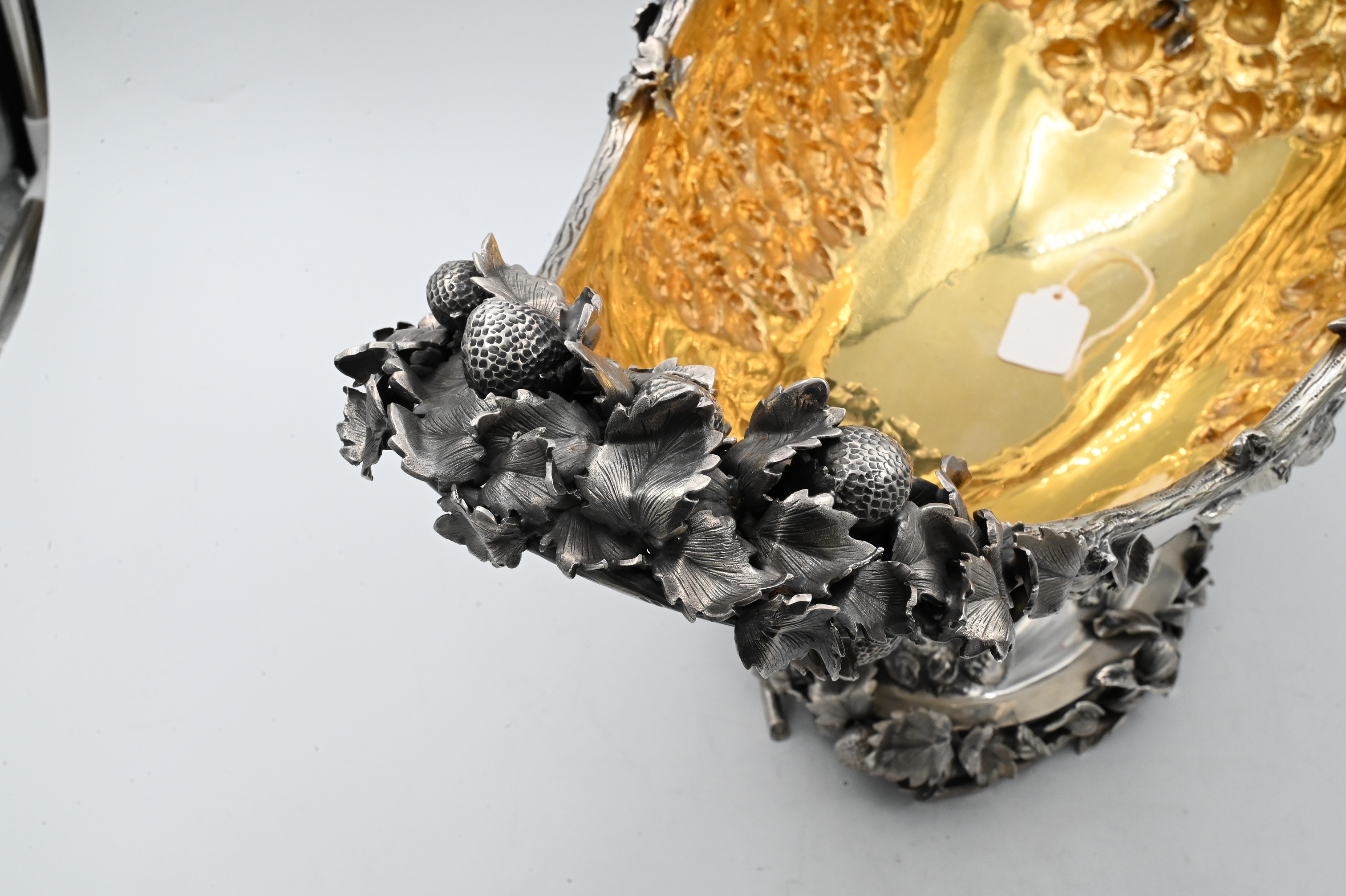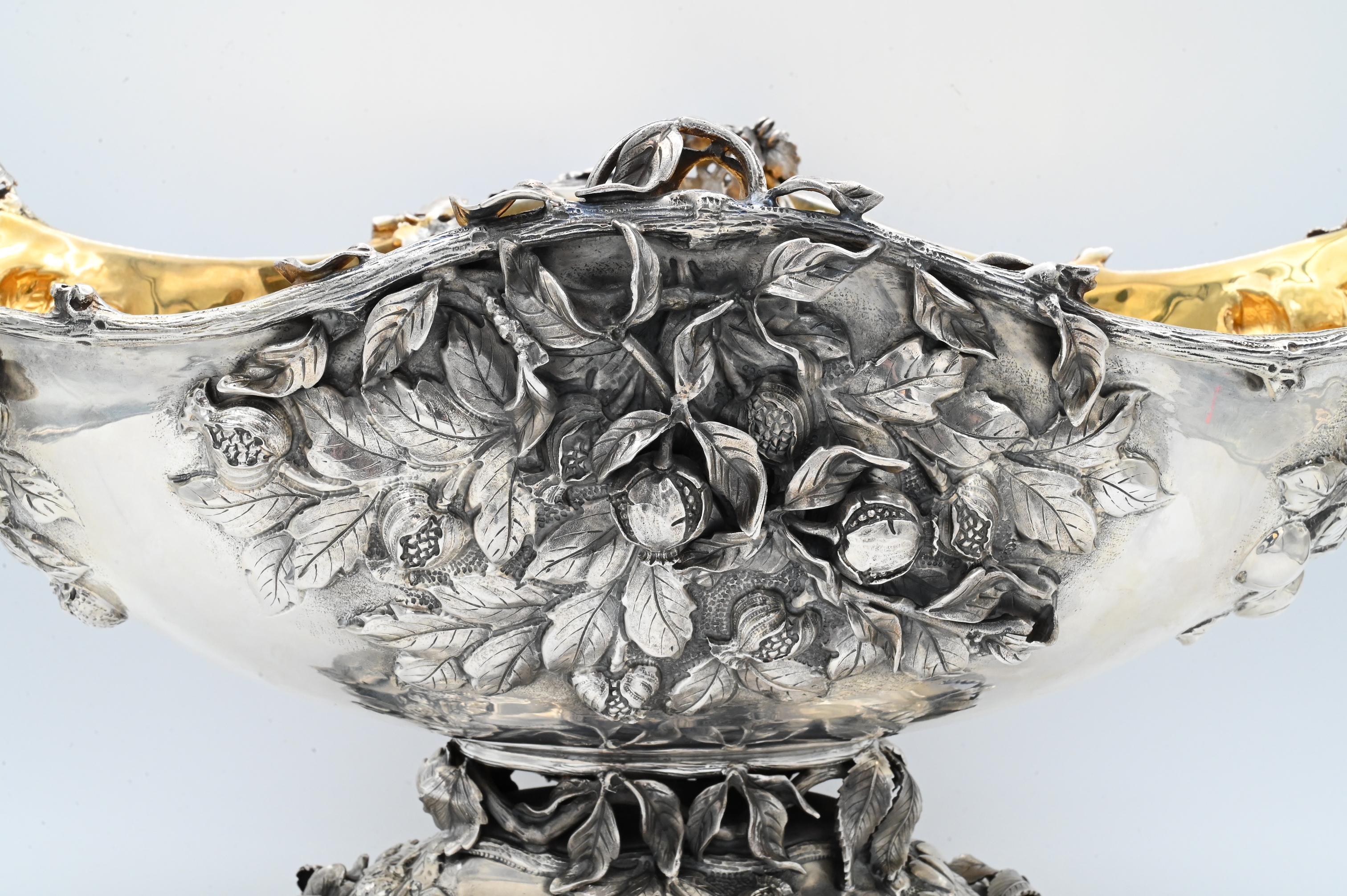 made in Italy, having bunches of grapes, strawberrys, pomegranates, and cherries on all four sides, having vermeil interior, marked Mazzucato 920 made in Italy Gesellato