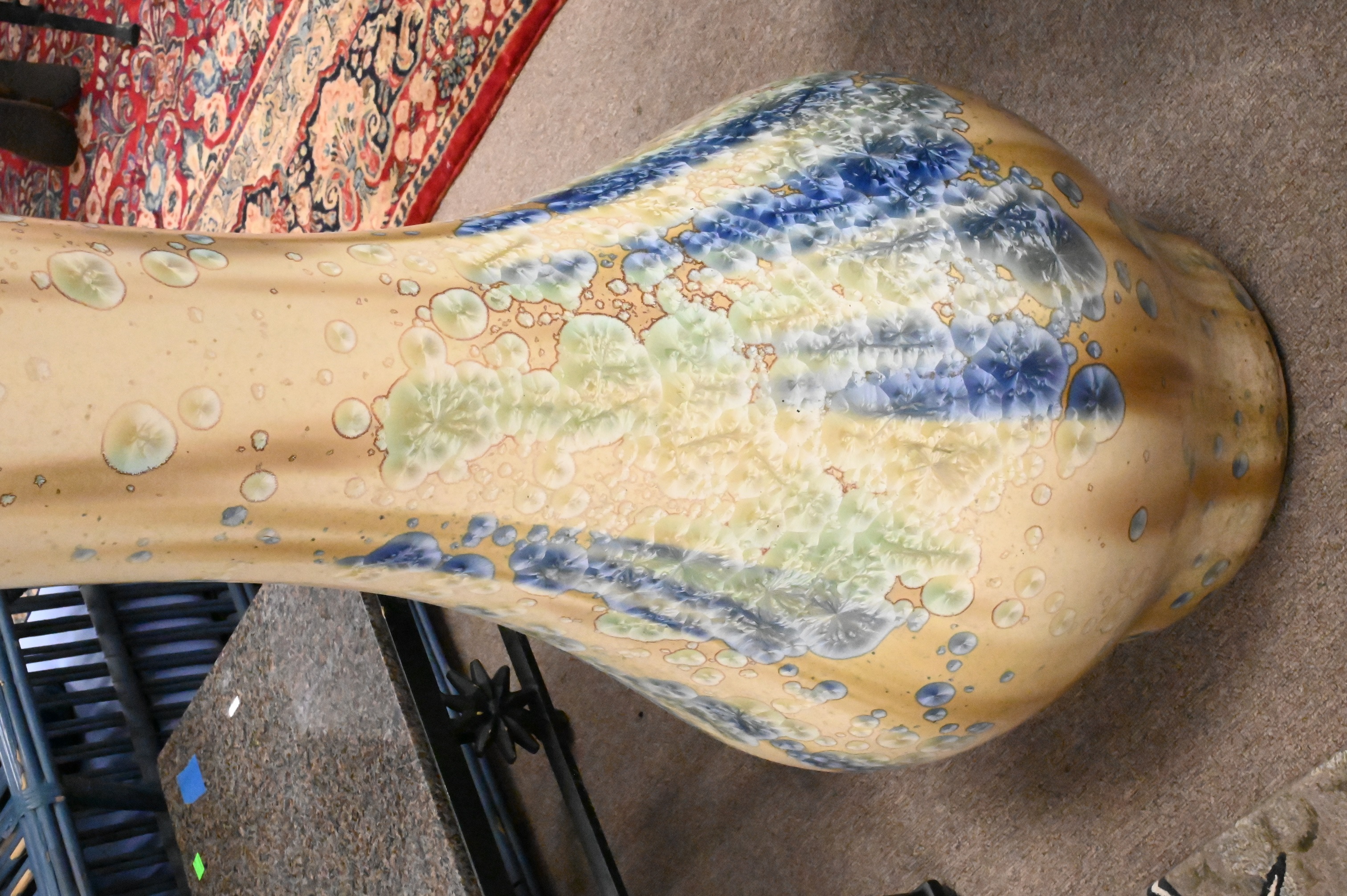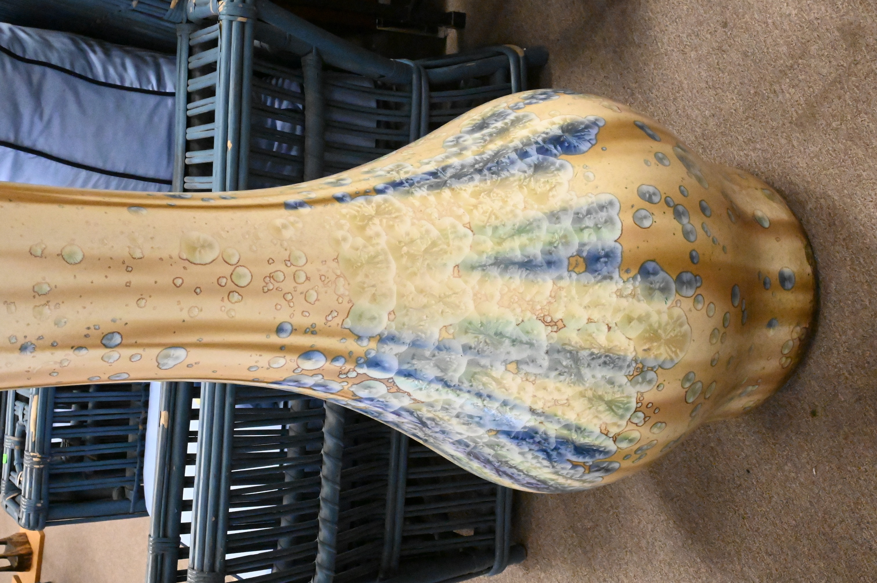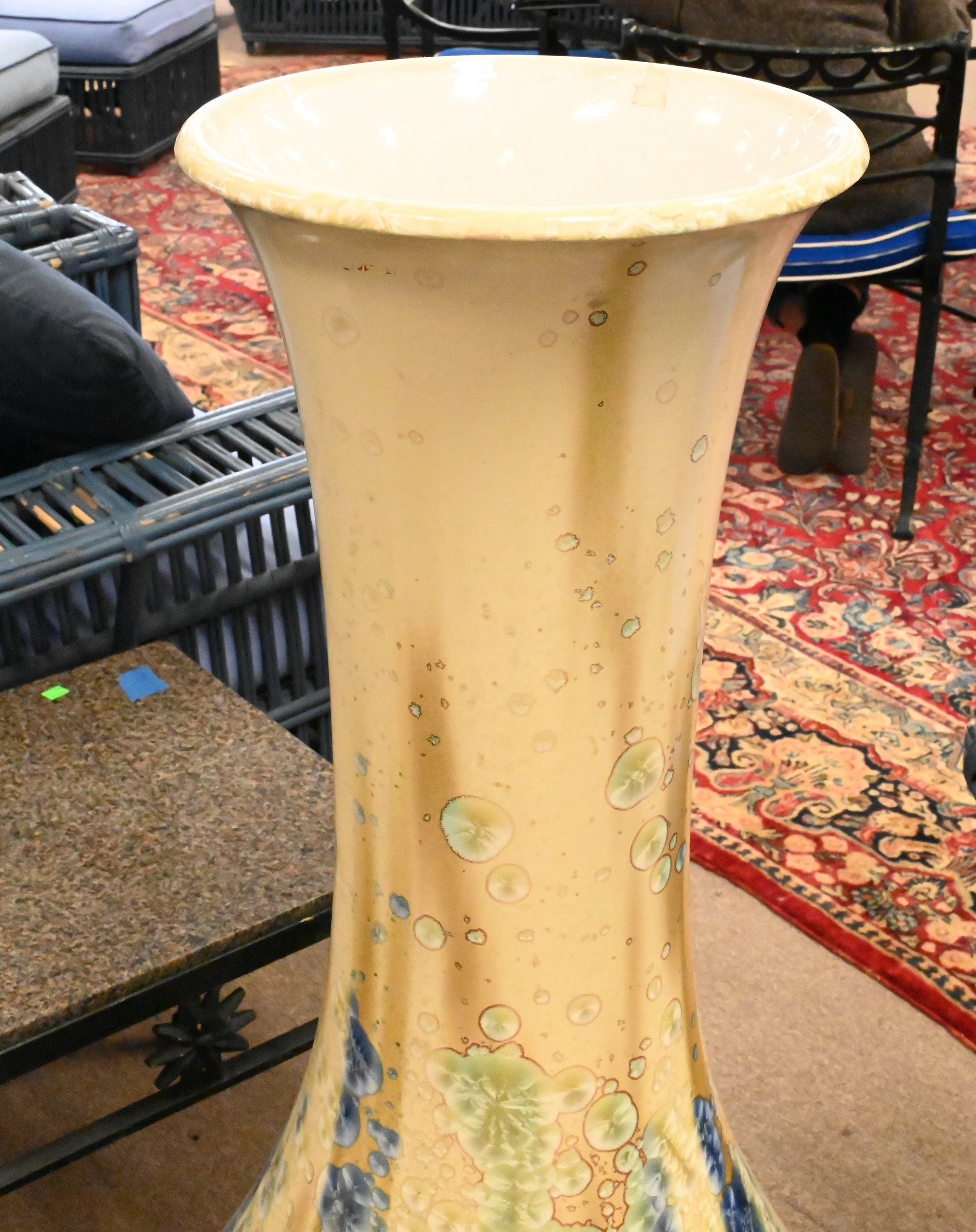 crystalline glazed in blue and green French 1900, having incised exposition international market number on interior rim, C 95 11 Pn possibly made for the Paris Universal Exhibition or Paris France World’s Fair, large objets d’art, also having a S +900 inside a triangle drill bottom