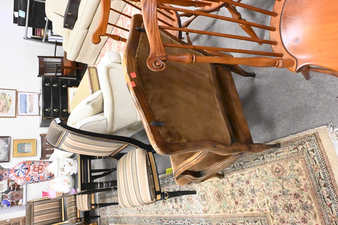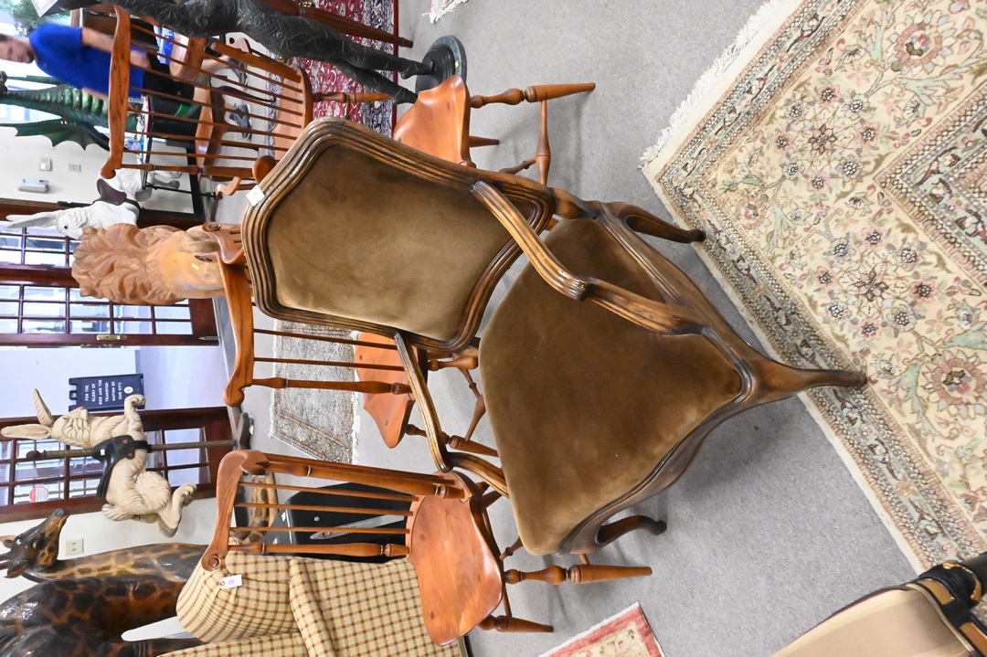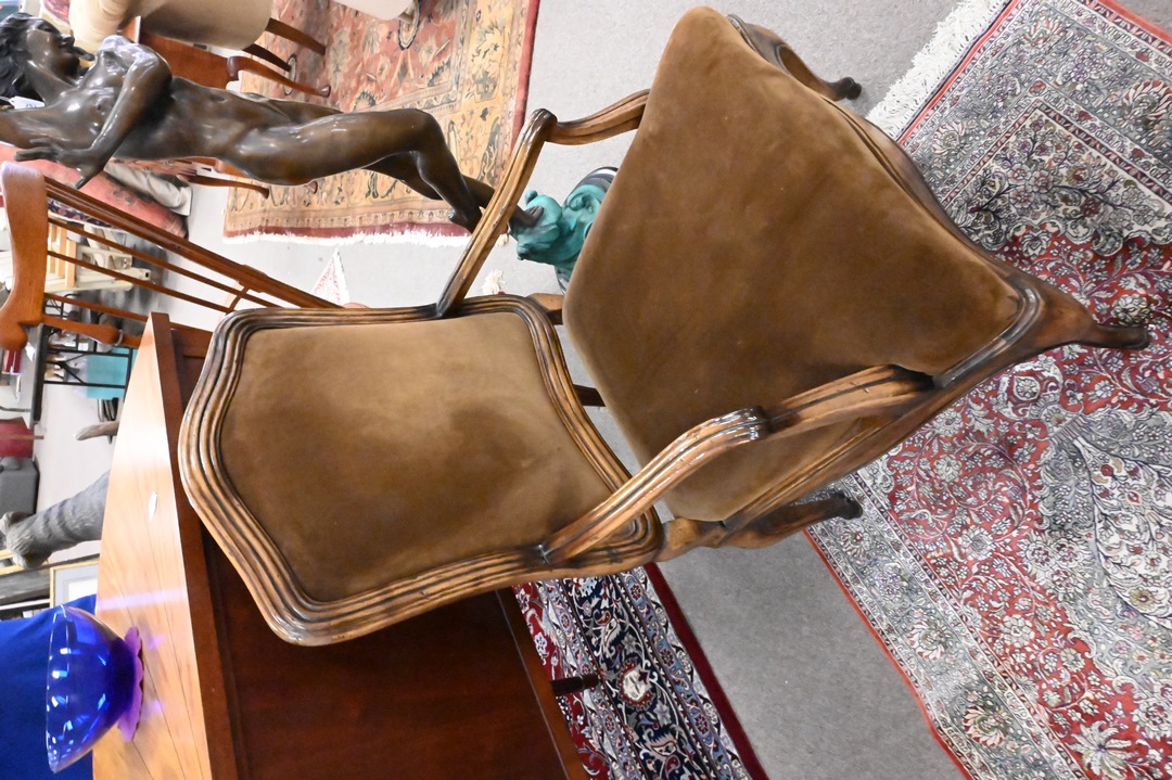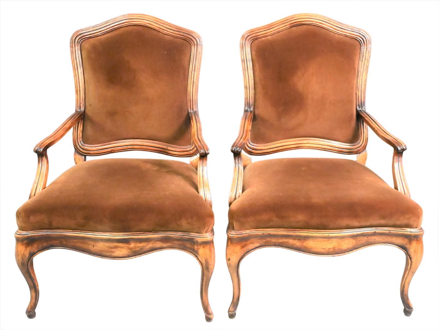 Pair of Yale R. Burge Fauteuils, having brown upholstered backs and seats, height 40 inches, width 27 inches.
