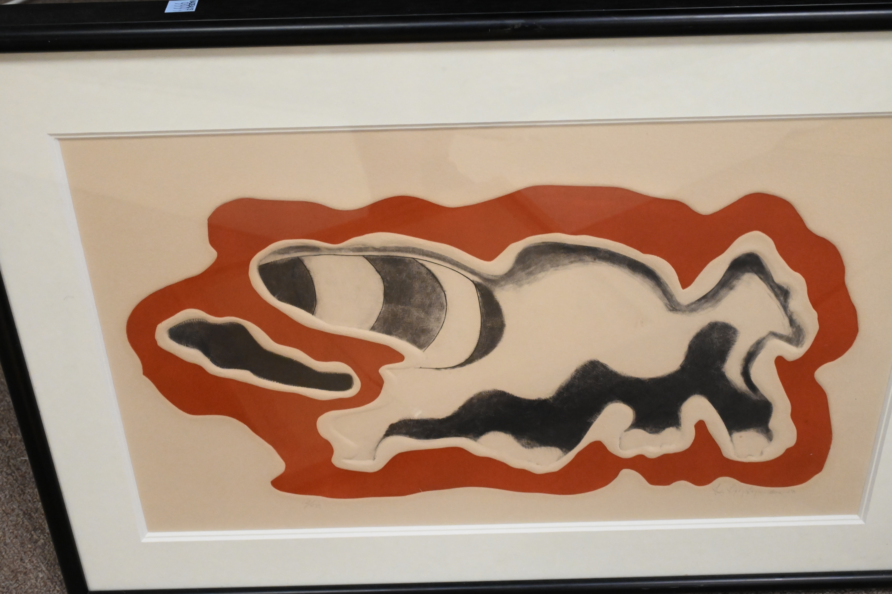 to include, Ron Manyida Buliman “Barramundi” acrylic on Aquarelle Arches paper, Les Huddleston “Lipwurrunga Mimmi Spirit”, acrylic on canvas, an acrylic on paper of a lizard and person, an acrylic on paper of two fish, Luis Lopez Loza (Mexico b. 1939) lithograph of a raccoon, edition 12/150 1969, a framed cut cloth, along with Sharon Paltharr Briscoe (Aboriginal Australian) “Perentie Dreaming”, dot painting, description written on verso “Anmatyerre language Perentie Dreaming, This Perentie is on top of a rock. Aboriginal people eat perenties”