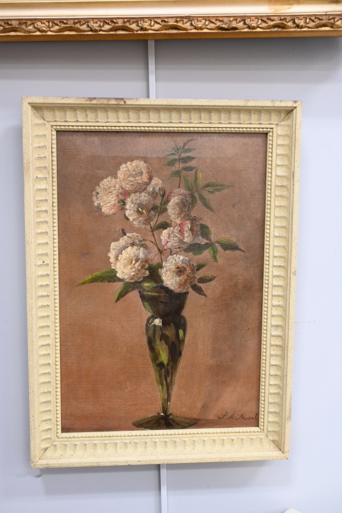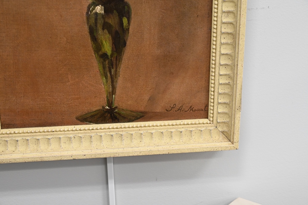 Lot 375: Shepard Alonzo Mount (1804 – 1868), still life of flowers, oil on board, signed lower right S.A. Mount, 12 1/2 x 8 1/2 inches.