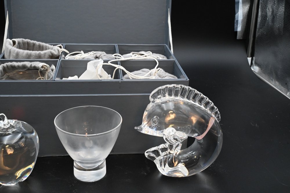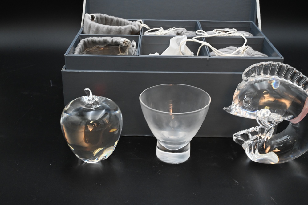 Lot 375: Steuben Group, to include fish, apple, and a set of 6 rocks glasses in original fitted box, height of fish 5.75 inches.