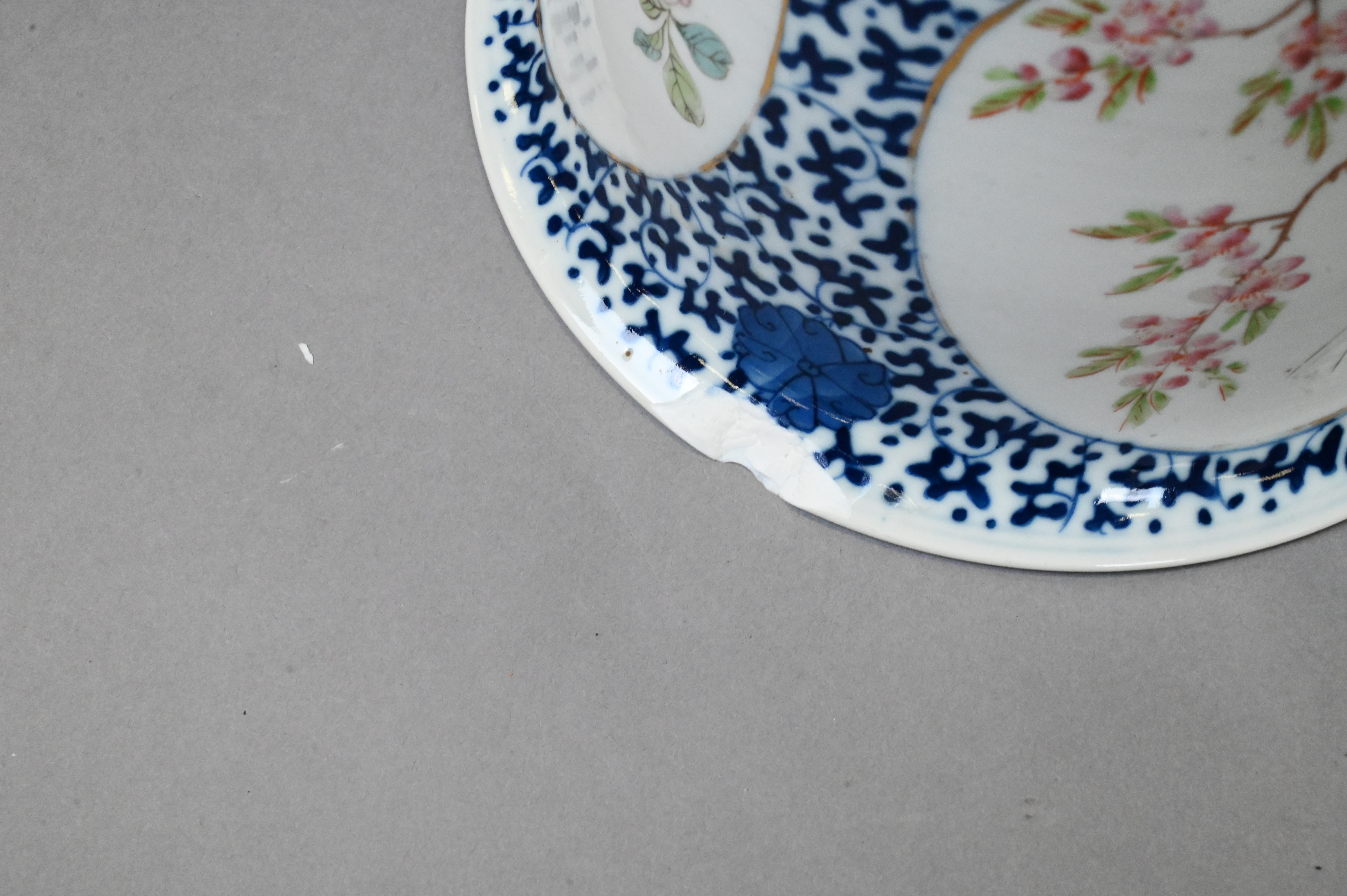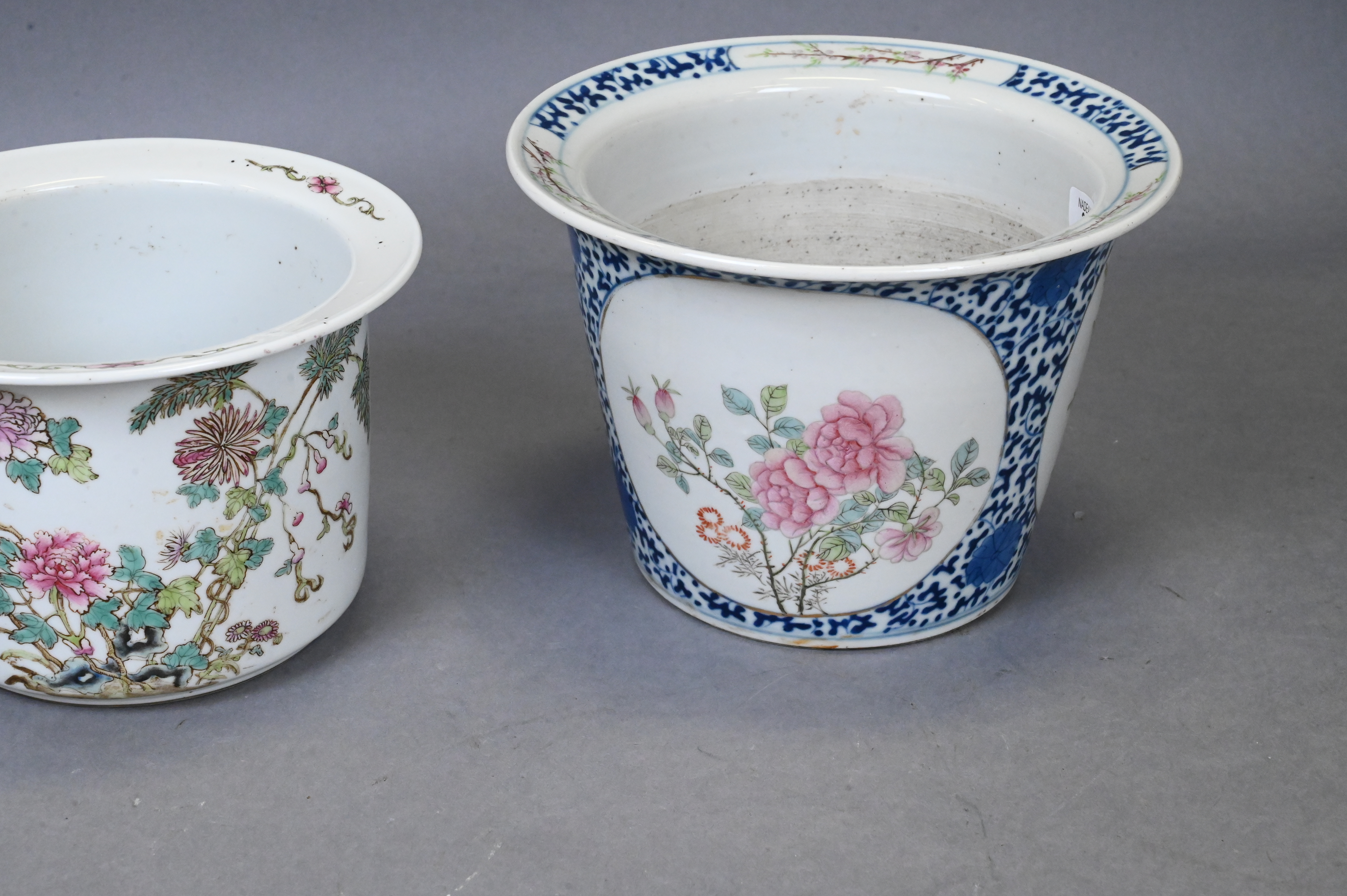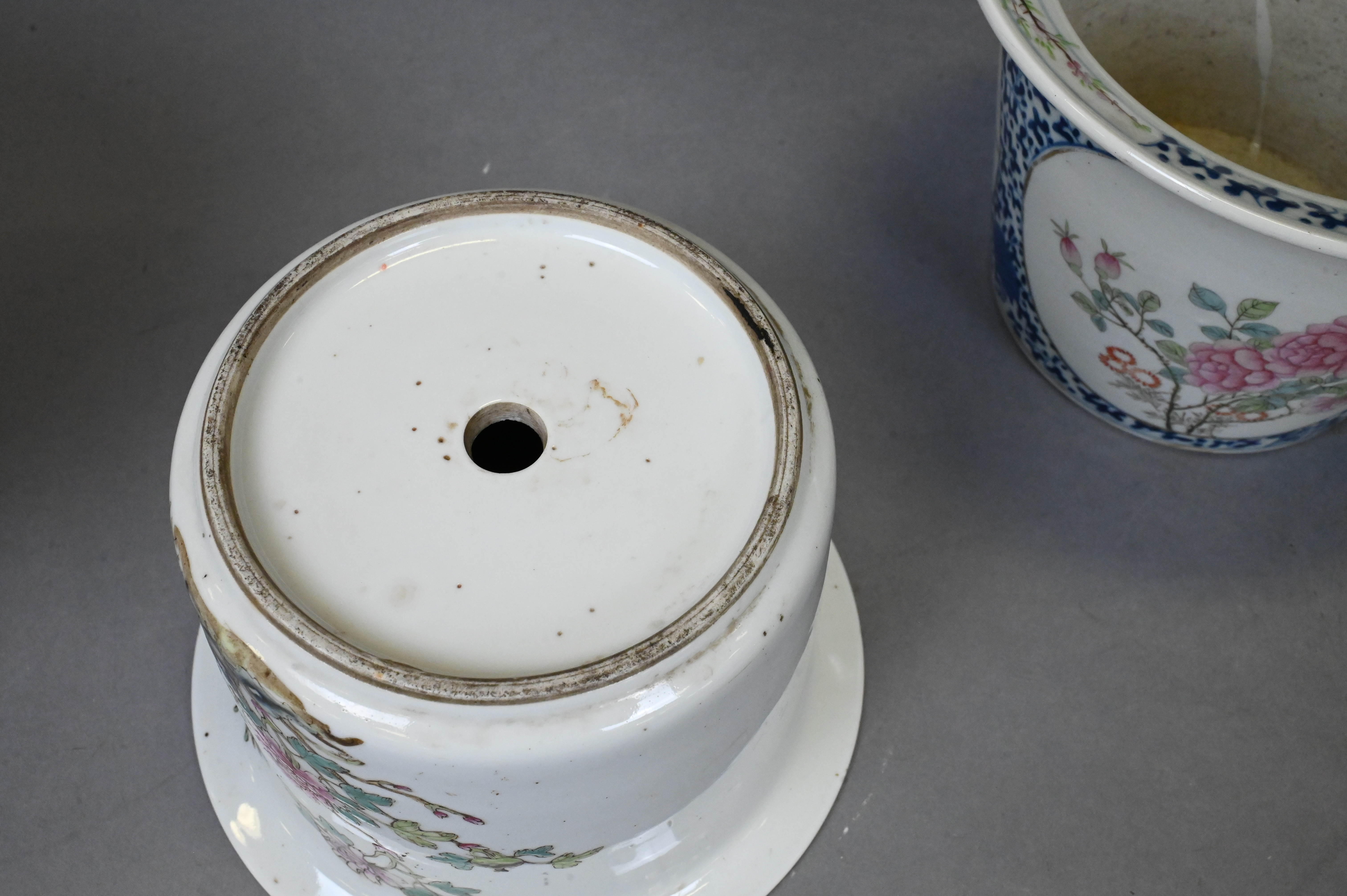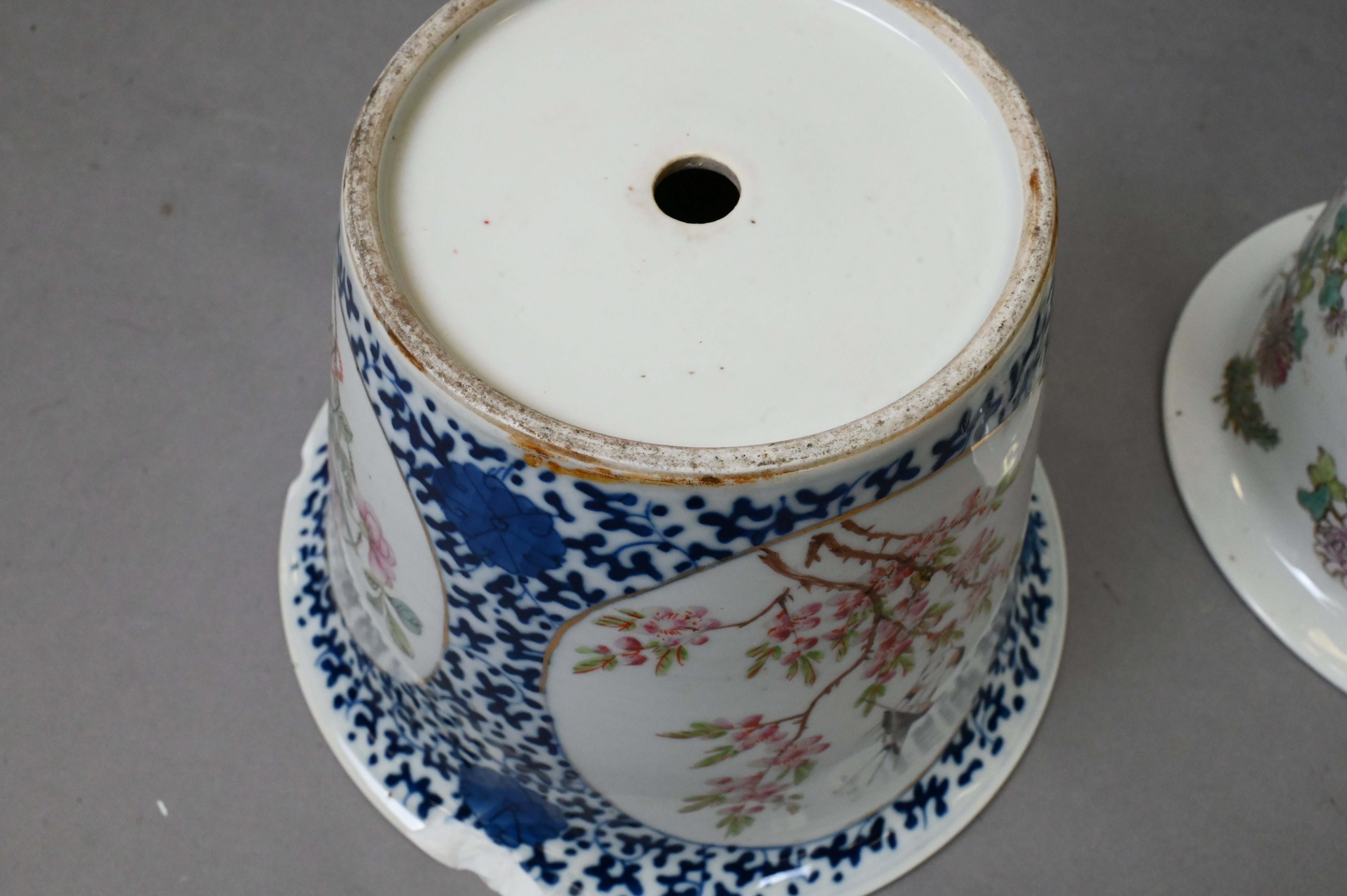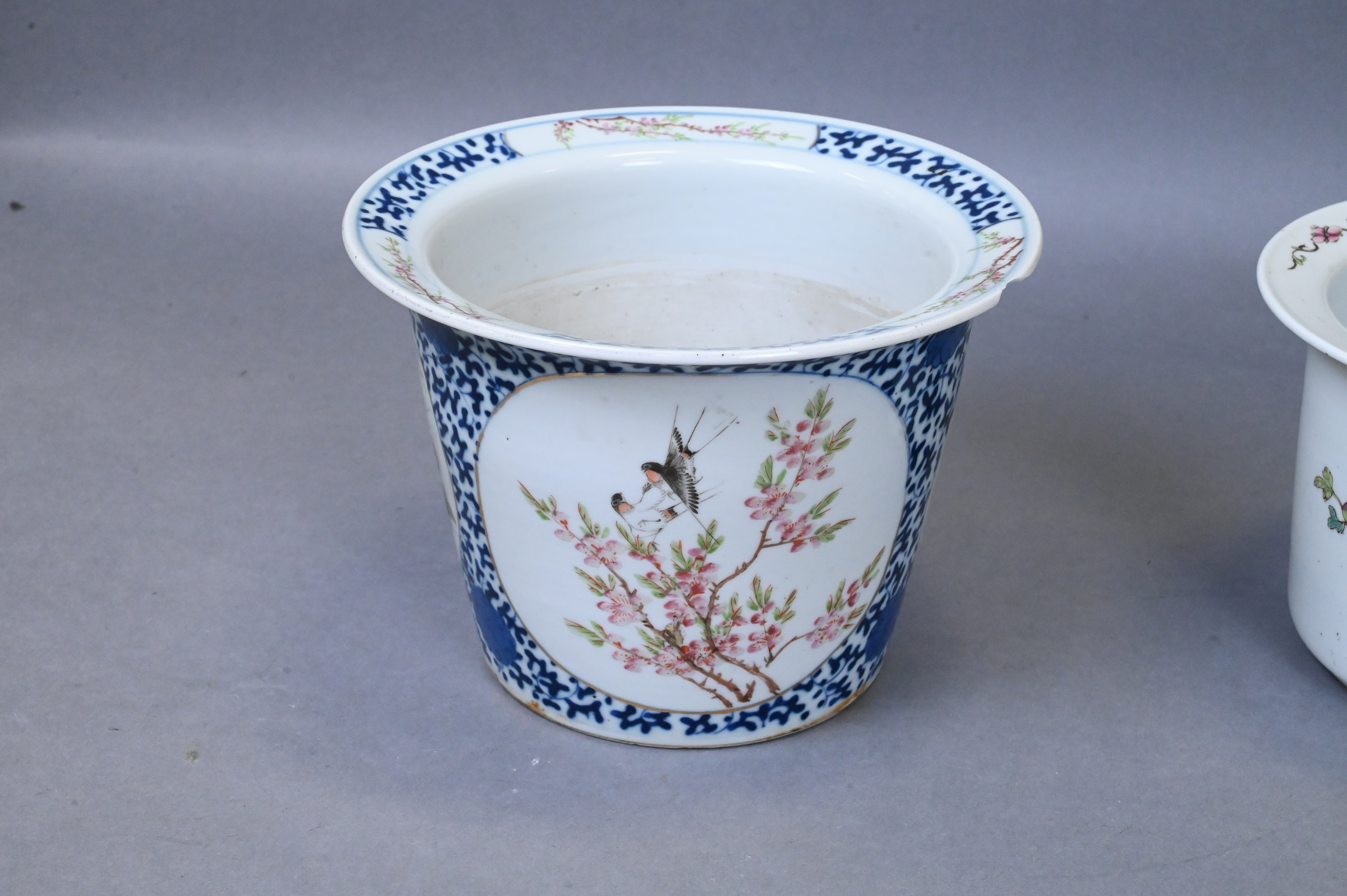 to include pair of export pots having scrolling blue and white border with round cartouches featuring sparrows and cherry blossom branches along with a Chrysanthemum flower and enameled ball planter, each with drainage hole