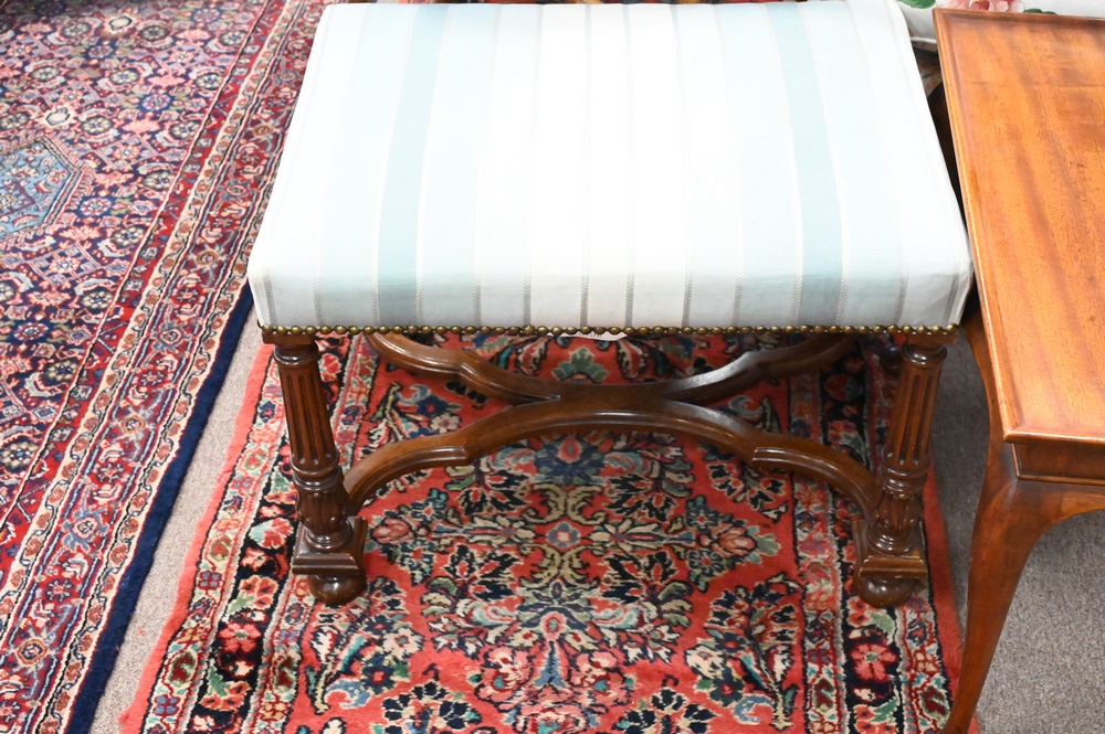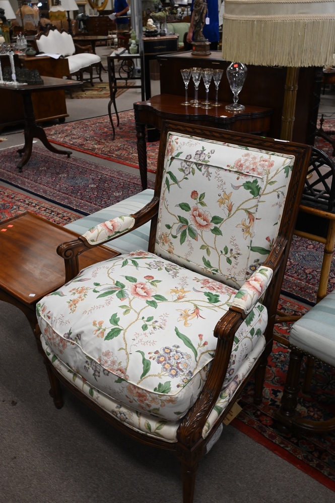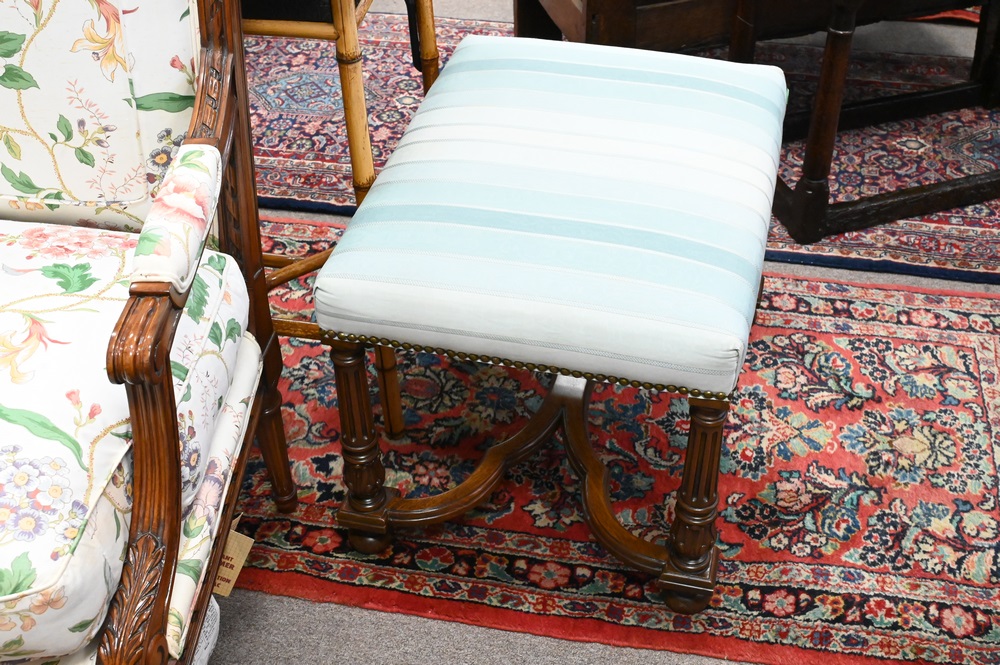 Three Piece Upholstered Lot, to include Louis XVI style armchair; along with a pair of ottomans having X stretchers, height 17 1/2 inches, top 18 1/2″ x 24″.