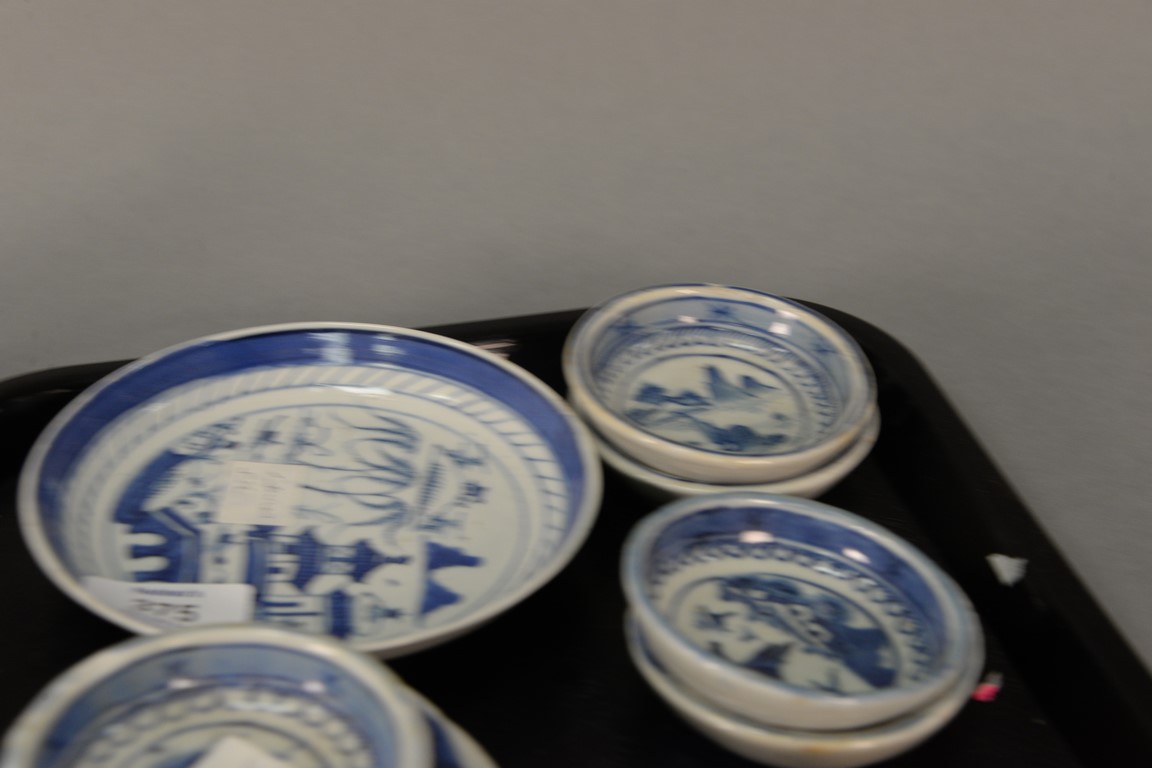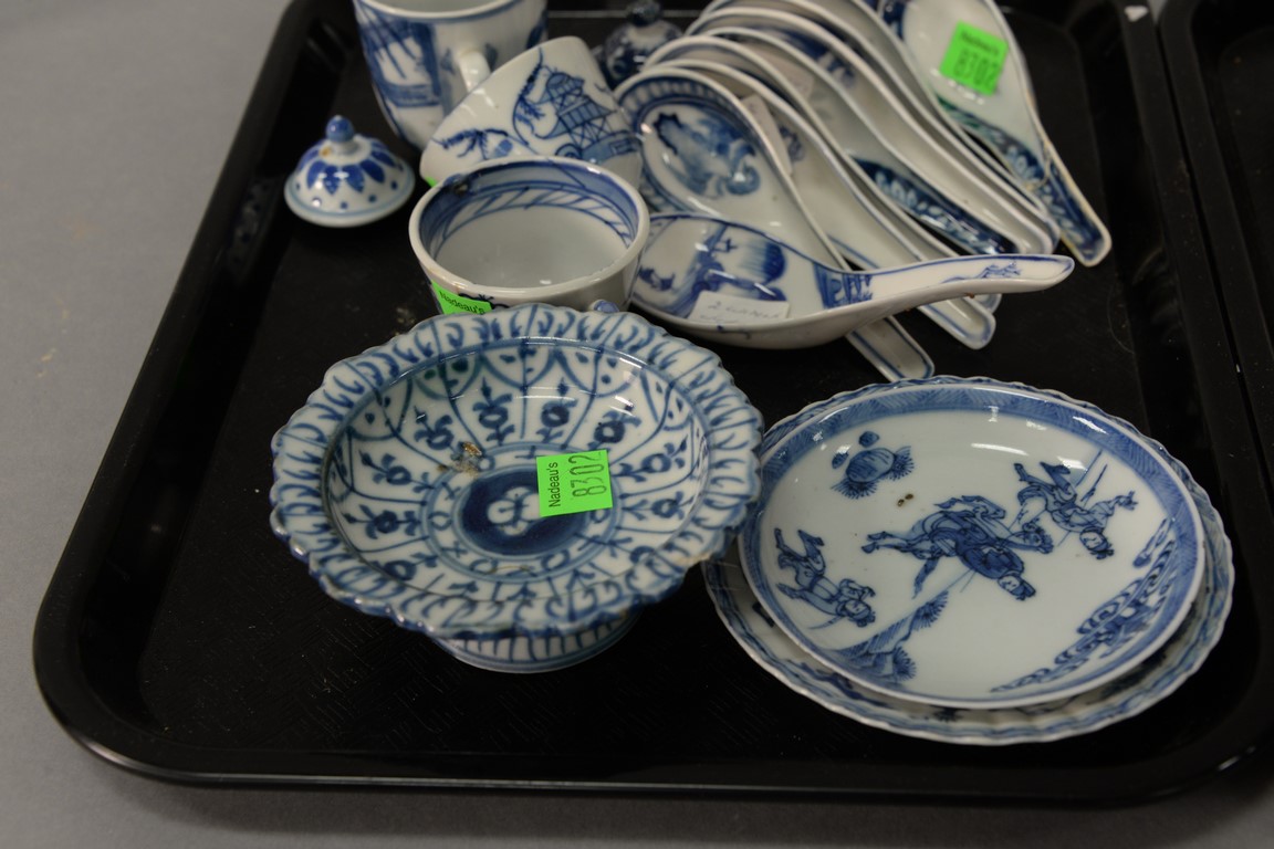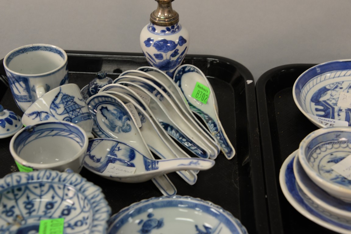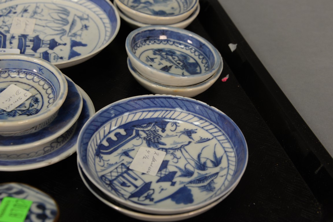 Lot 375: Tray lot of Chinese export blue and white Canton Nanking porcelain including cups and saucers, soup spoons, small dishes, small vase…