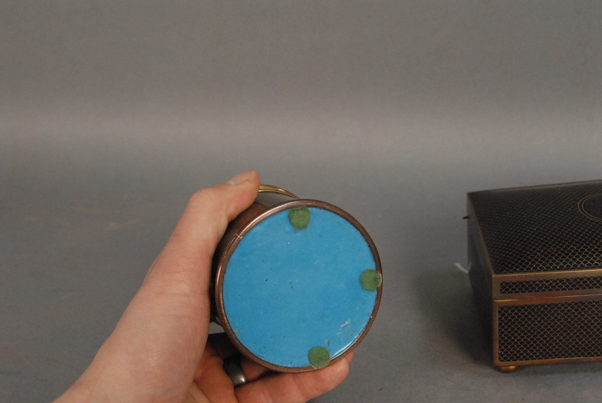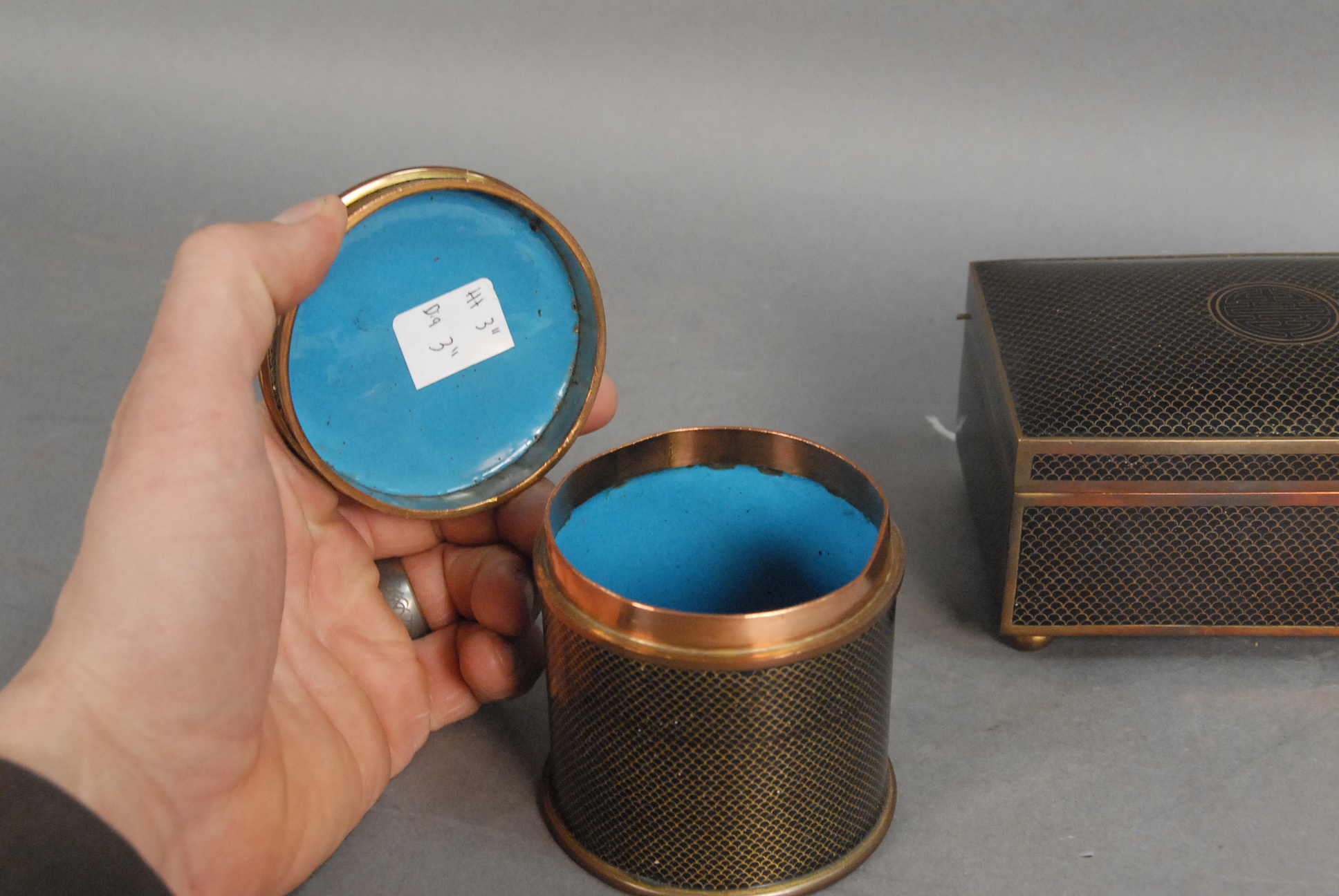 Two black and gold cloisonn dresser pieces to include a small round box, ht 3 dia 3, and a small rectangle footed box, ht 2 1/2 lg. 5 1/4 dp 3 1/2.