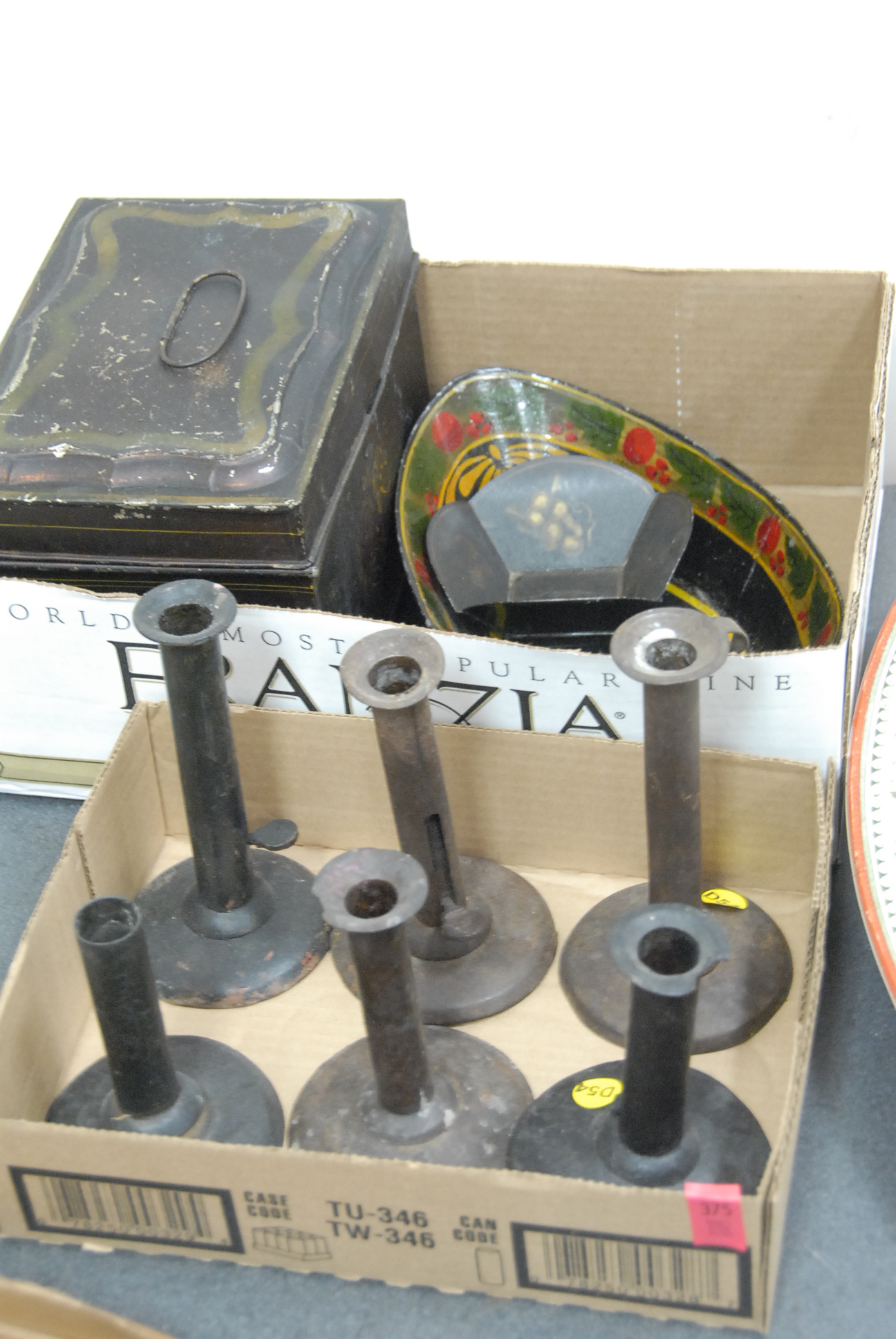 Two box lots of tole ware including a tray, hog scraper, push up candlesticks, a box