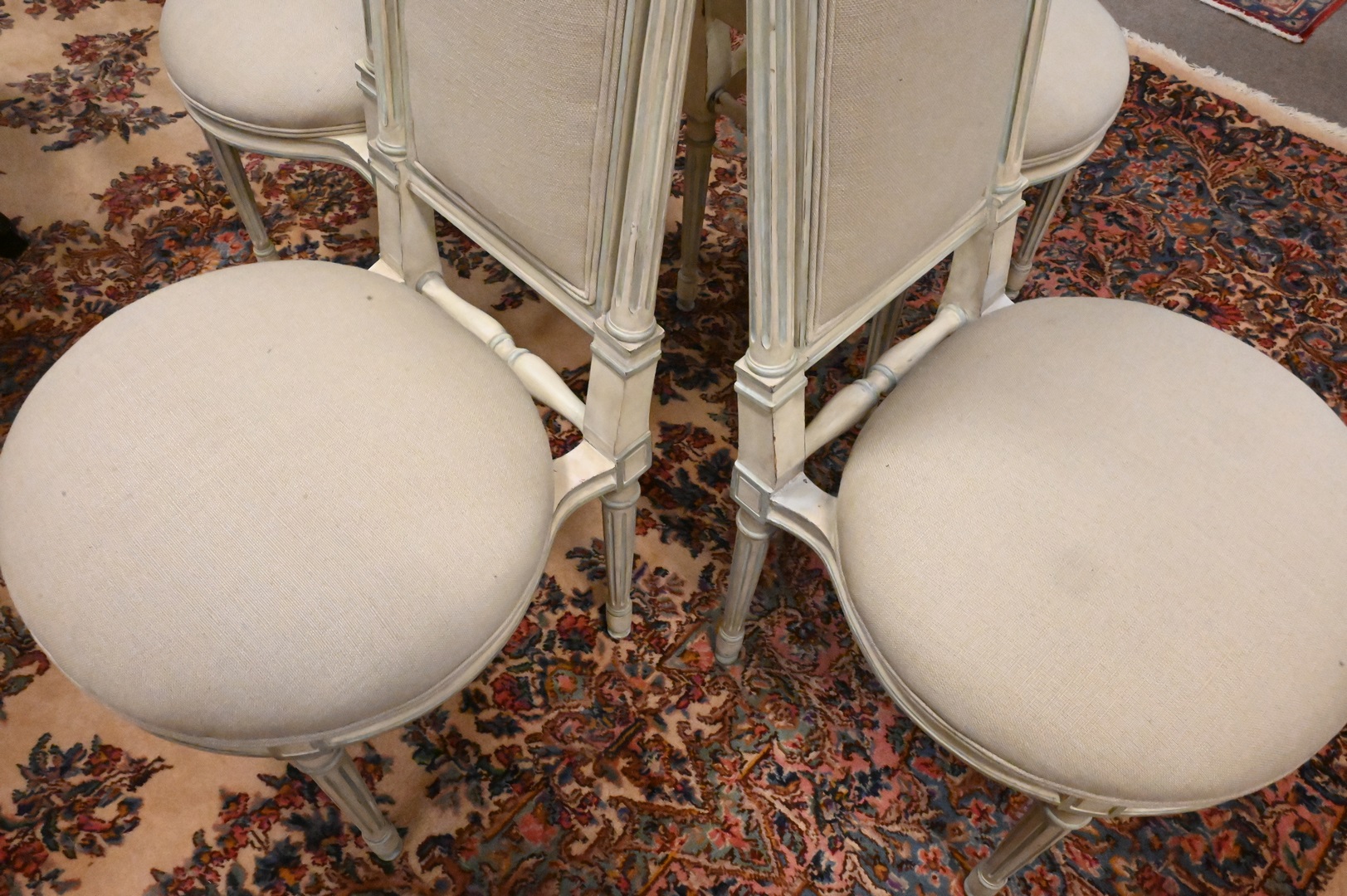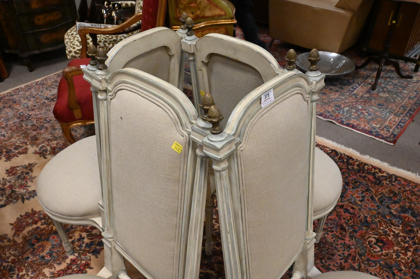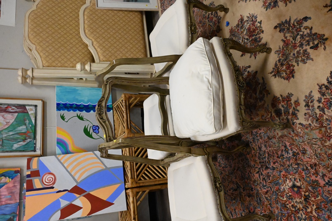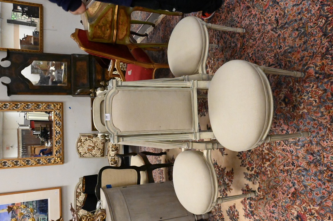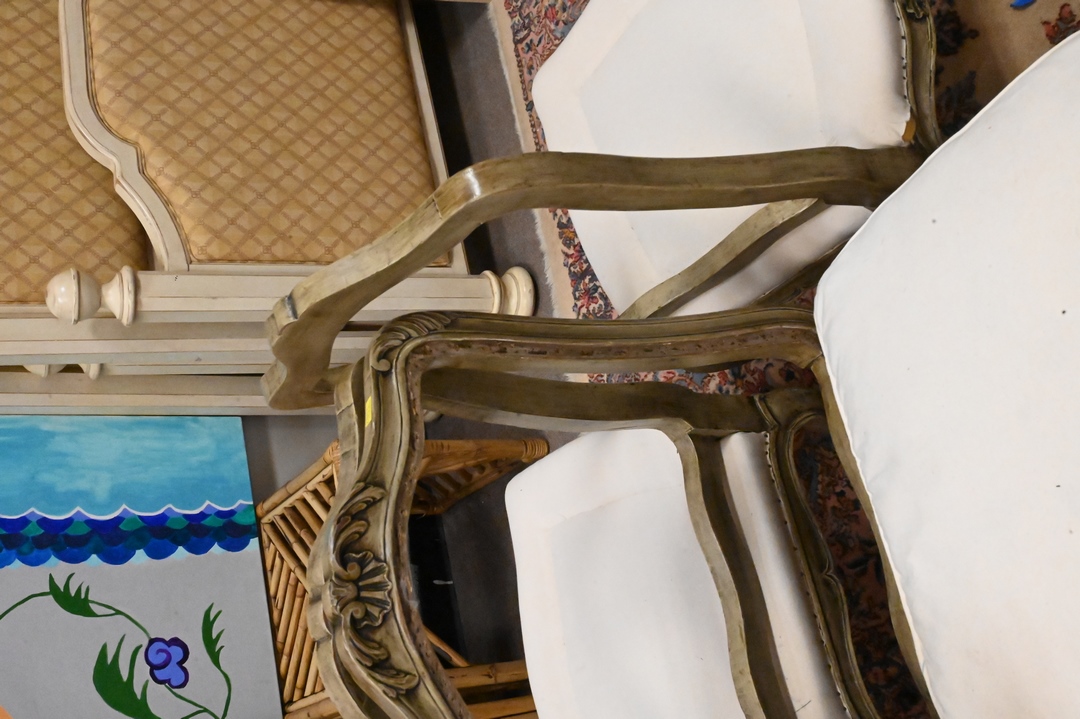 Two Sets of French Chairs, to include one set in Louis XVI form, having high backs; the other Louis XV style in need of upholstery and canning.