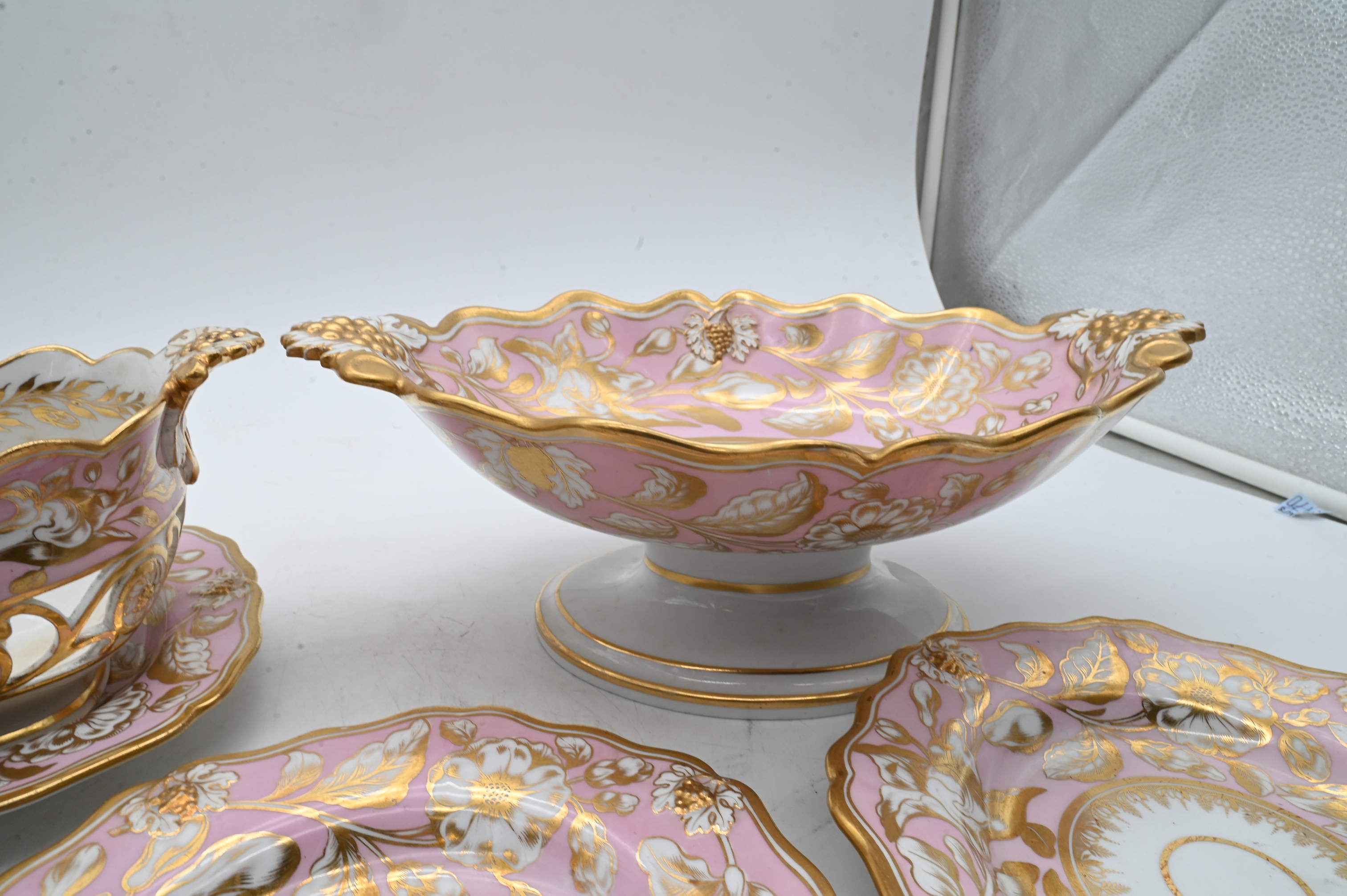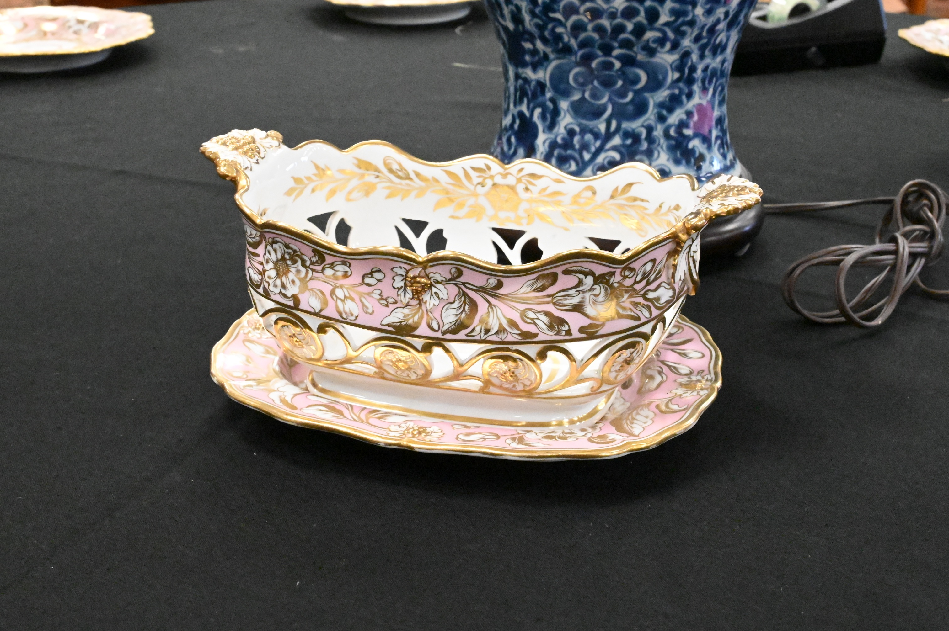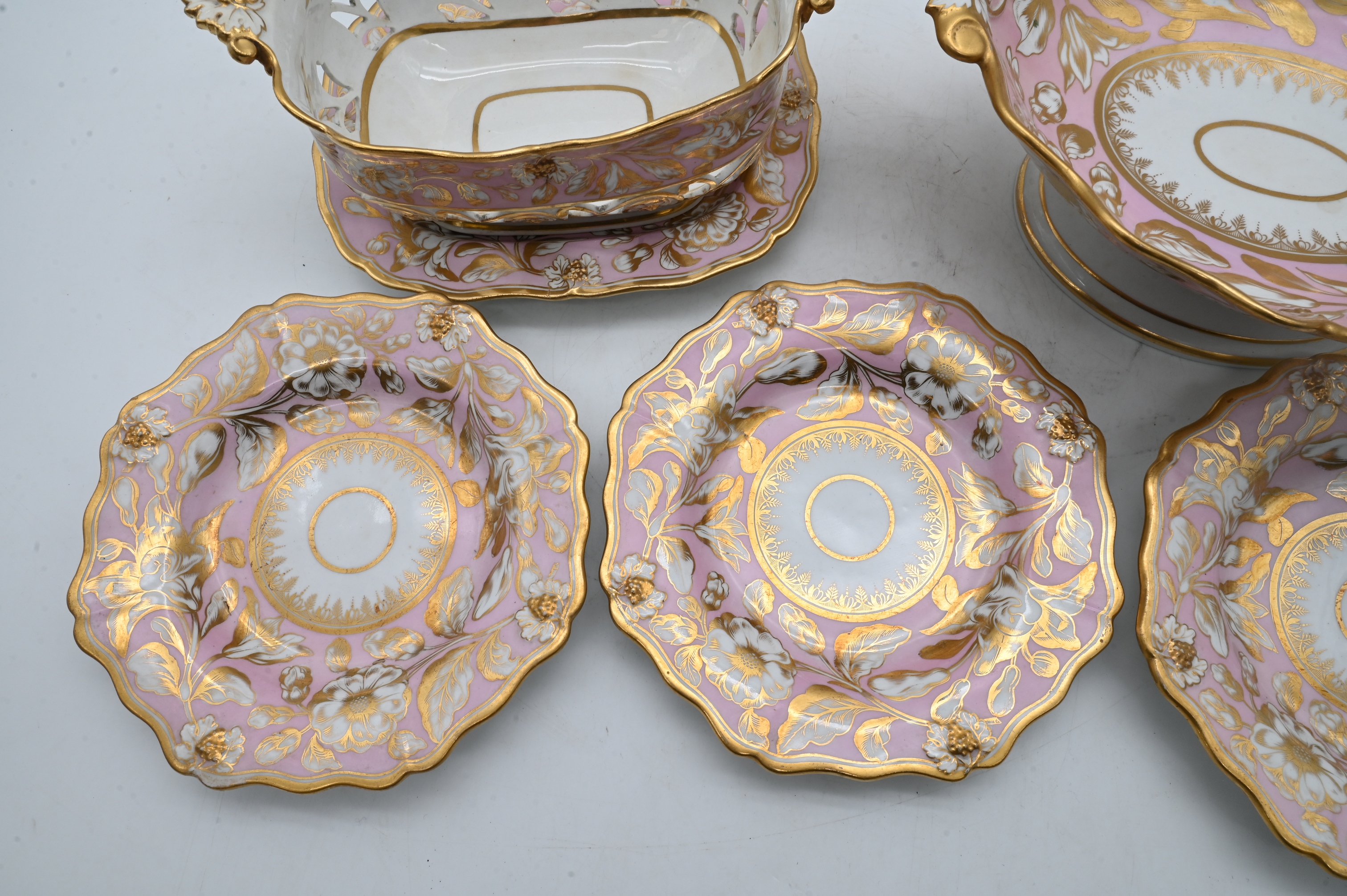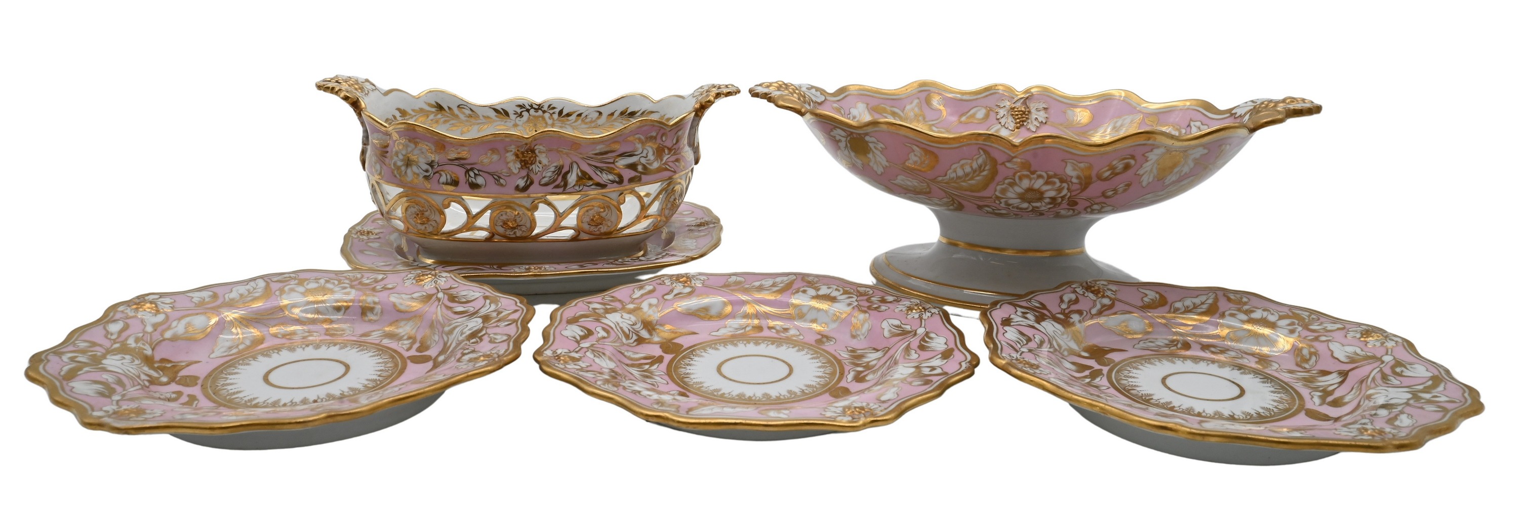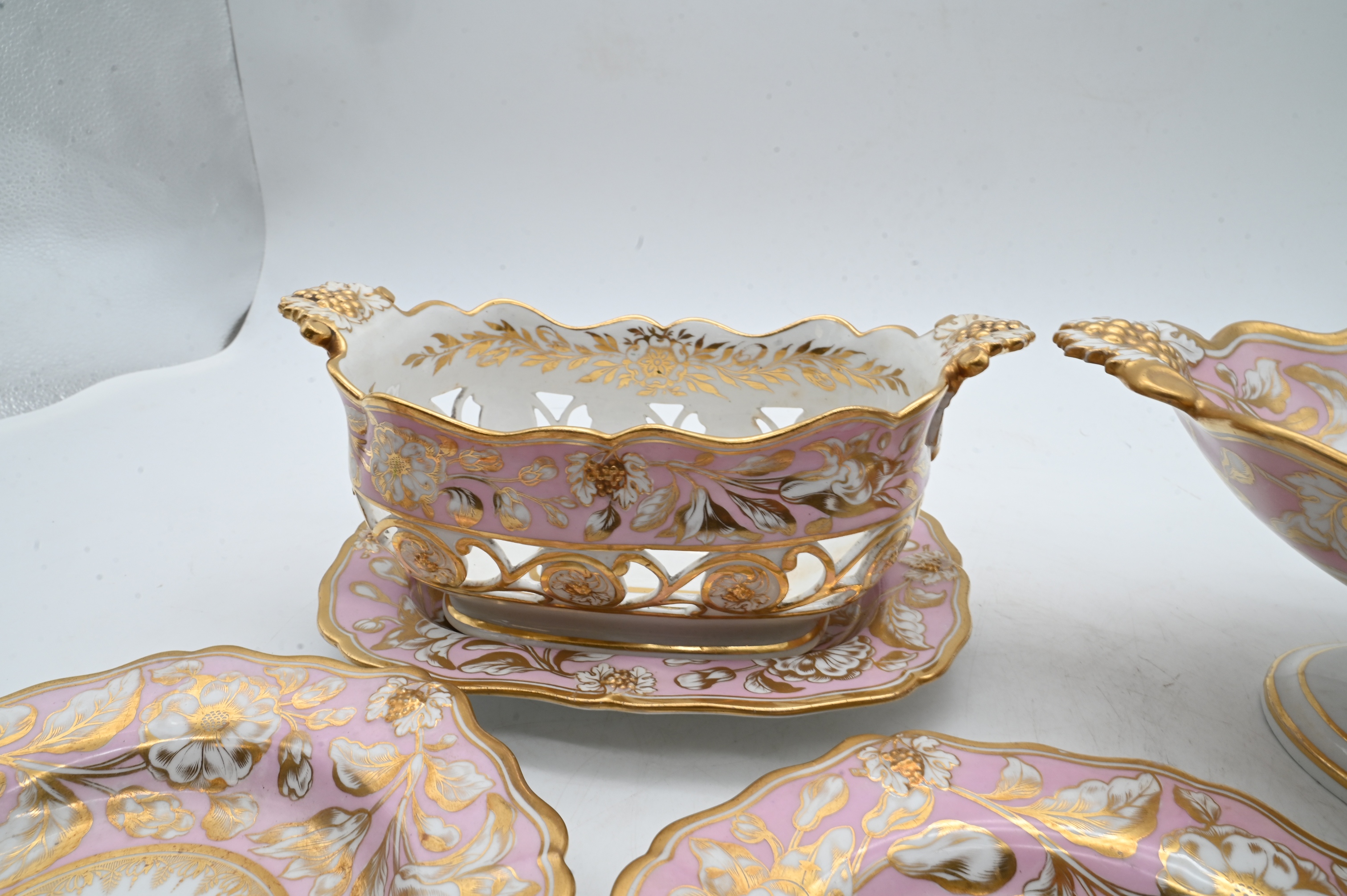 23 shallow bowls, 2 rectangular trays, 2 openwork baskets along with raised centerpiece compote, early 19th century