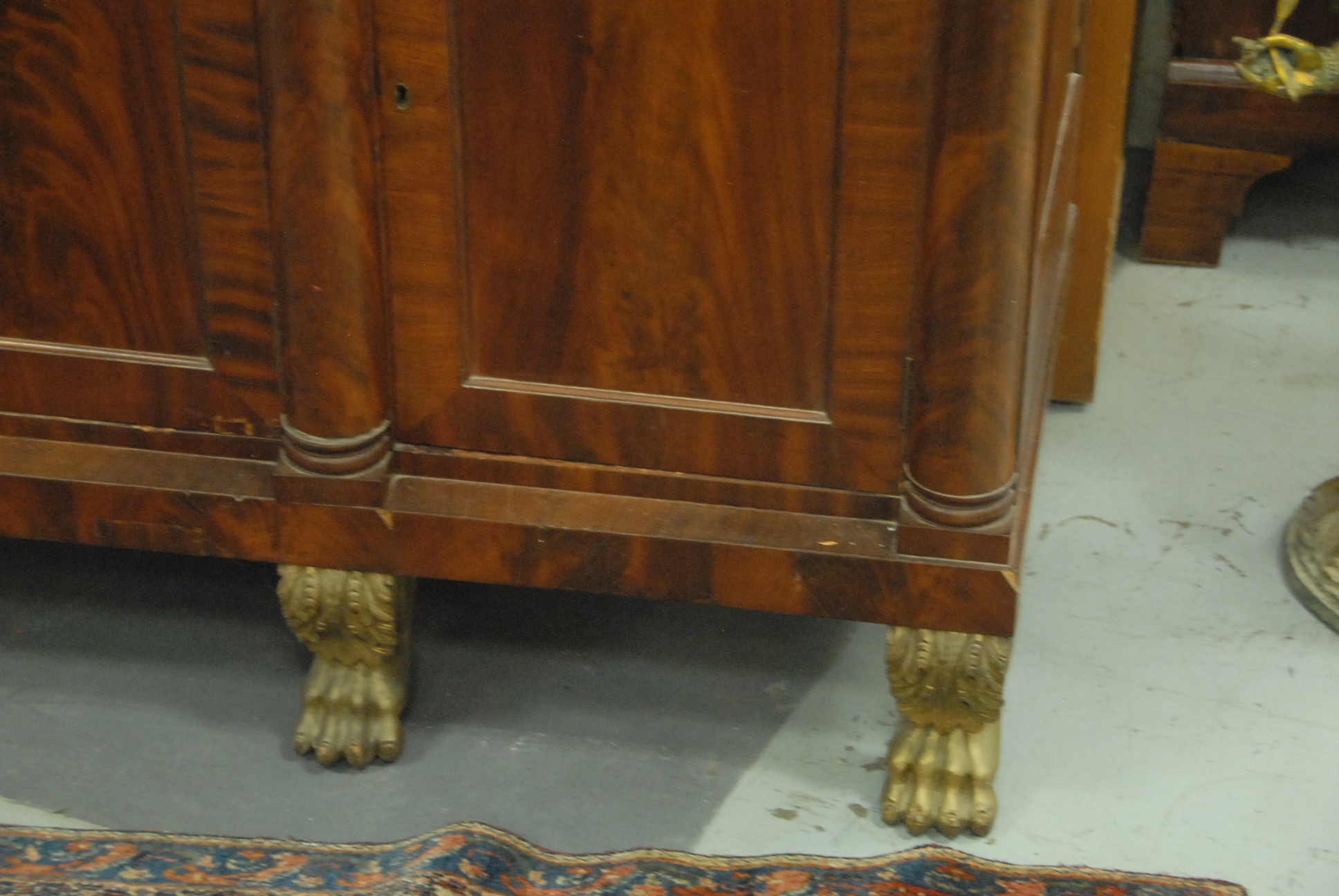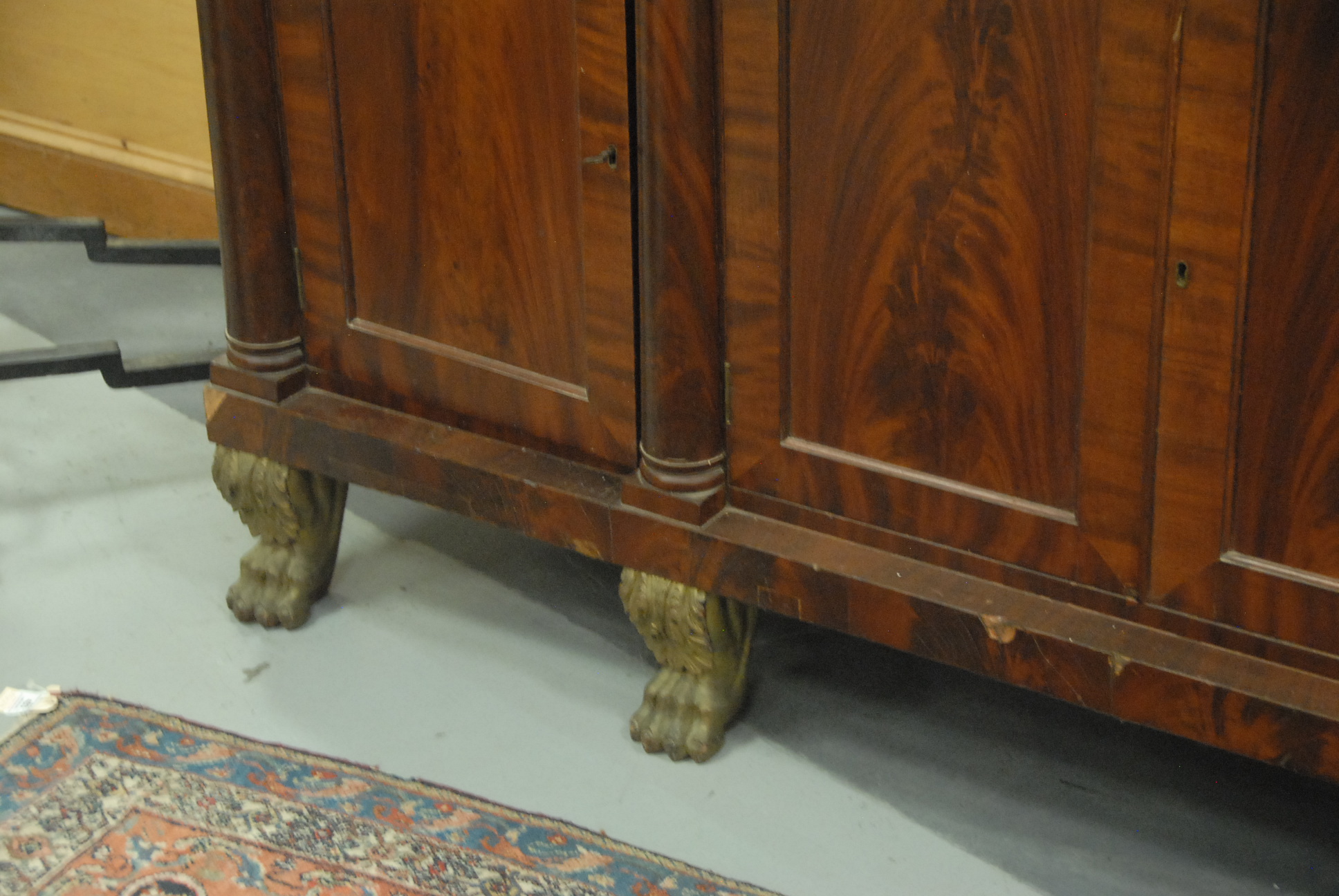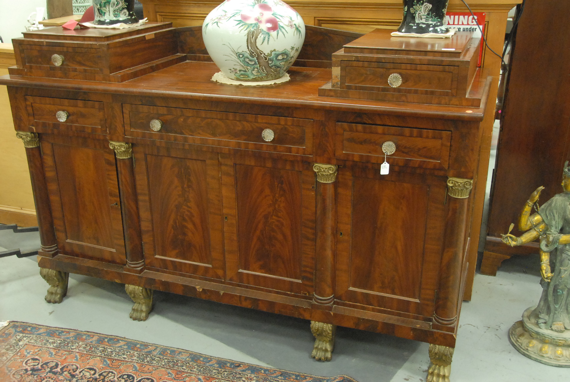 Lot 376: Empire mahogany sideboard having two small drawers over three drawers over four doors, case with columns having carved capitals and carved paw feet, top drawer with hand written paper label, circa 1830-1840. ht. 48 in. wd. 72 in. Prove