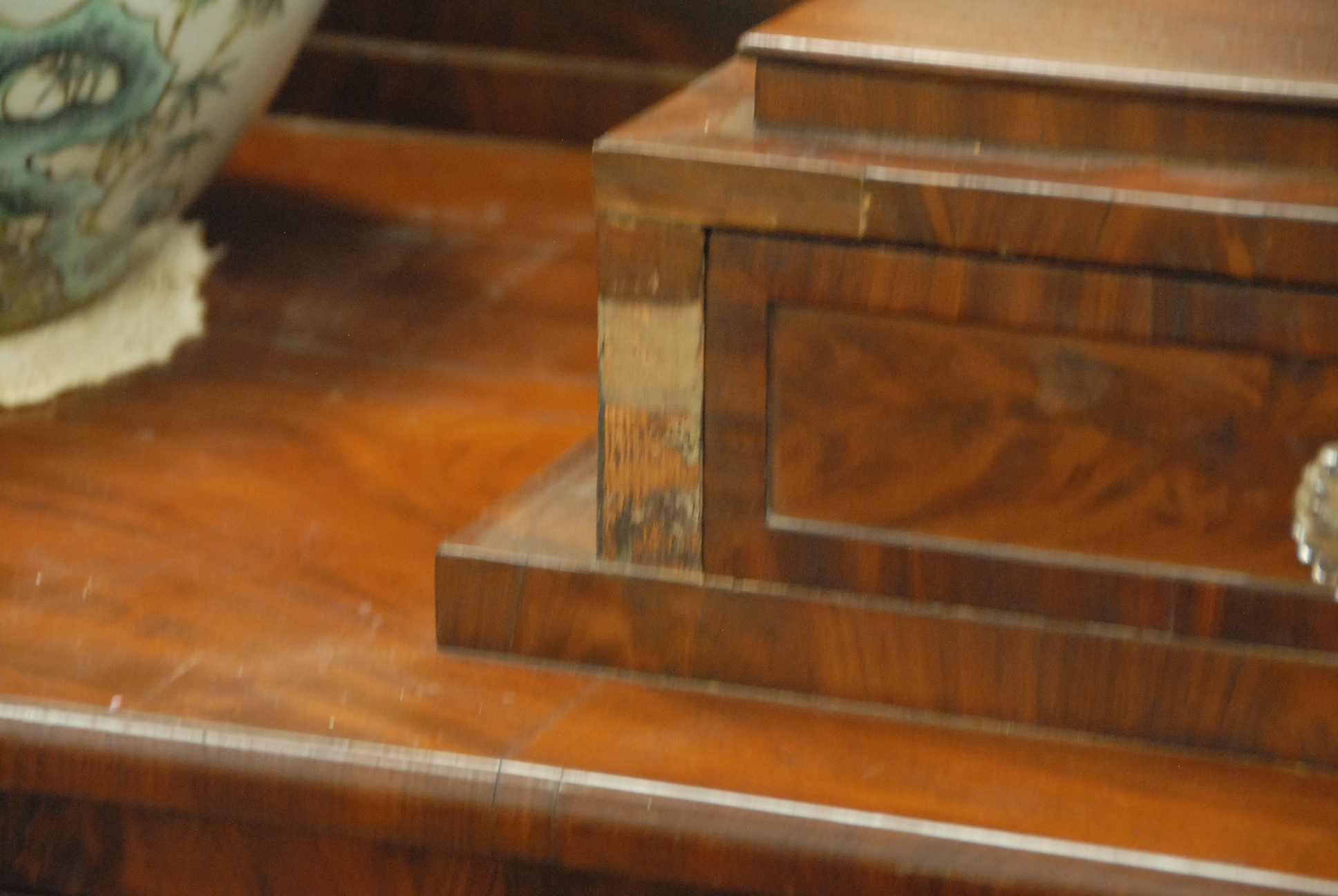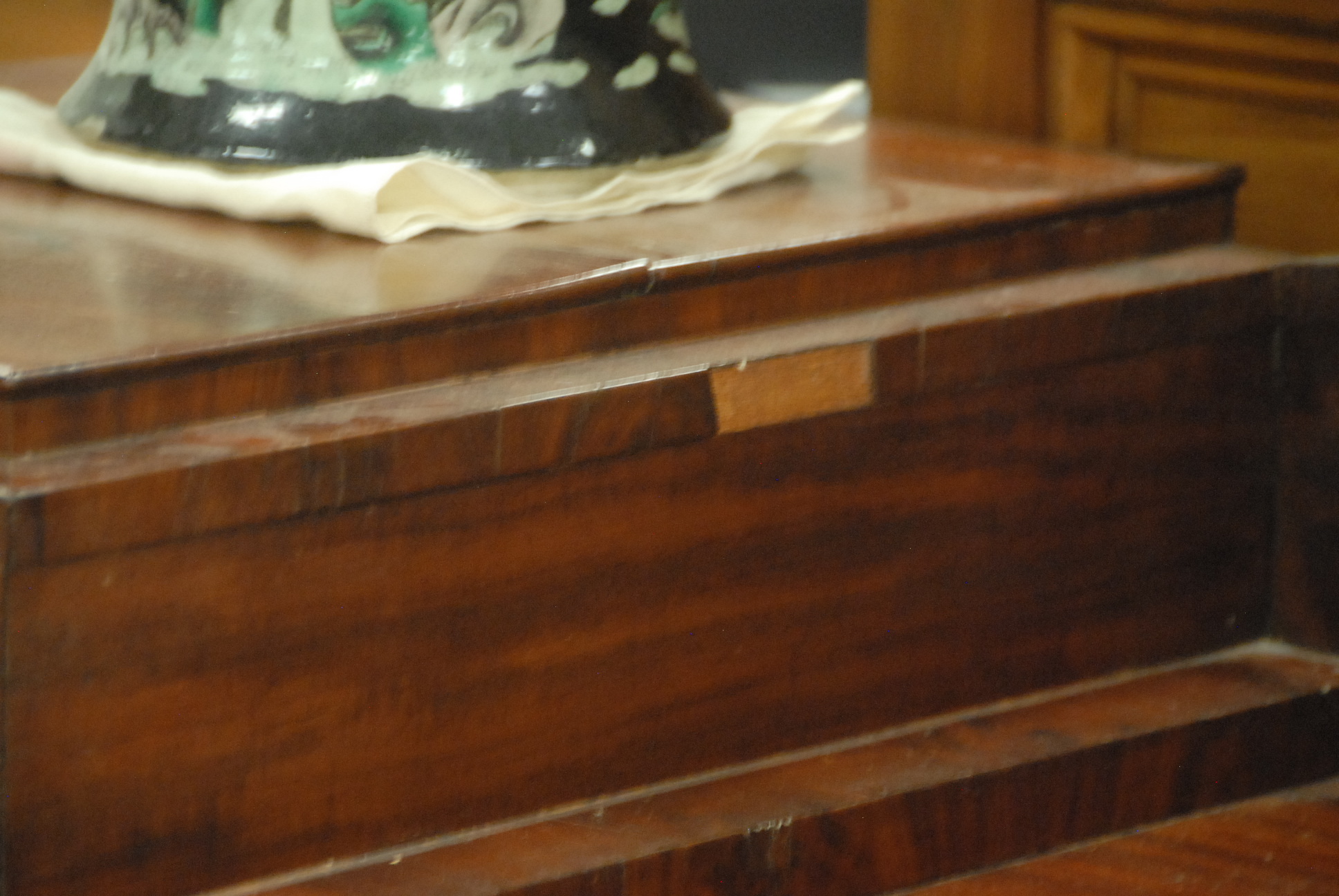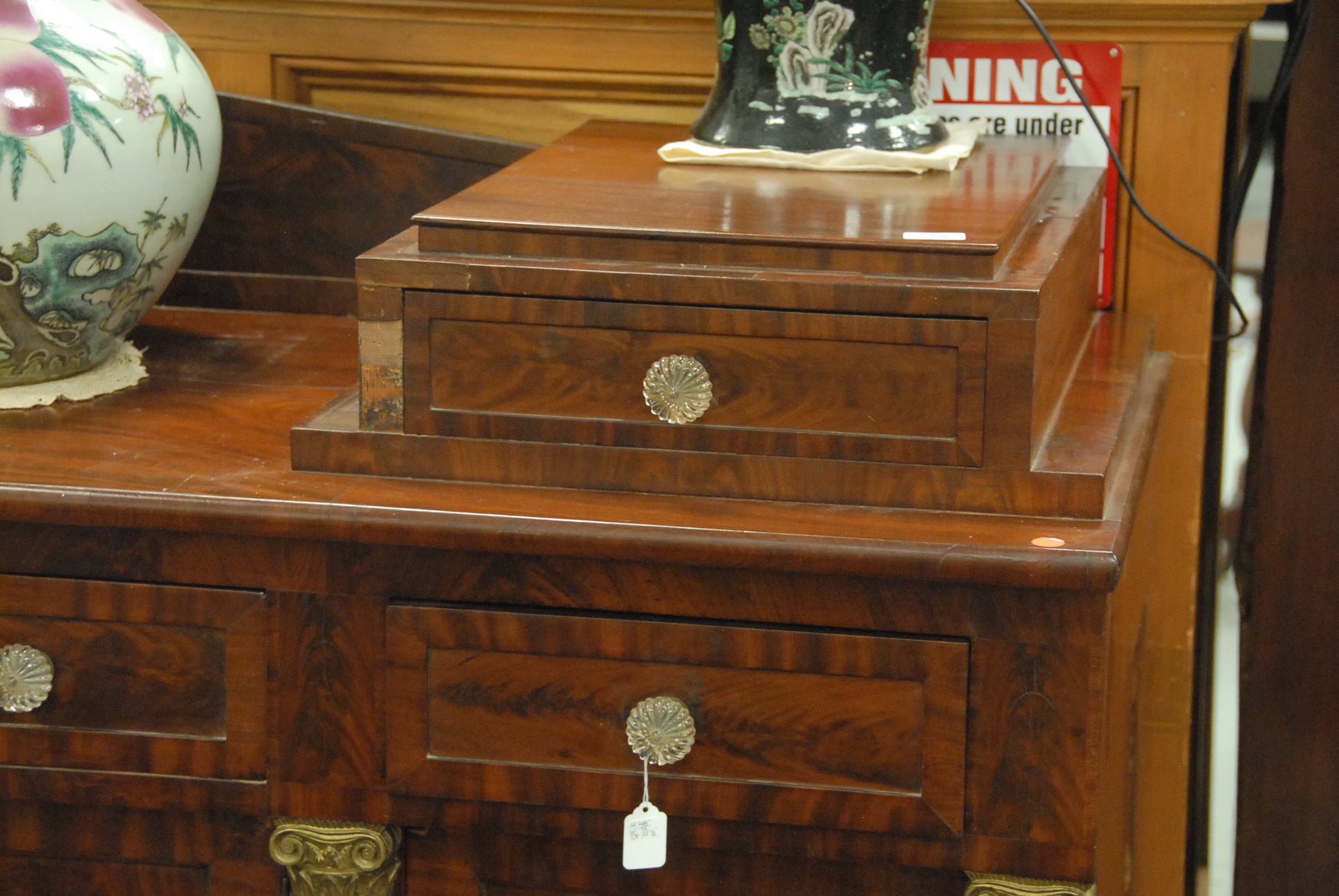 Lot 376: Empire mahogany sideboard having two small drawers over three drawers over four doors, case with columns having carved capitals and carved paw feet, top drawer with hand written paper label, circa 1830-1840. ht. 48 in. wd. 72 in. Prove
