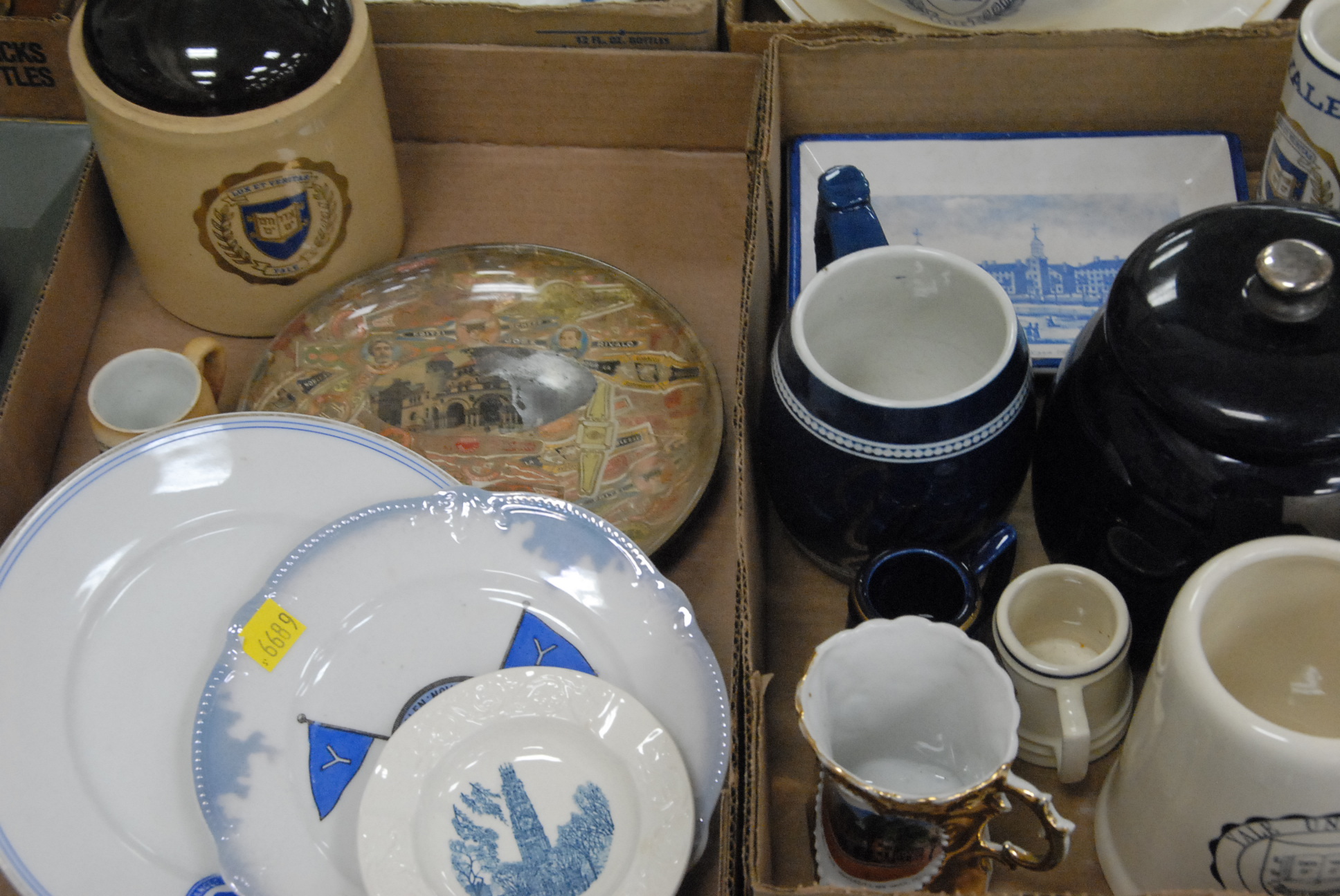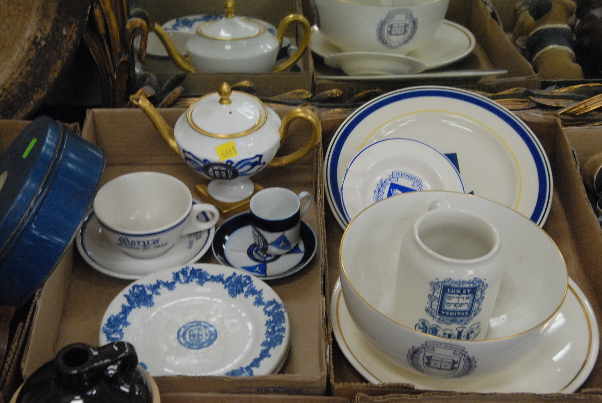Lot 376: Four box lots of Yale chinaware cups, mugs, plates, saucers, bowls, teapot, crock, dishes, etc.