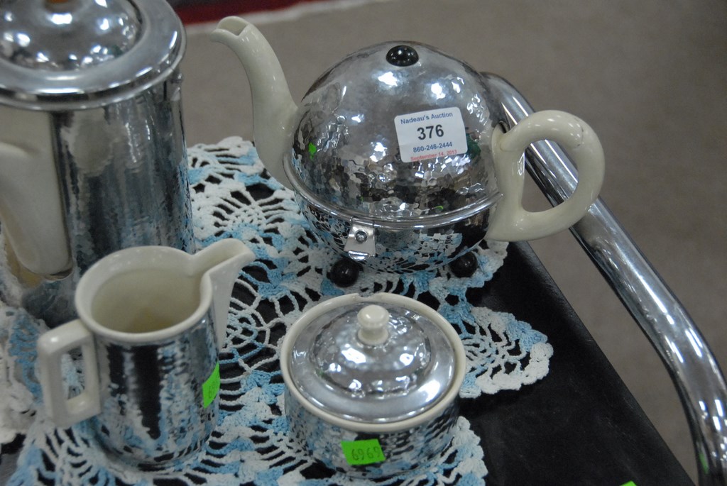 Four piece Mid-Century tea set along with Art Nouveau bronze figure of a woman.