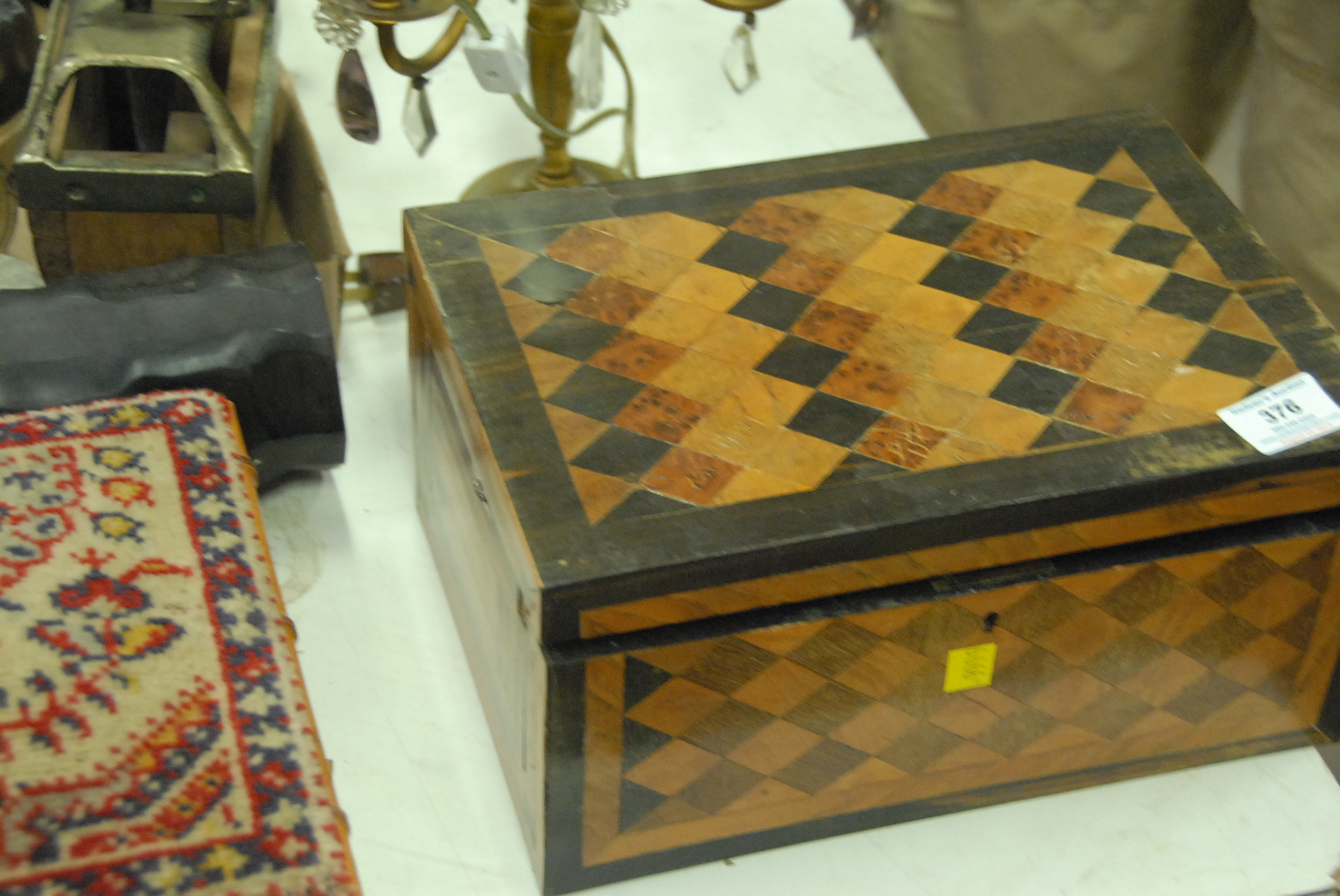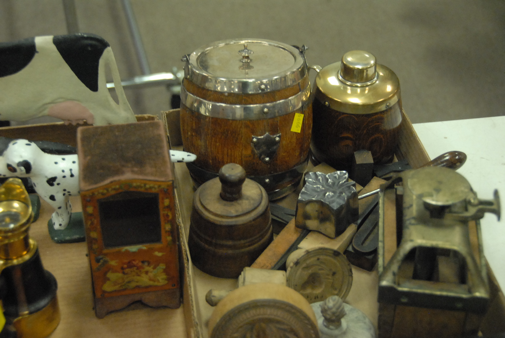 Group lot to include iron door stops, two small stools, inlaid sewing box, etc.