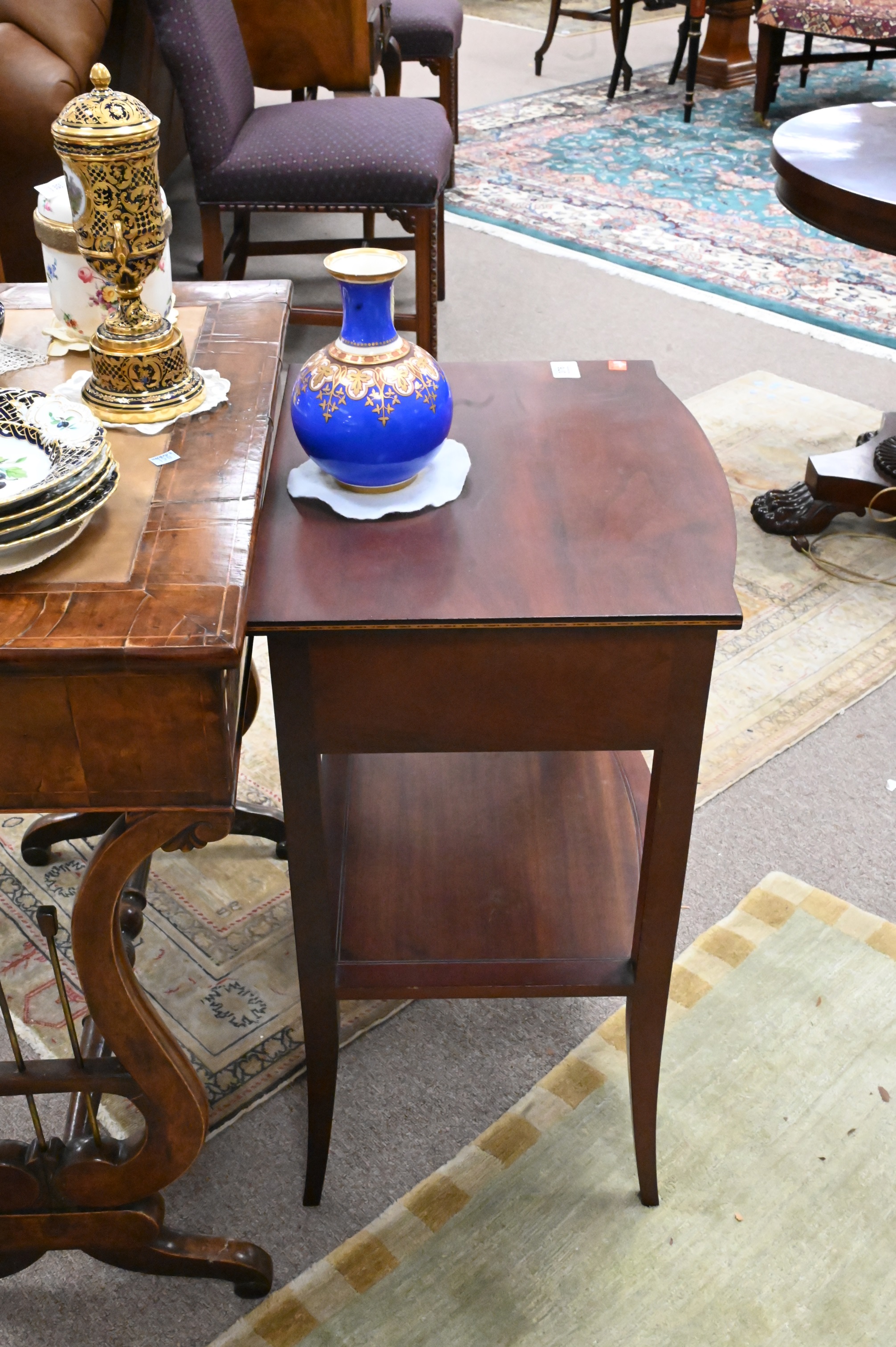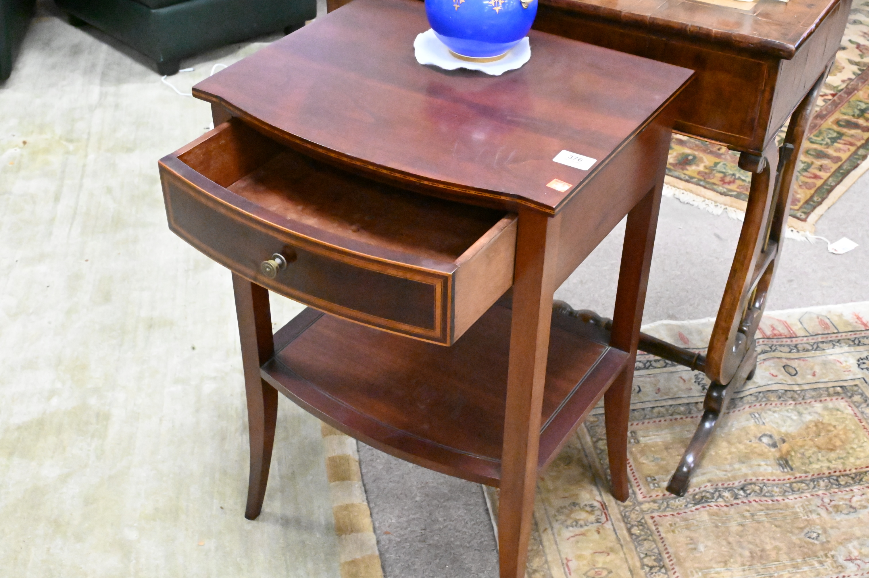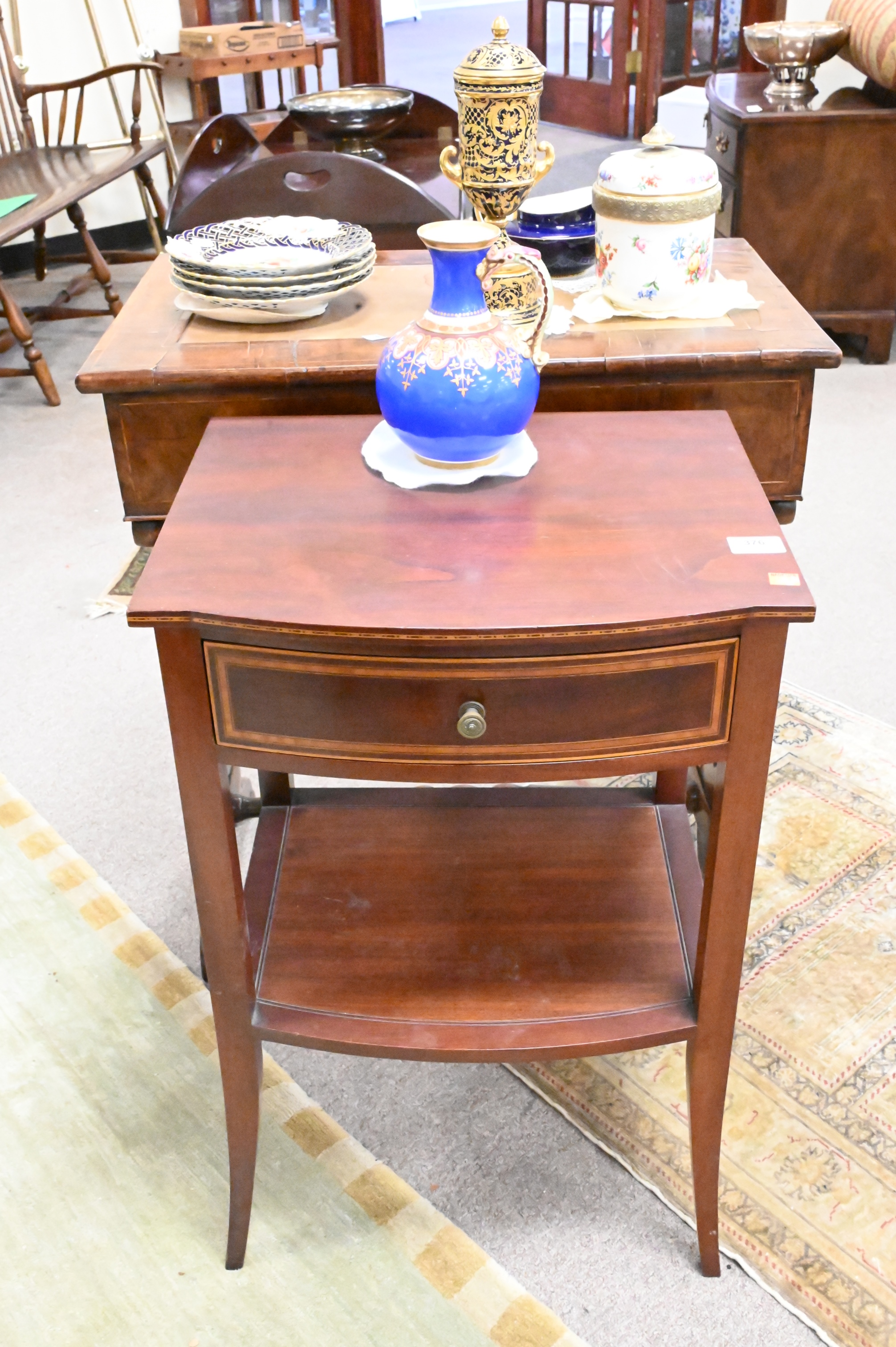Margolis Custom Mahogany One Drawer Inlaid Stand, having Nathan Margolis branding to underside, height 28 inches, top 15″ x 18″.