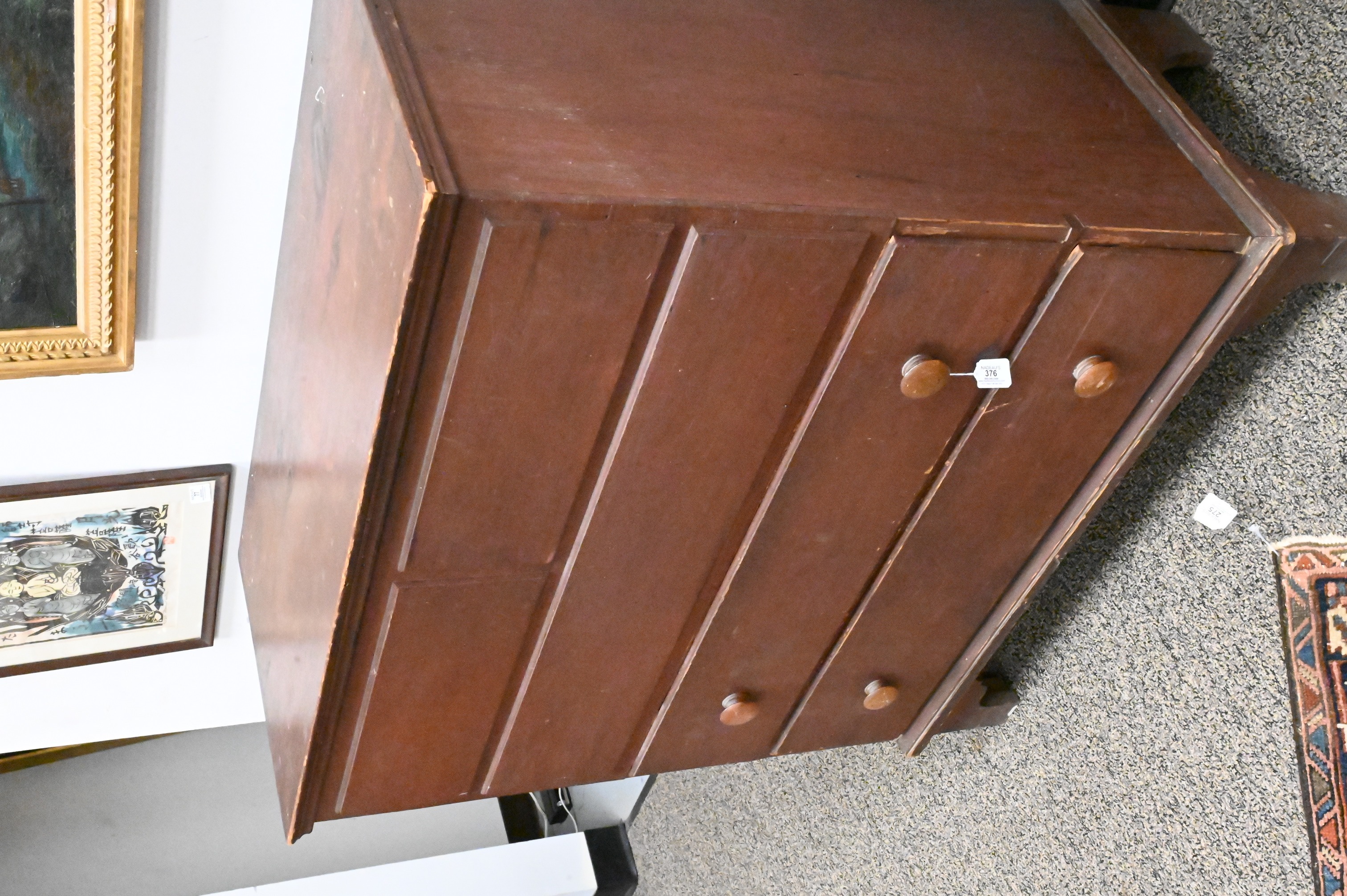 A rectangular lift-top blanket chest in red/ brown painted surface, with dovetailed corners and iron lock.