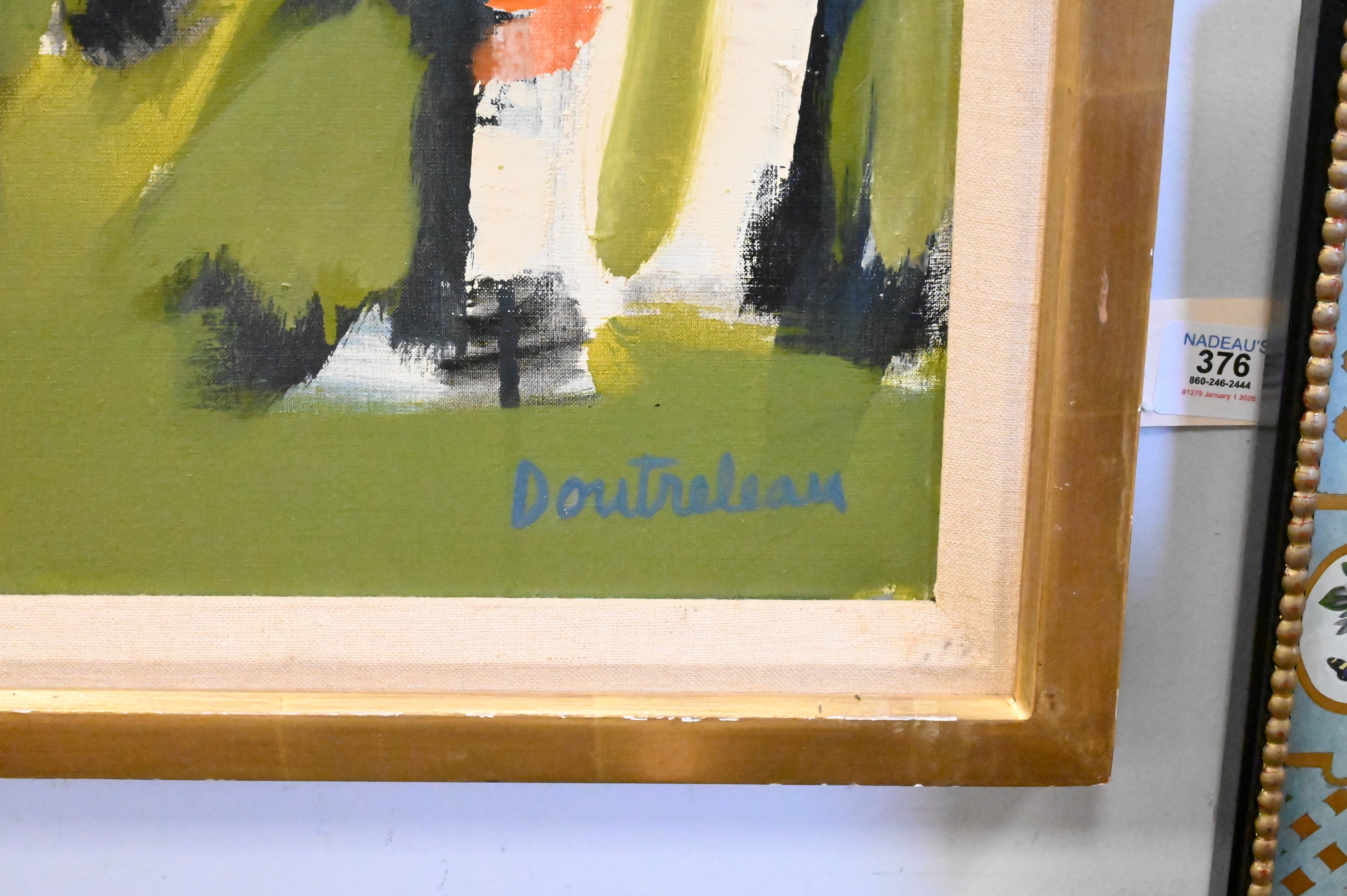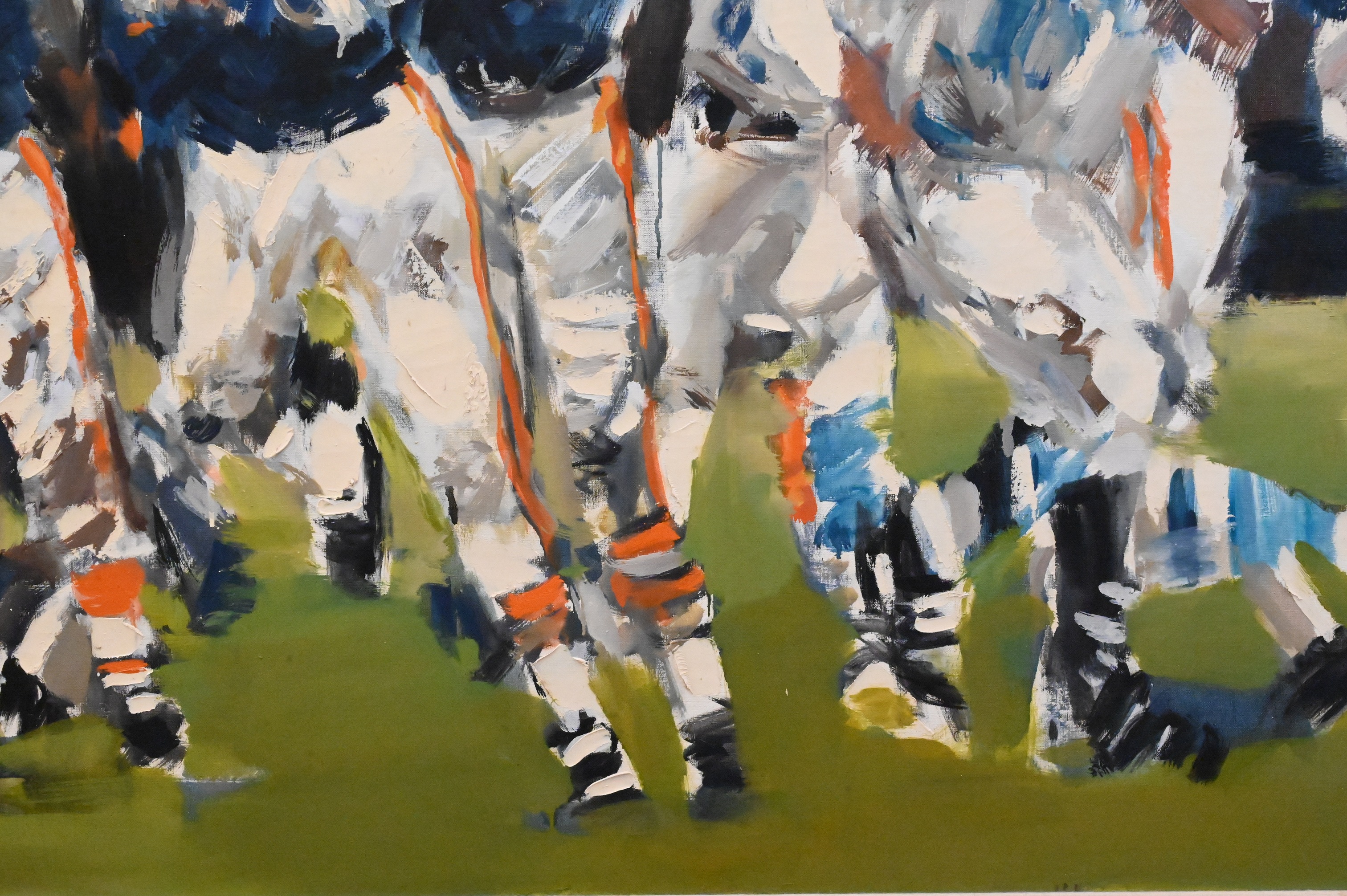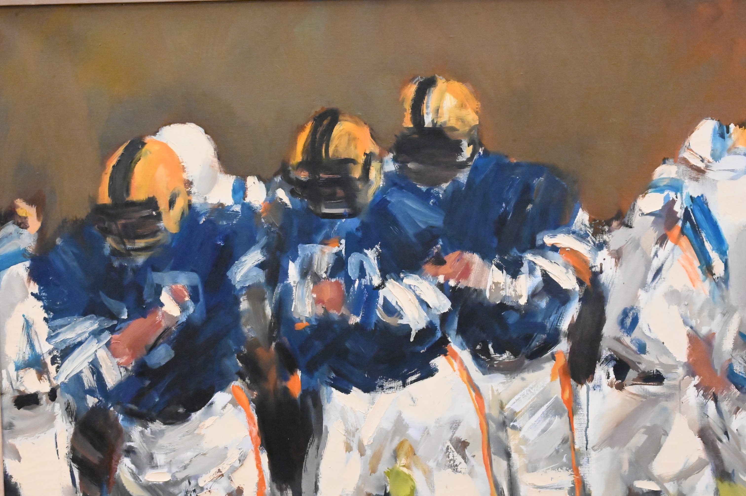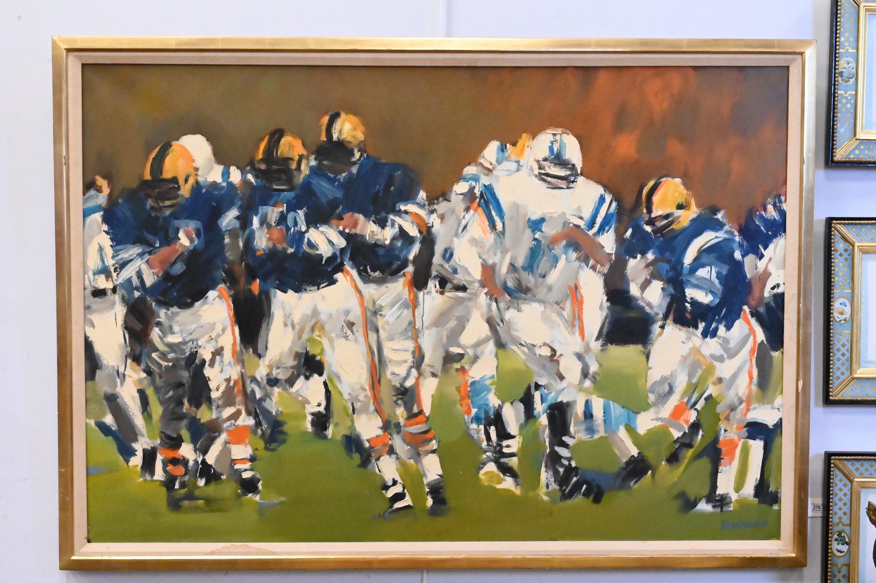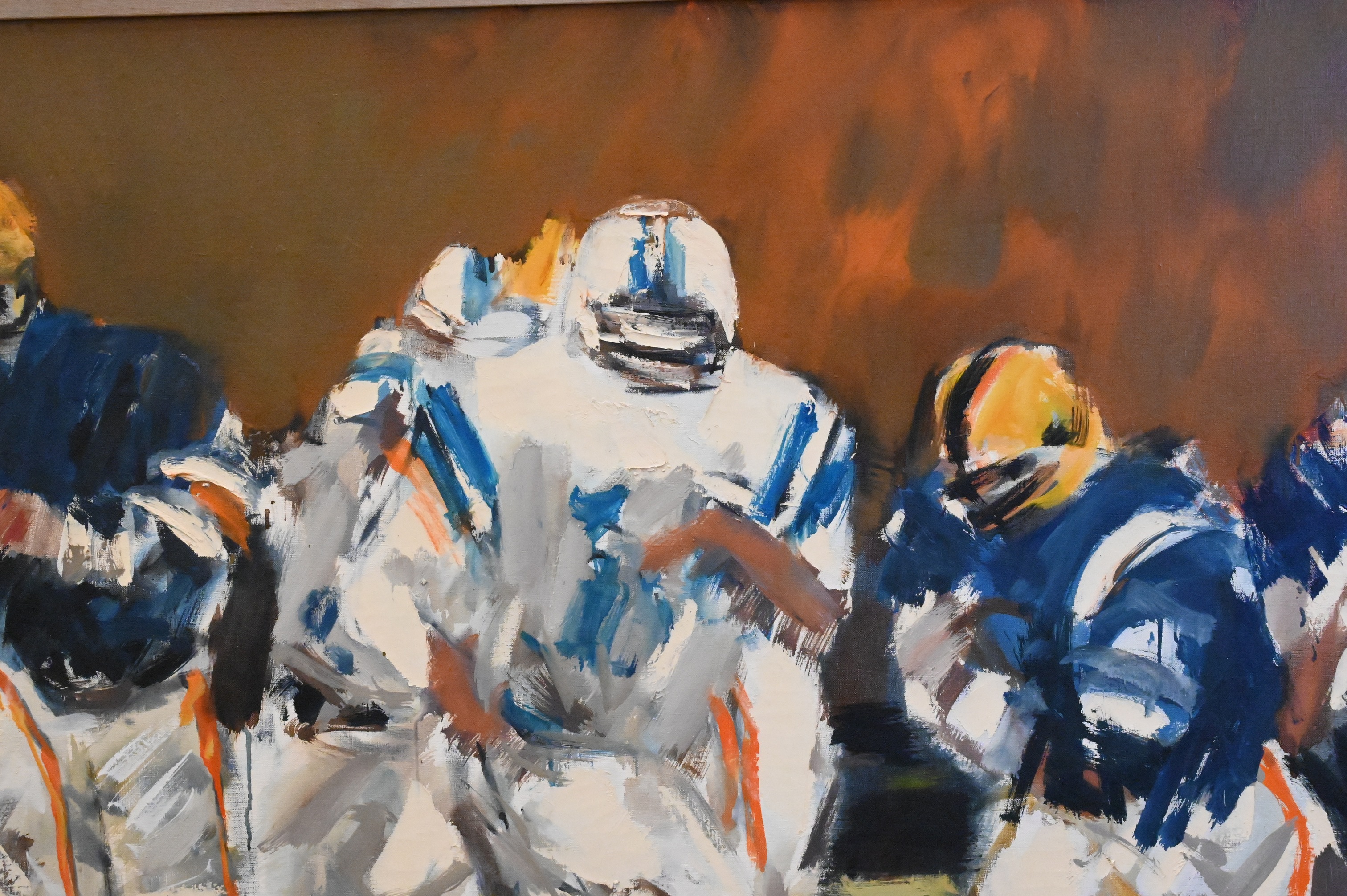 Dynamic large-scale football scene rendered in Doutreleau’s signature bold, gestural style; the composition captures the explosive movement of the offensive and defensive lines at the moment of impact, built up with thick impasto and sweeping palette-knife strokes in blue, white, ochre, and green, a powerful example of the artist’s celebrated sports imagery