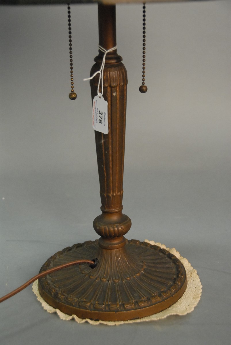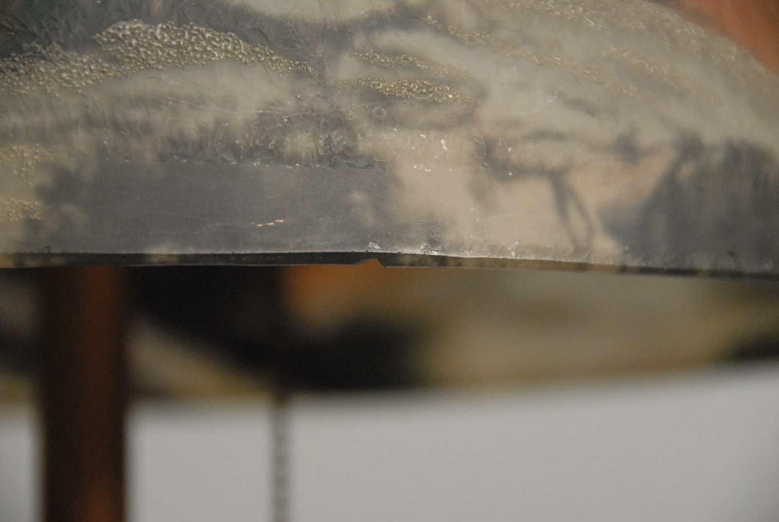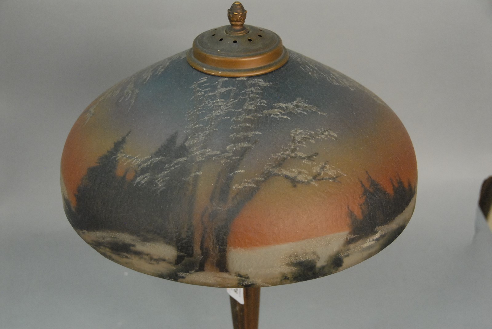 Lot 376: Pittsburgh reverse and obverse painted table lamp, painted snowscape with sunset sky and obverse painted glistening trees, chipped ice glass finish on bronze two socket base marked PLBG & Co. ht. 23 in. shade dia. 14 in.