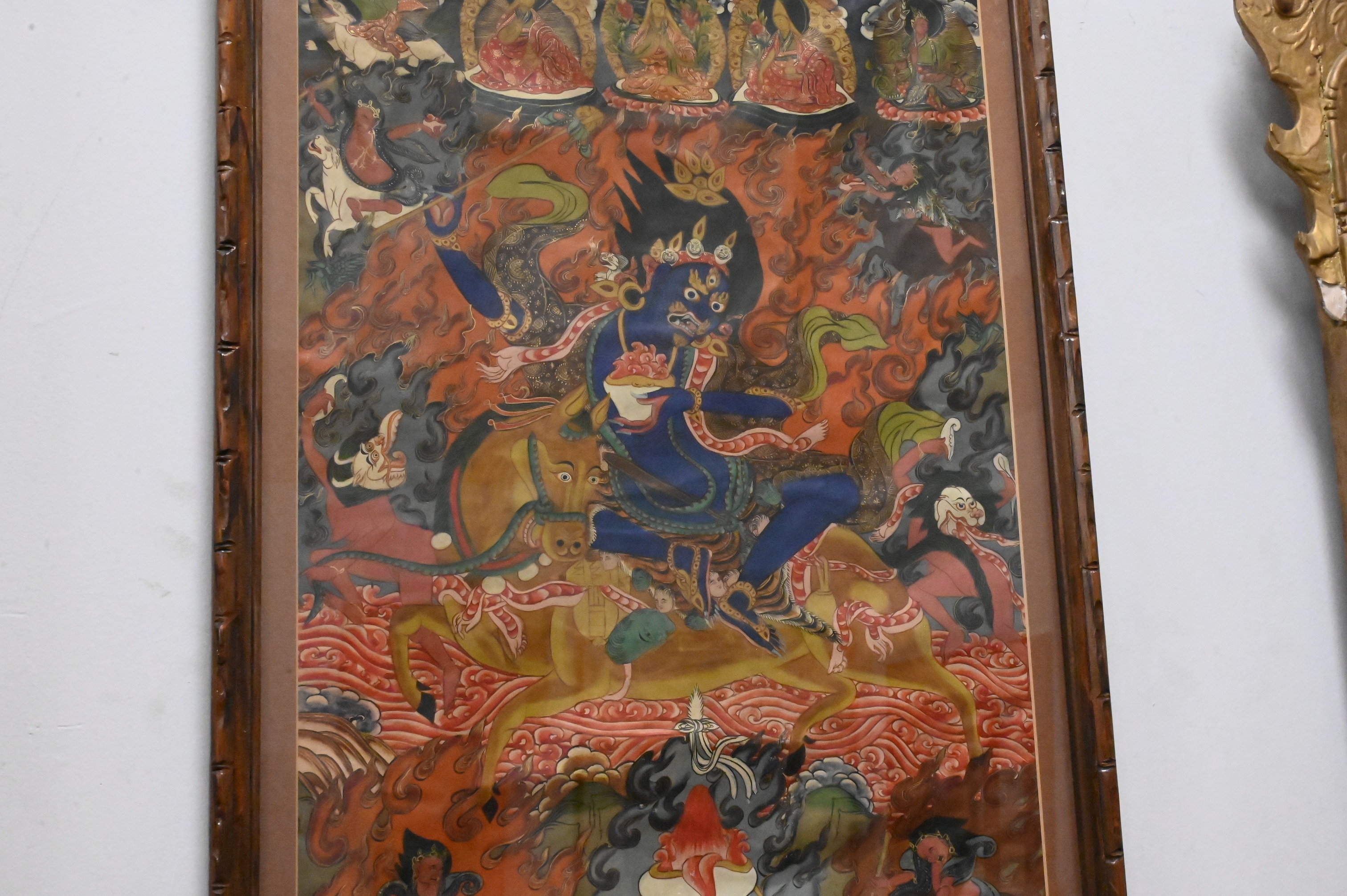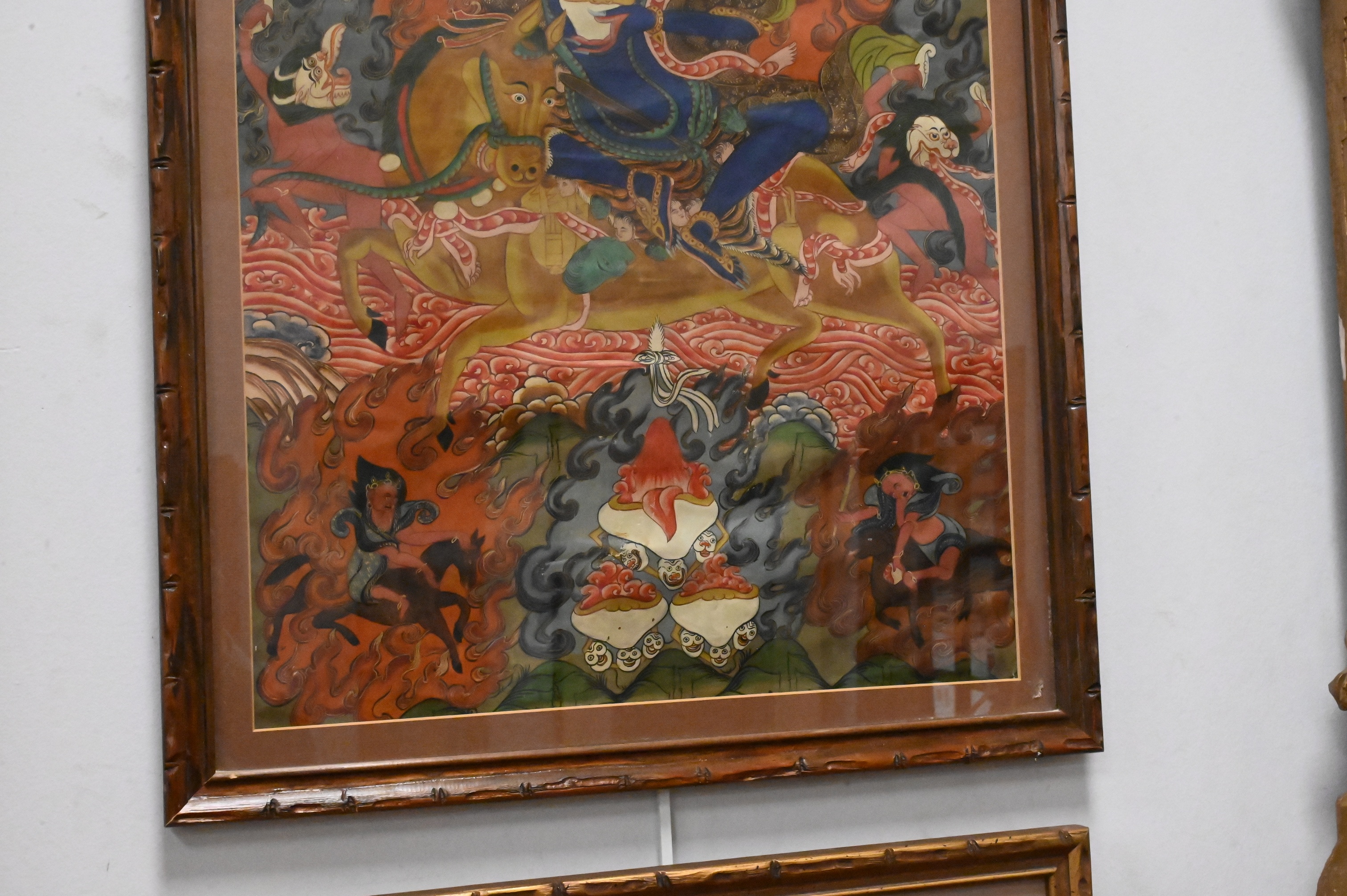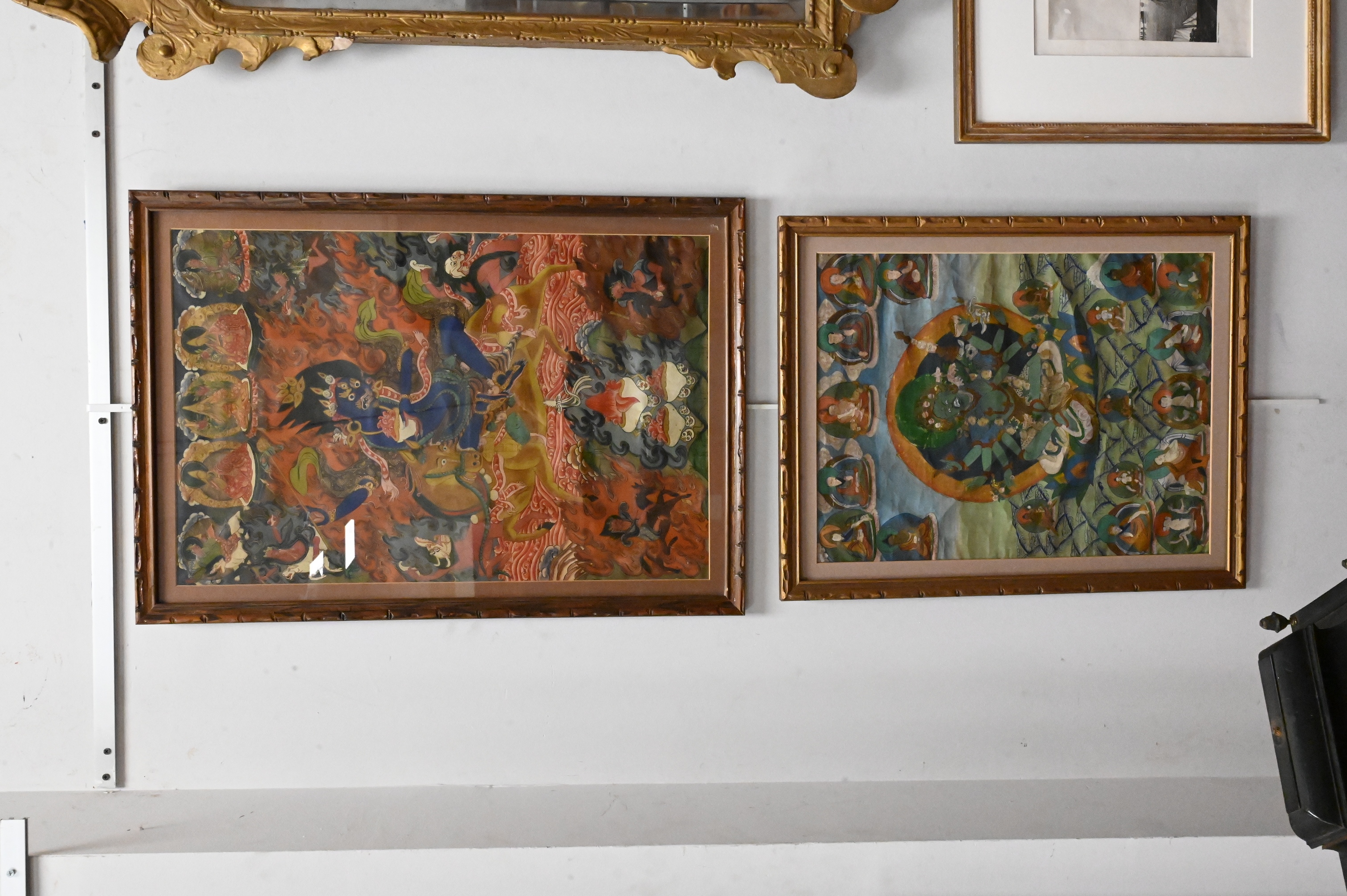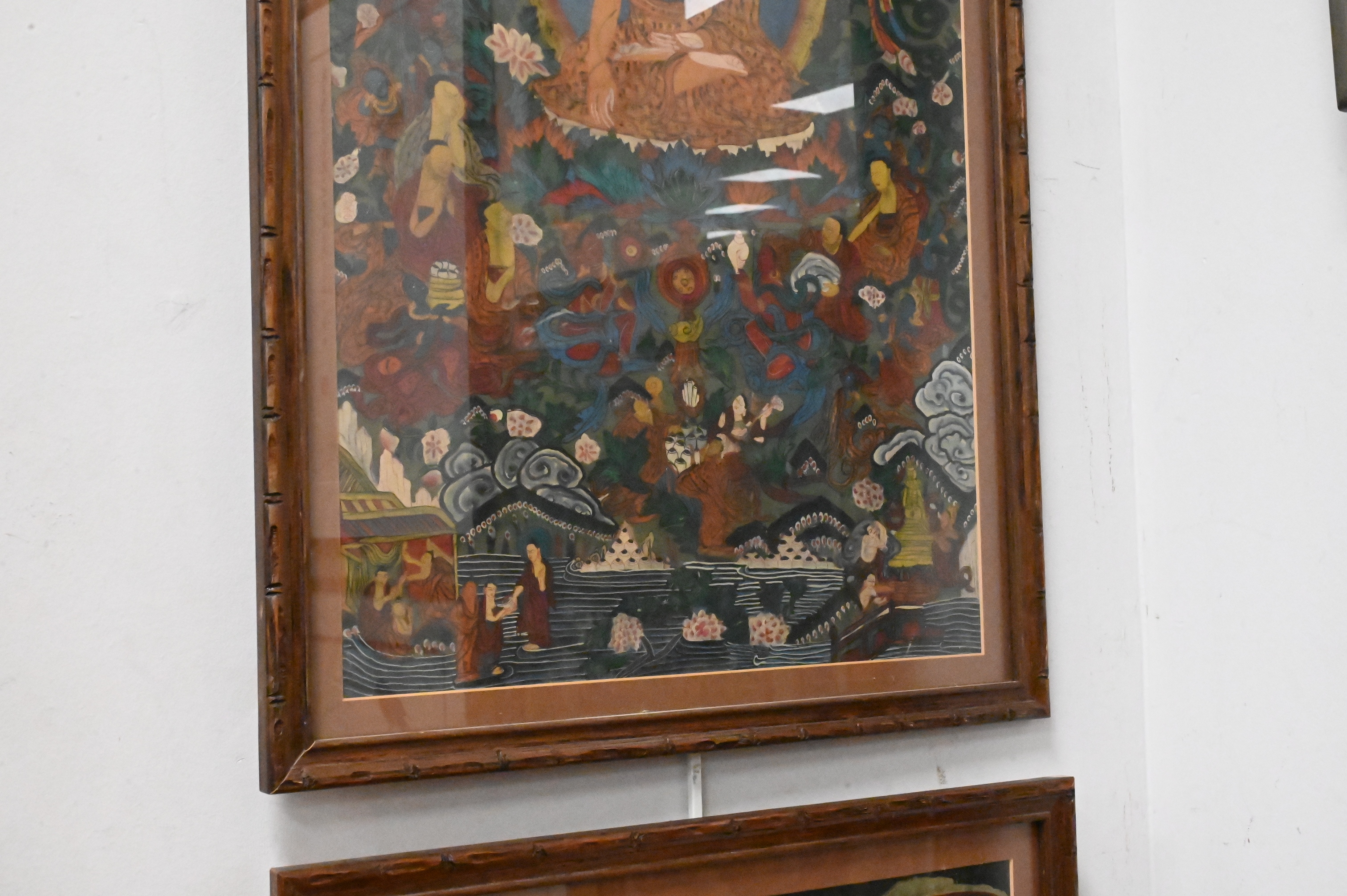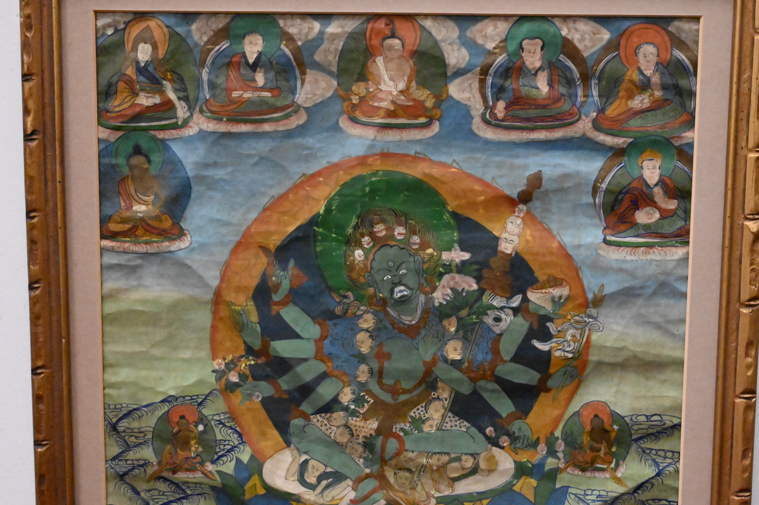 to include wheel Mandala, green eight armed deities, Buddhas on lotus leaves, along with various other Eastern deities and mythologies, etcetera
