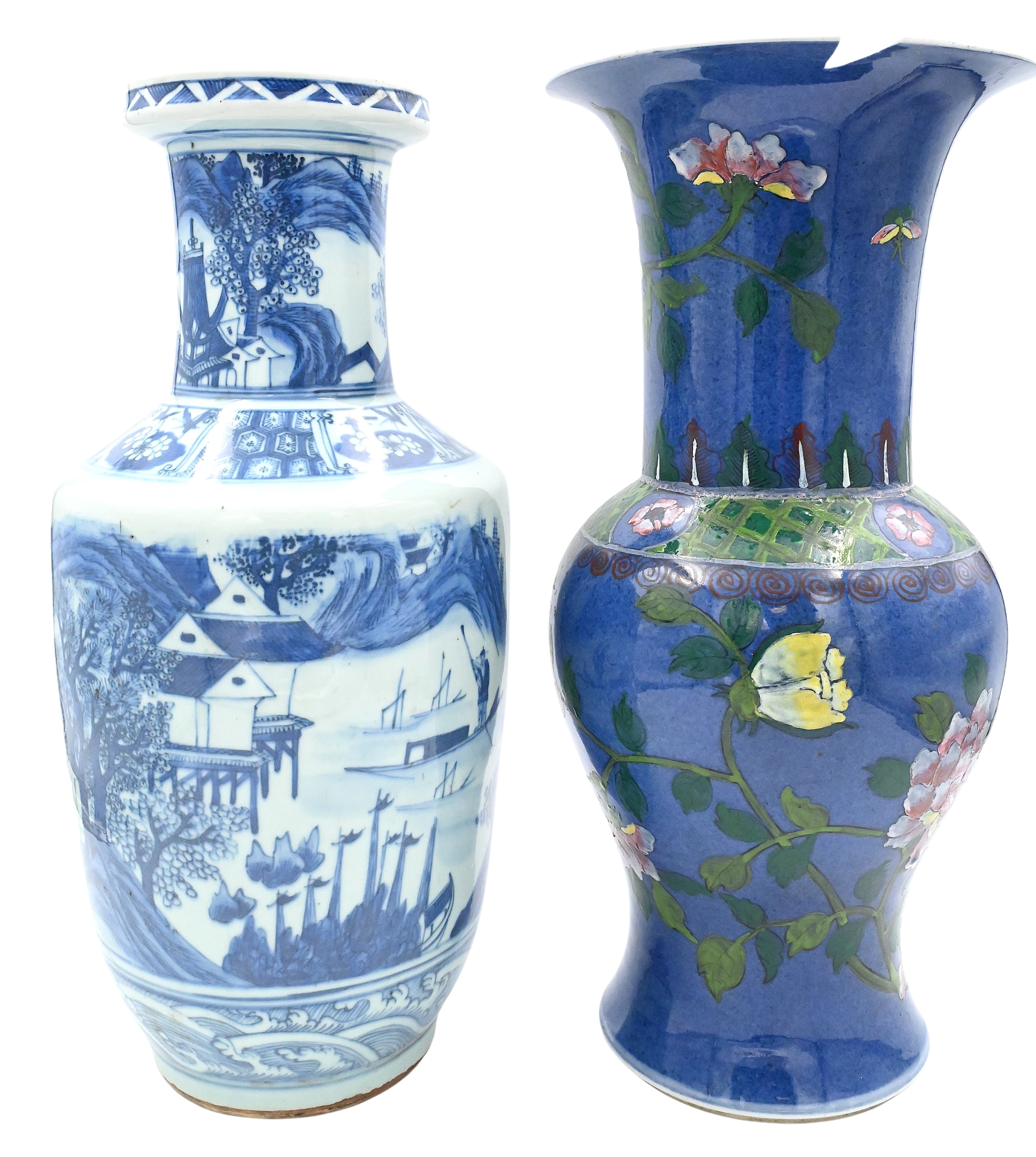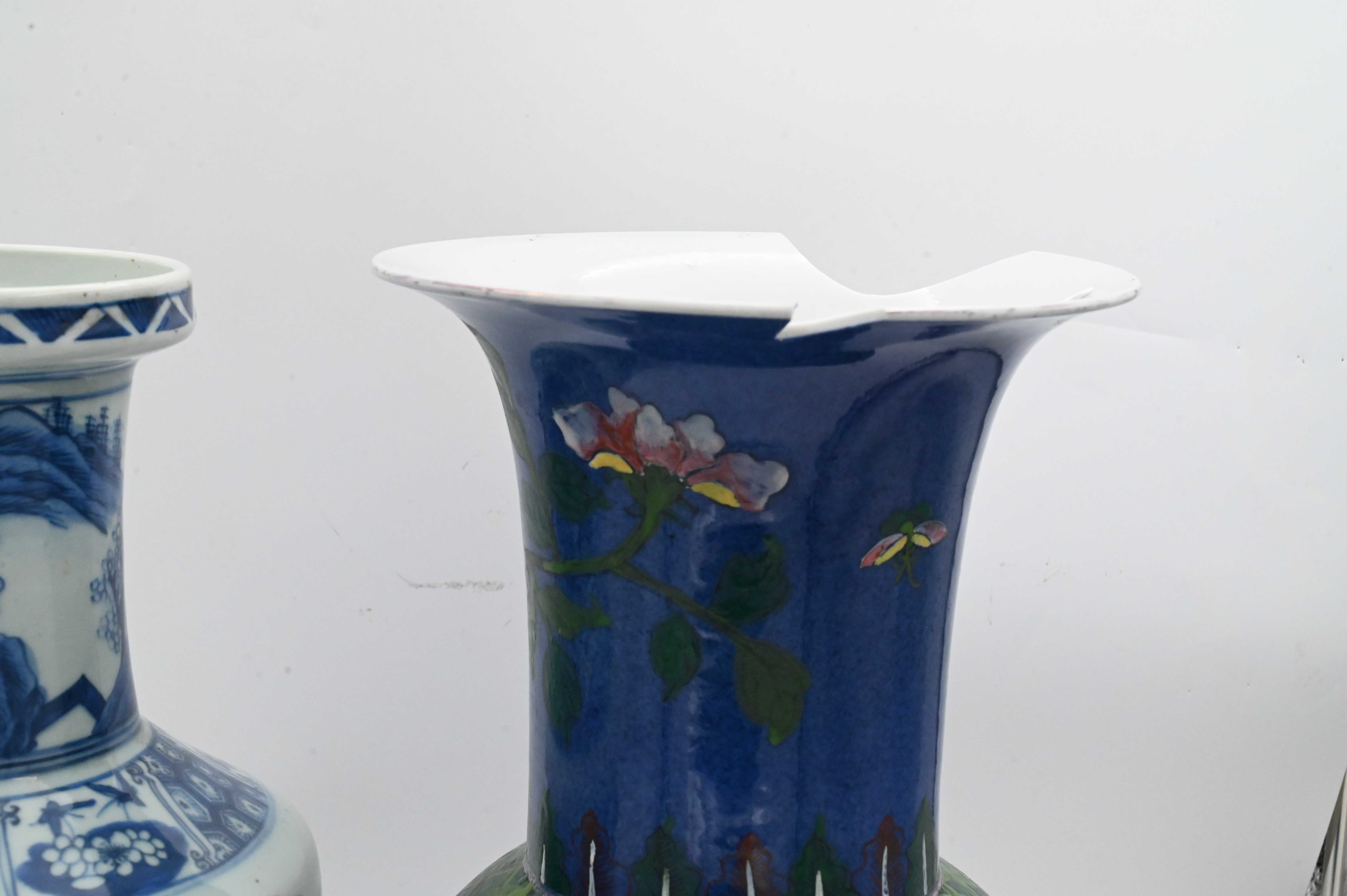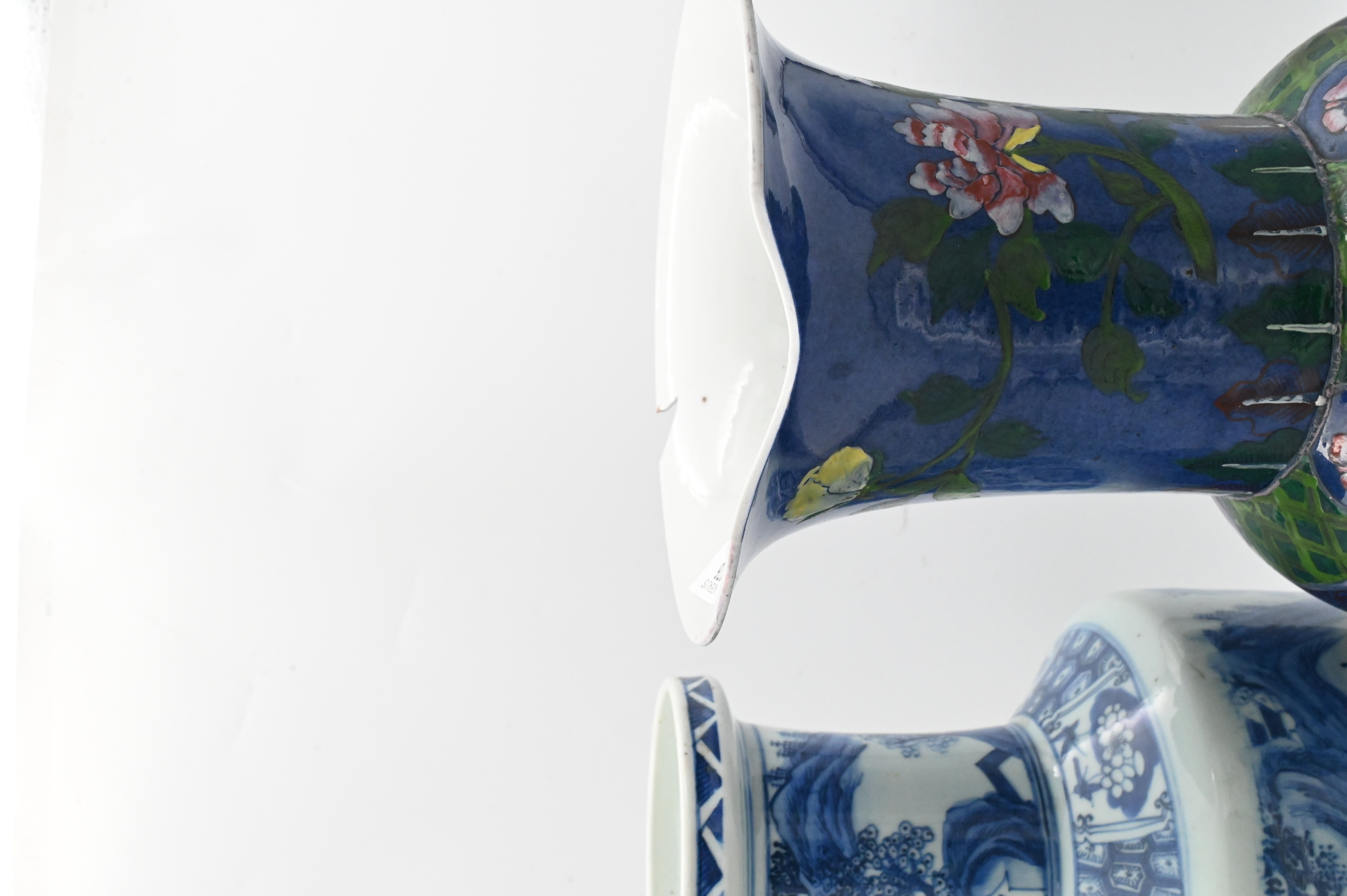 to include one blue and white vase having mountain village motif above crashing waves border along with blue ground vase having flared neck