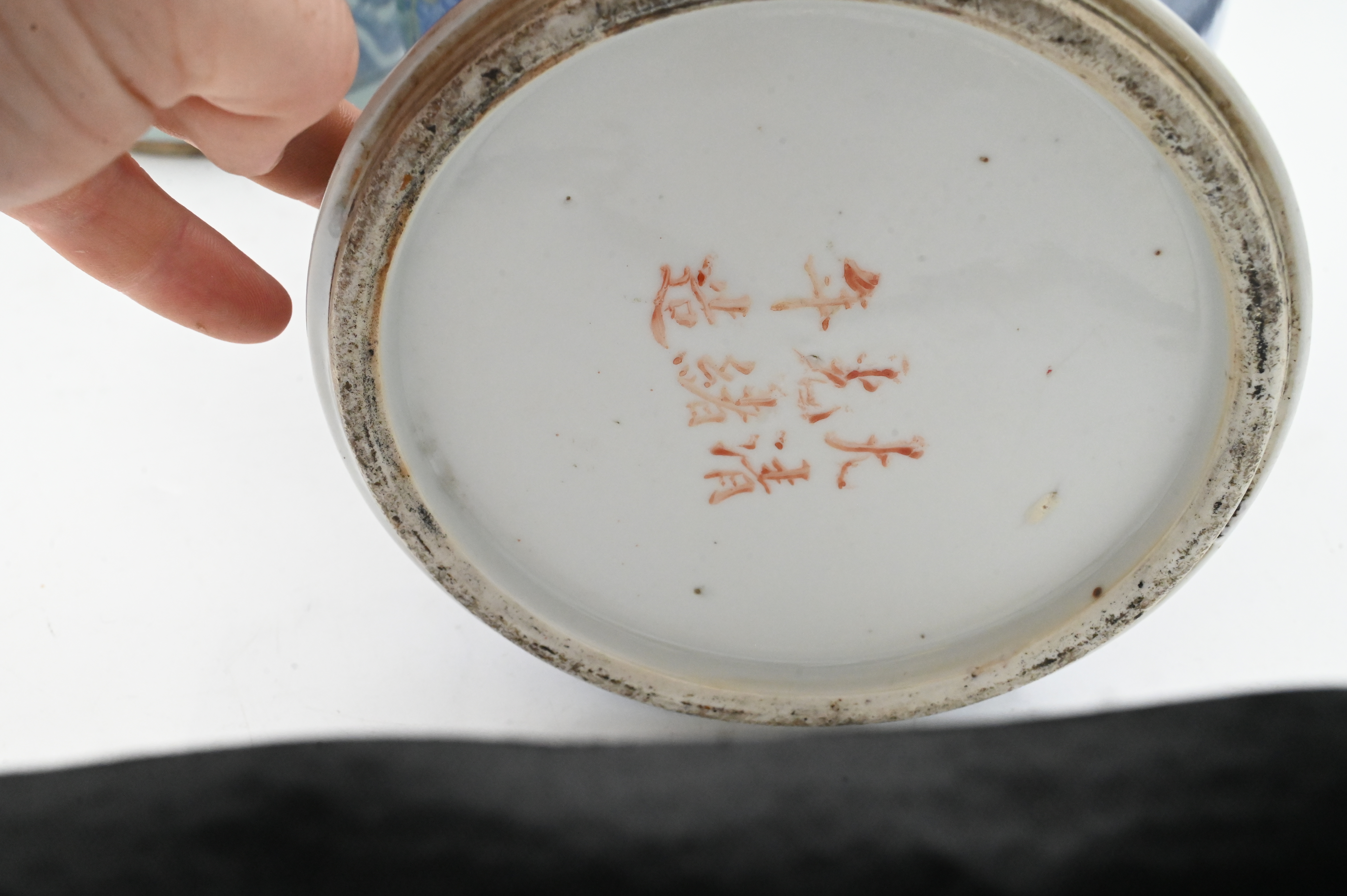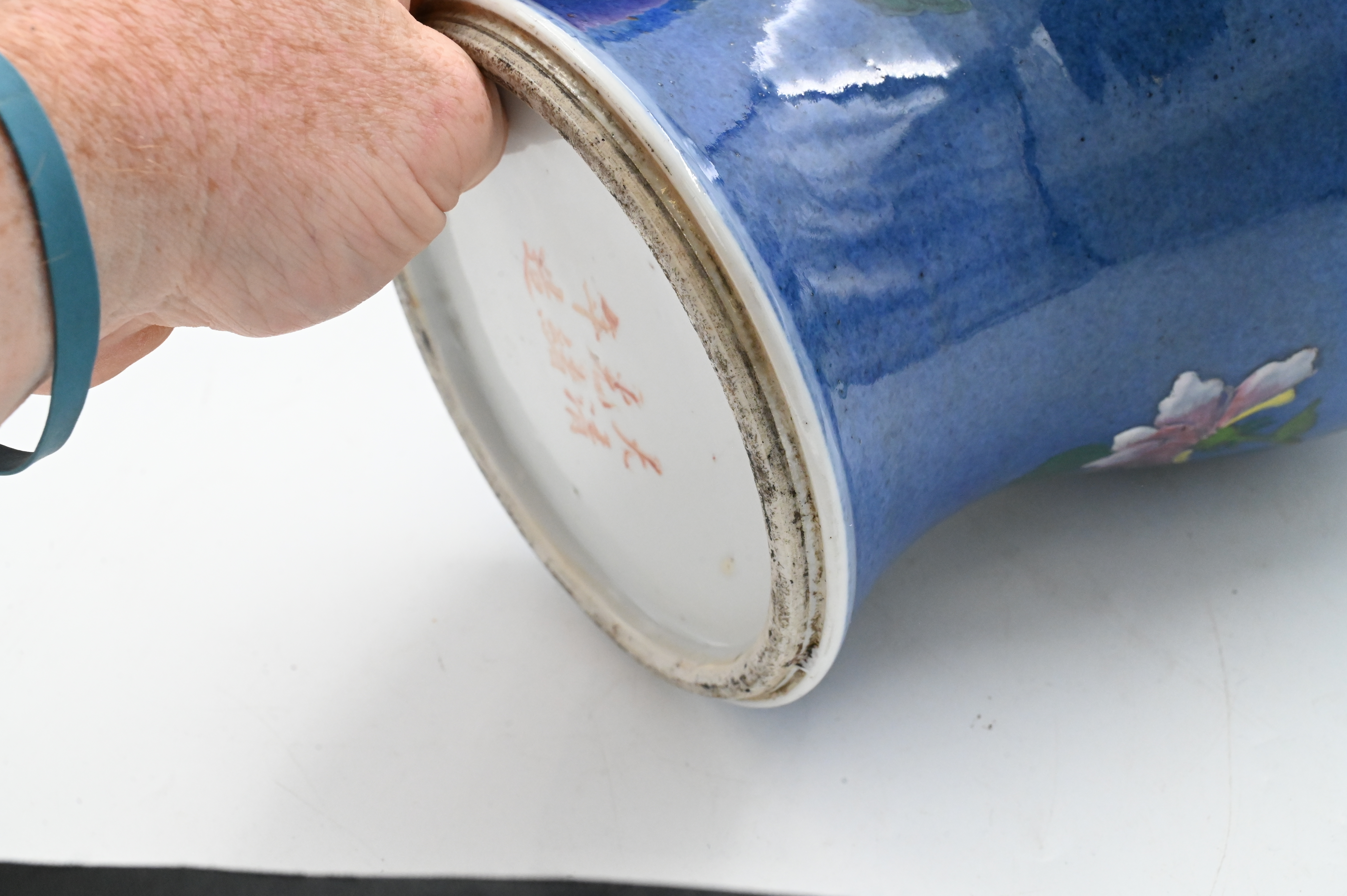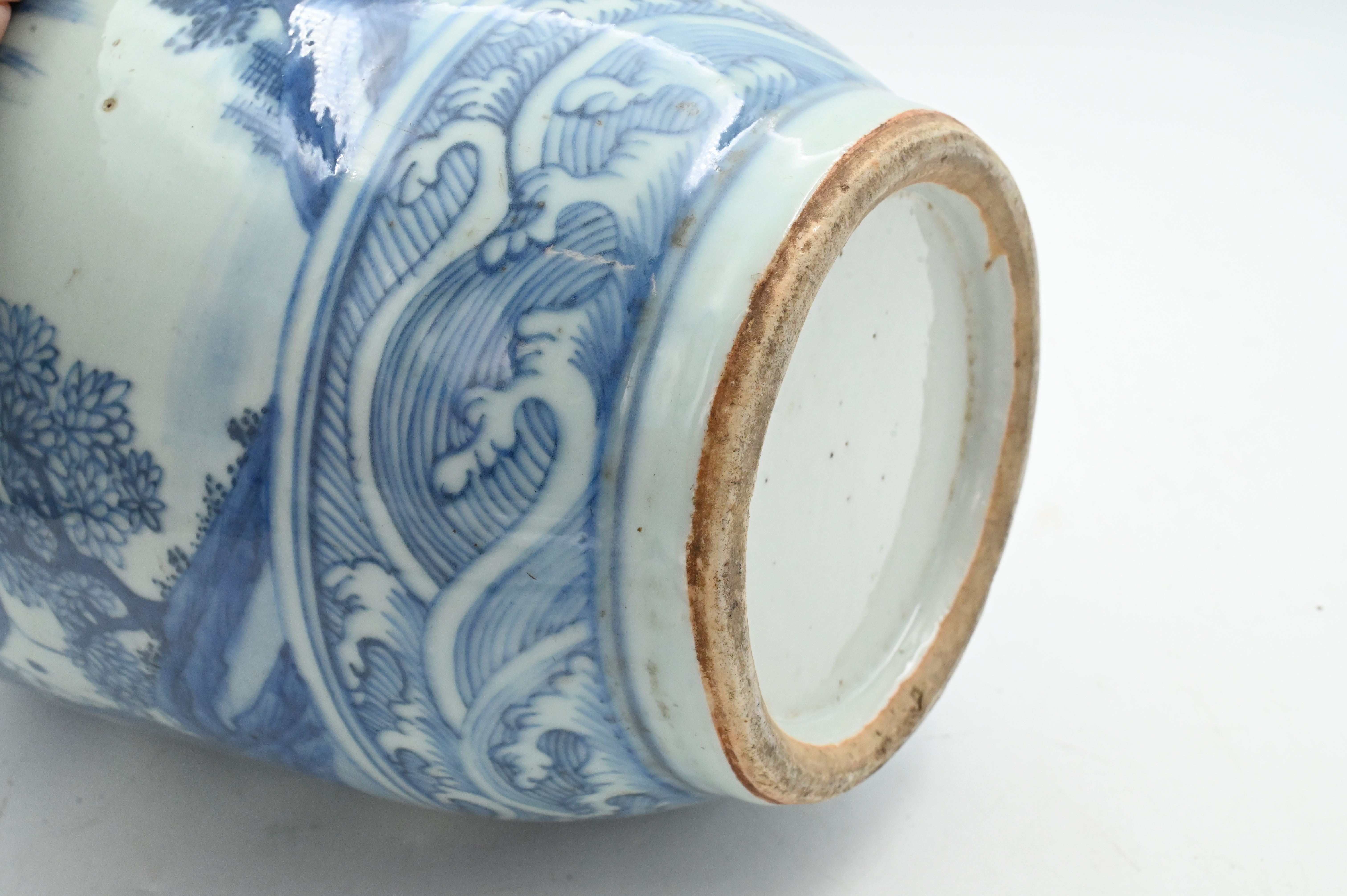to include one blue and white vase having mountain village motif above crashing waves border along with blue ground vase having flared neck
