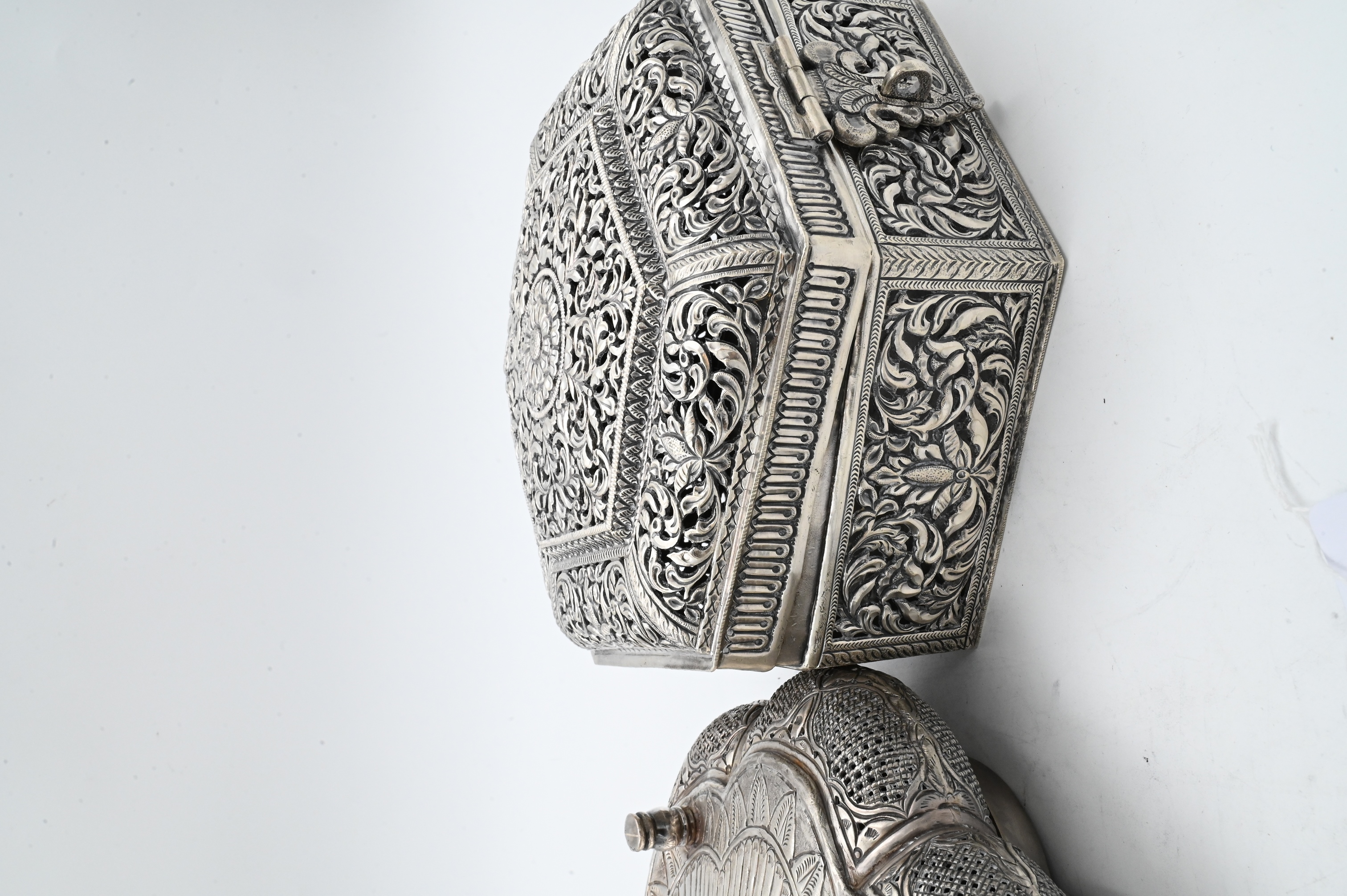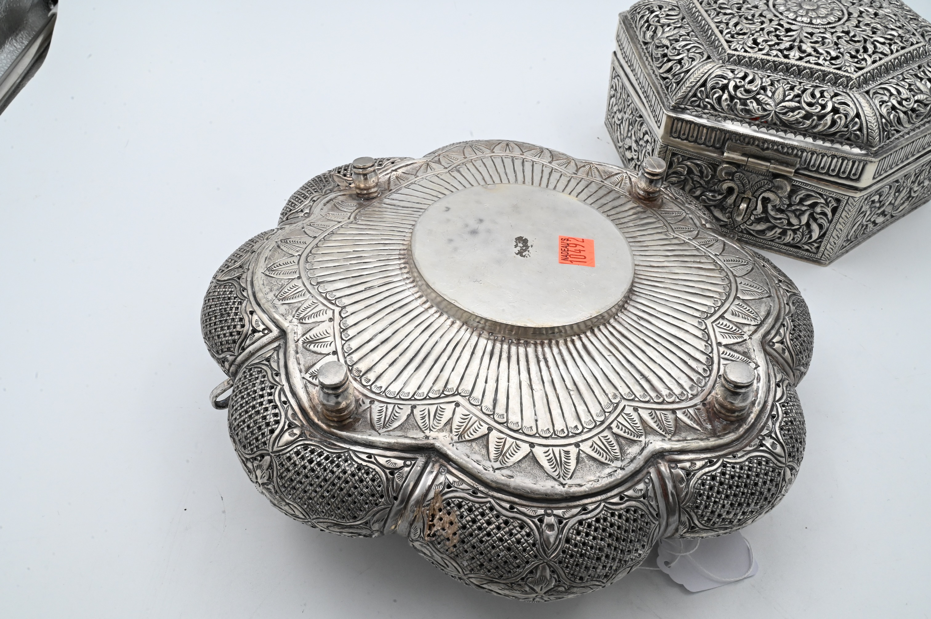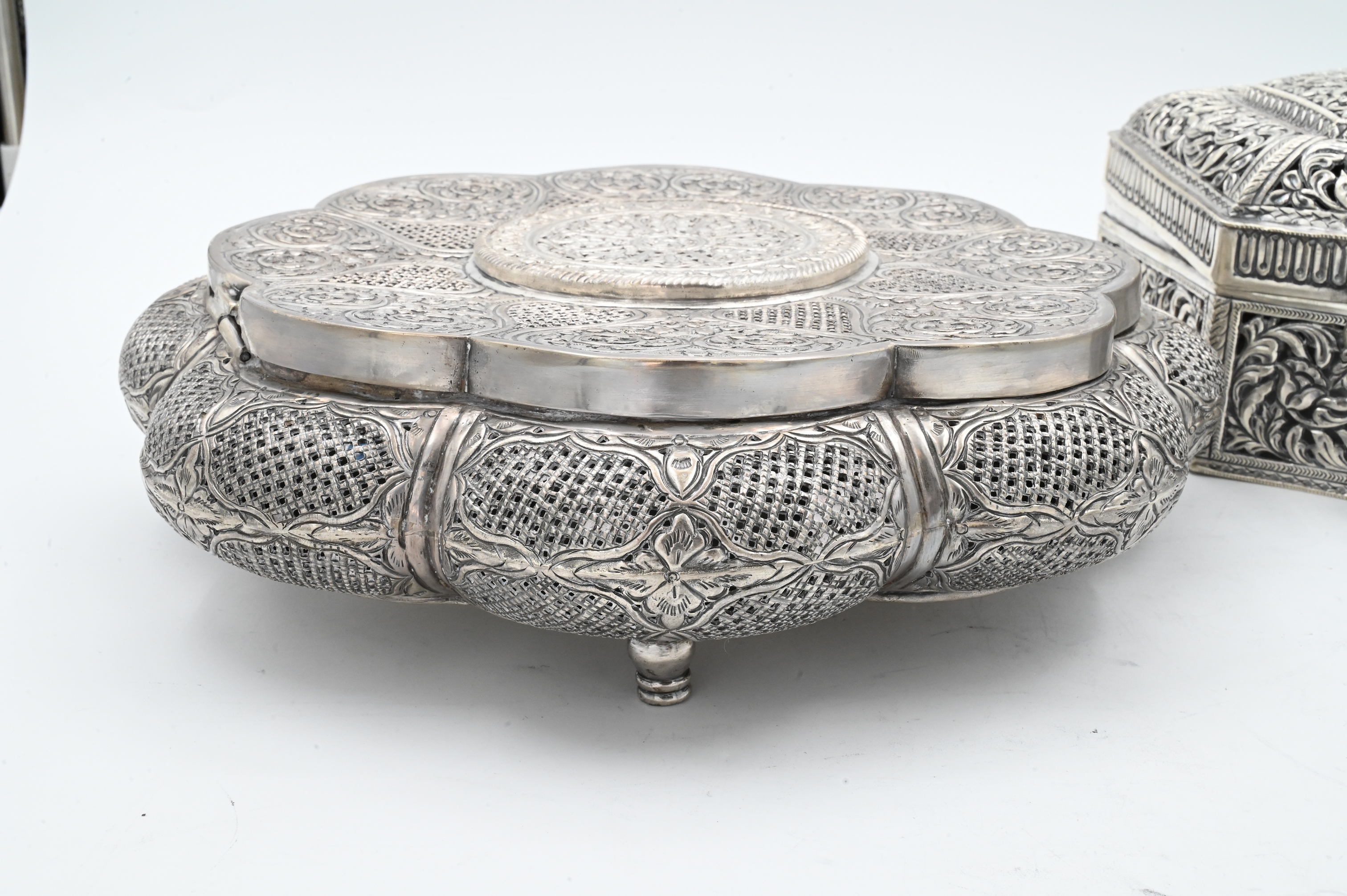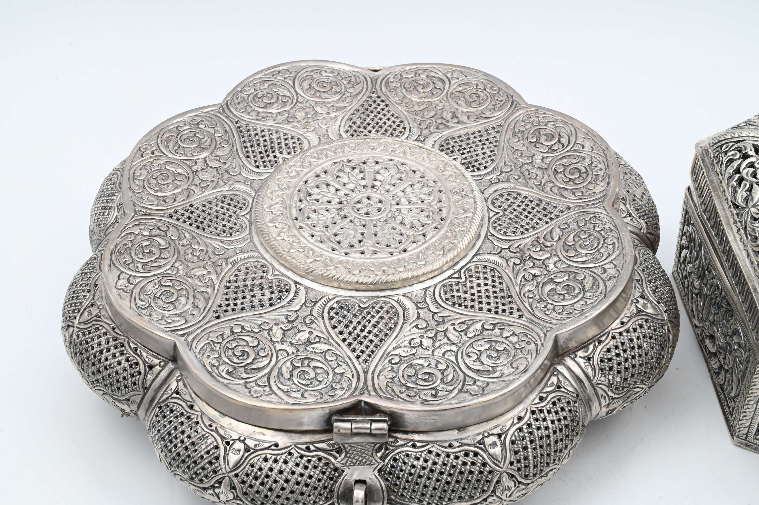 to include highly ornate pierced and repousse Indian silver floral shaped box, along with hexagon box ornately decorated, having floral motif, repousse, and pierced design