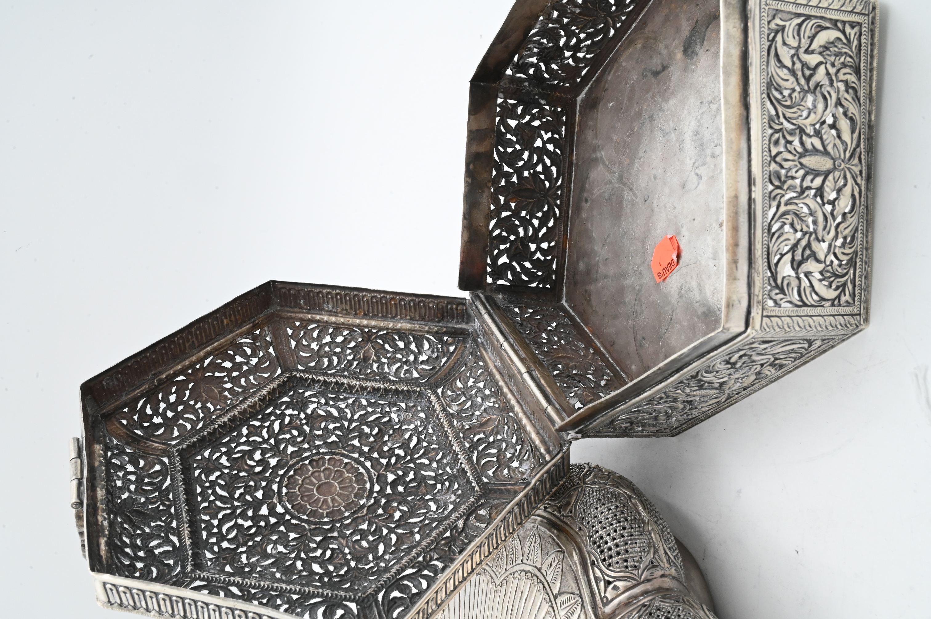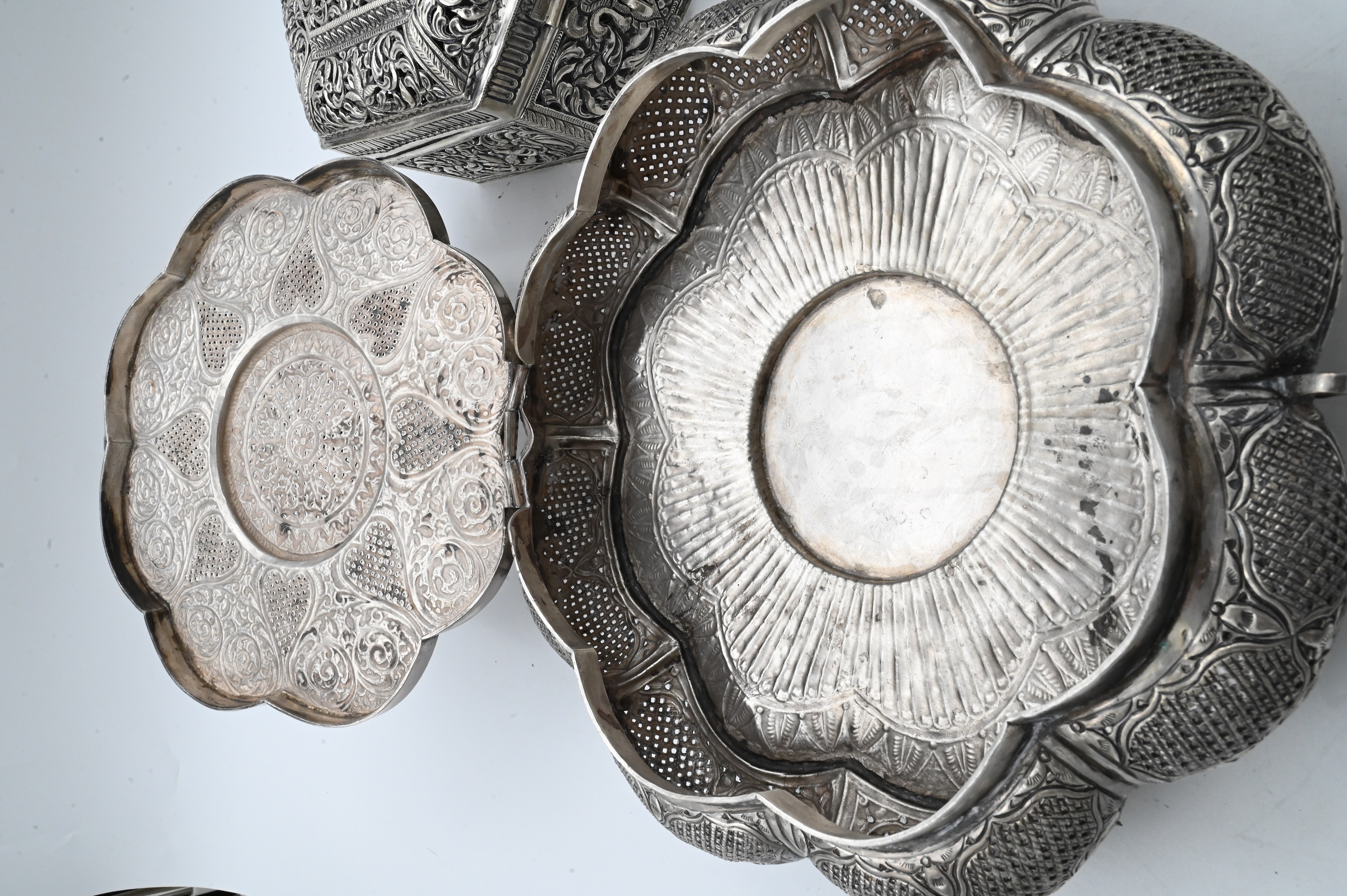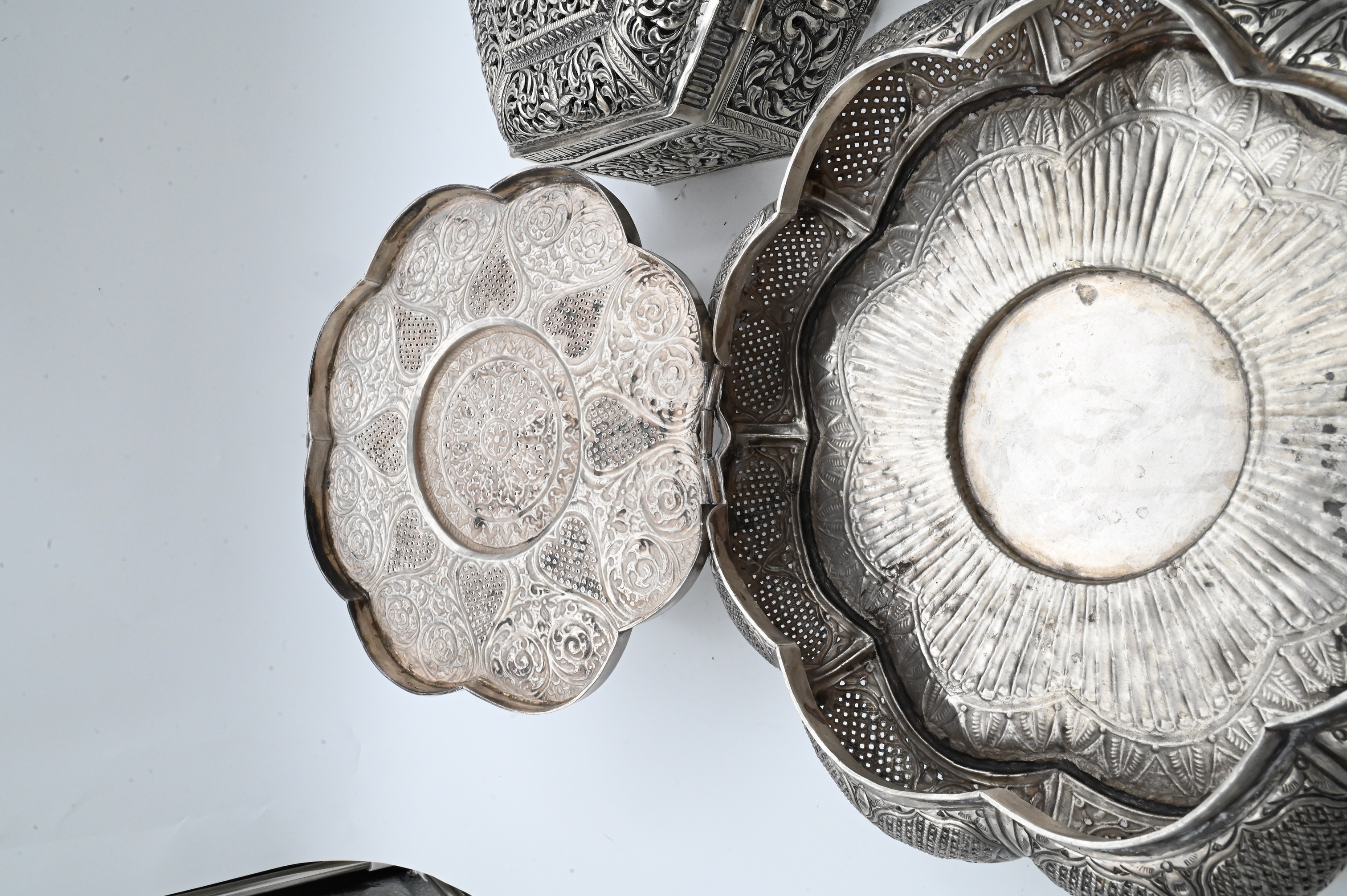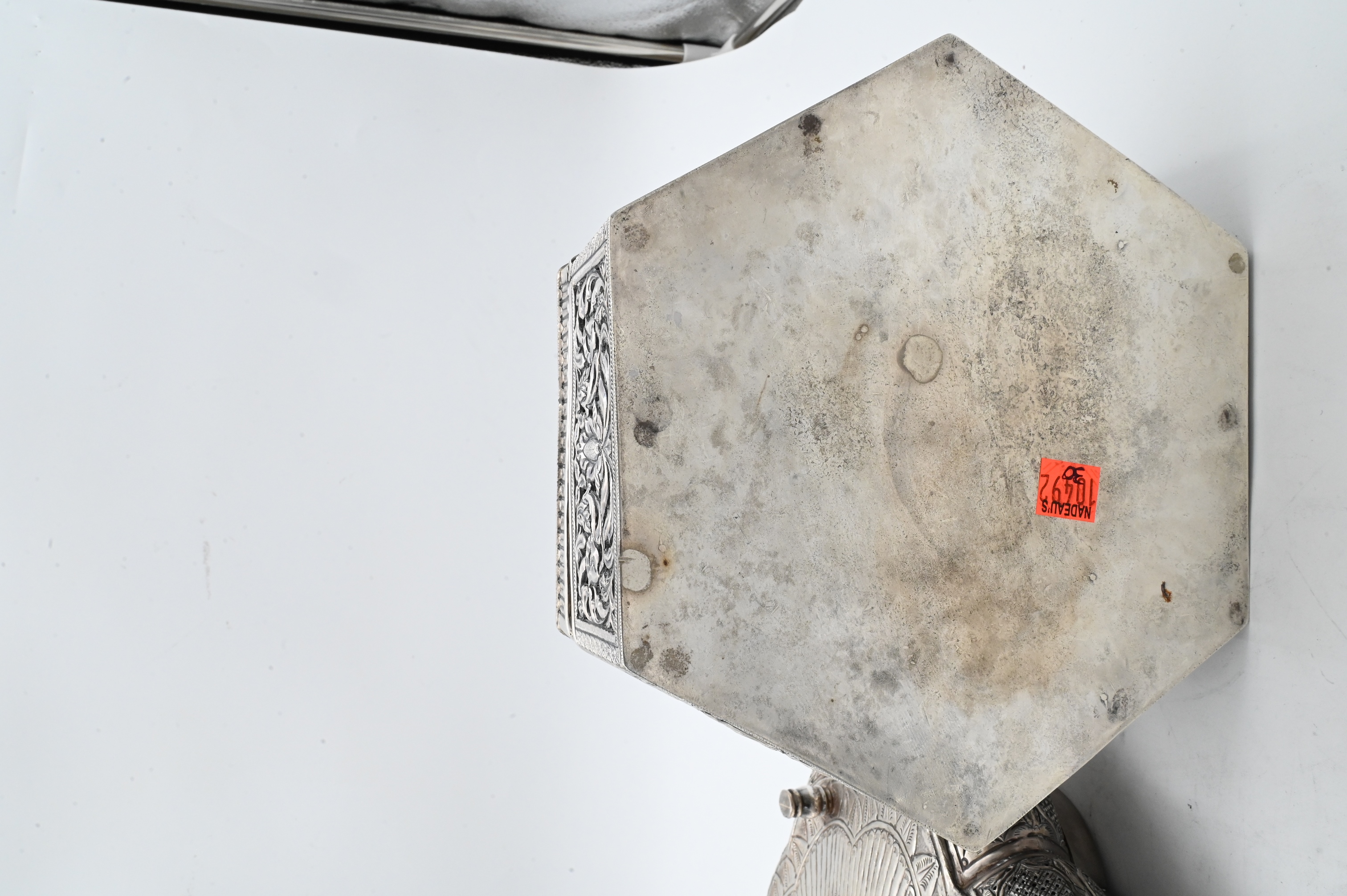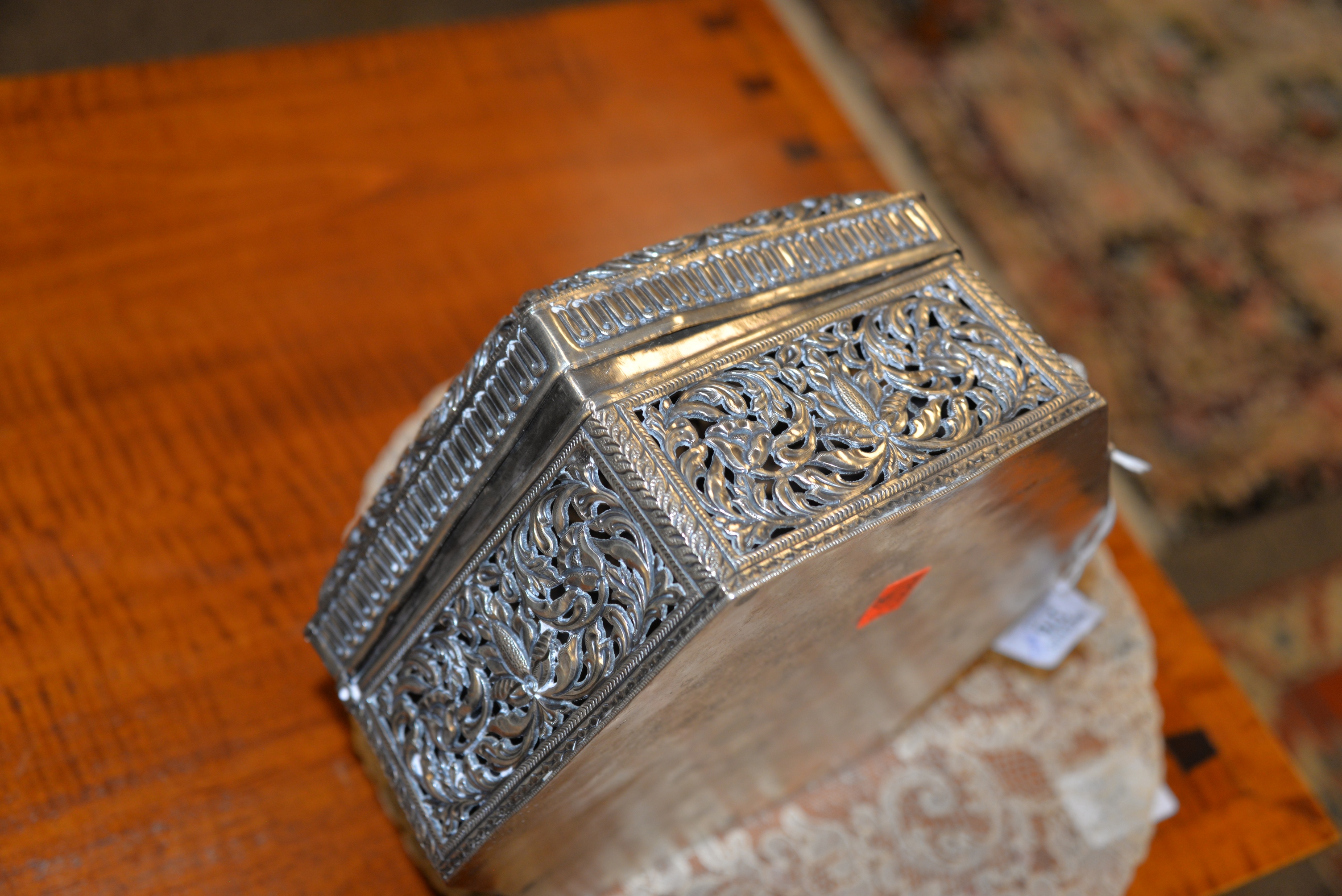 to include highly ornate pierced and repousse Indian silver floral shaped box, along with hexagon box ornately decorated, having floral motif, repousse, and pierced design