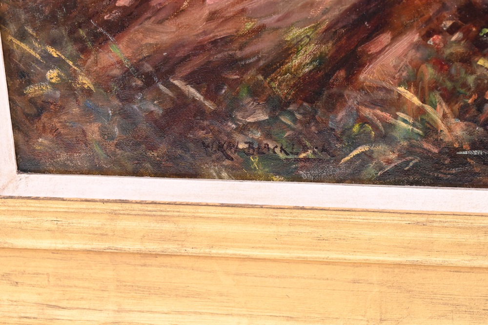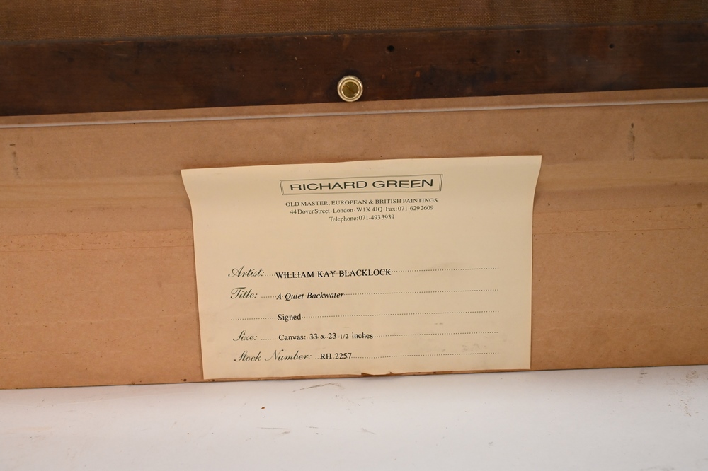 Lot 376: William Kay Blacklock (British, 1872 – 1922), A Quiet Backwater, oil on canvas, signed lower left W. Kay Blacklock, 33″ x 23 1/2″. P…