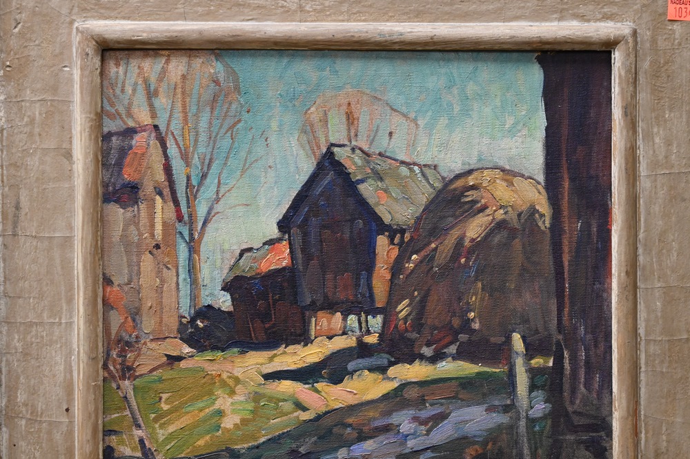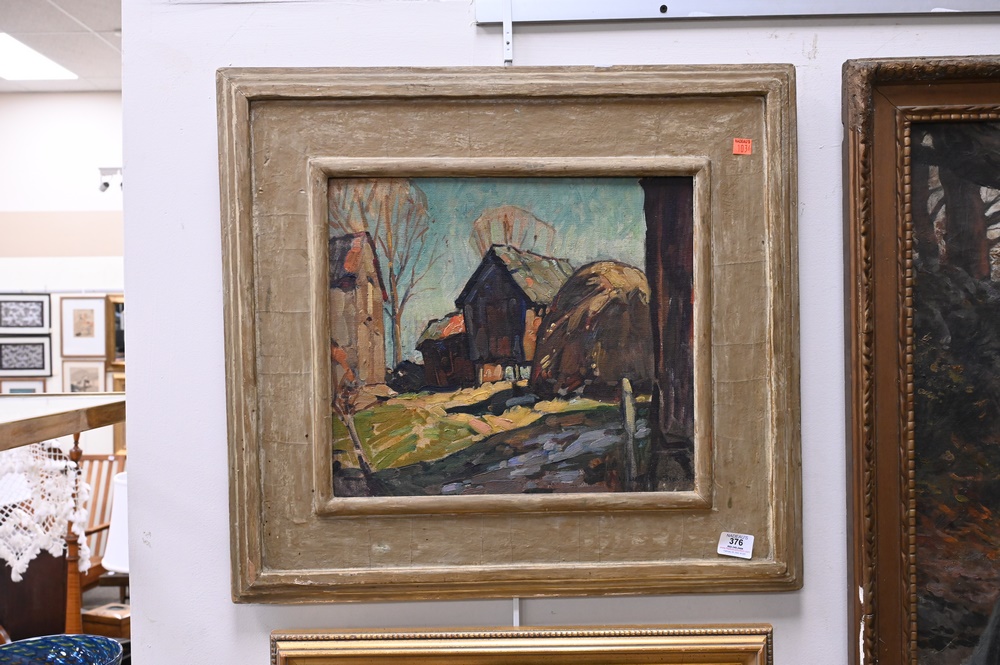 Lot 376: William Lester Sevens (1888 – 1969), farm landscape with barn and haystack, oil on board, signed lower right W Lester Stevens, 14″ x 15 1/2″.