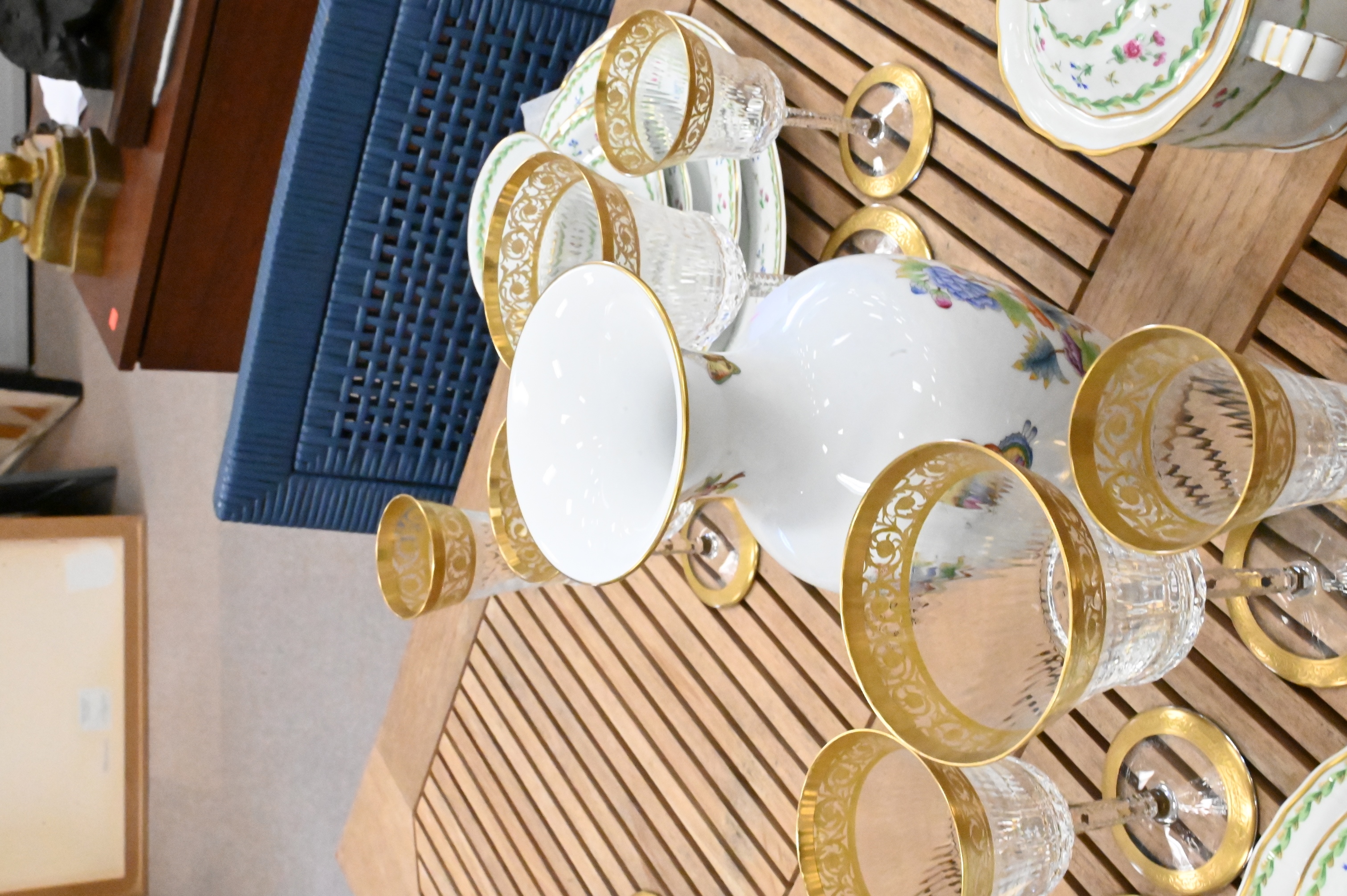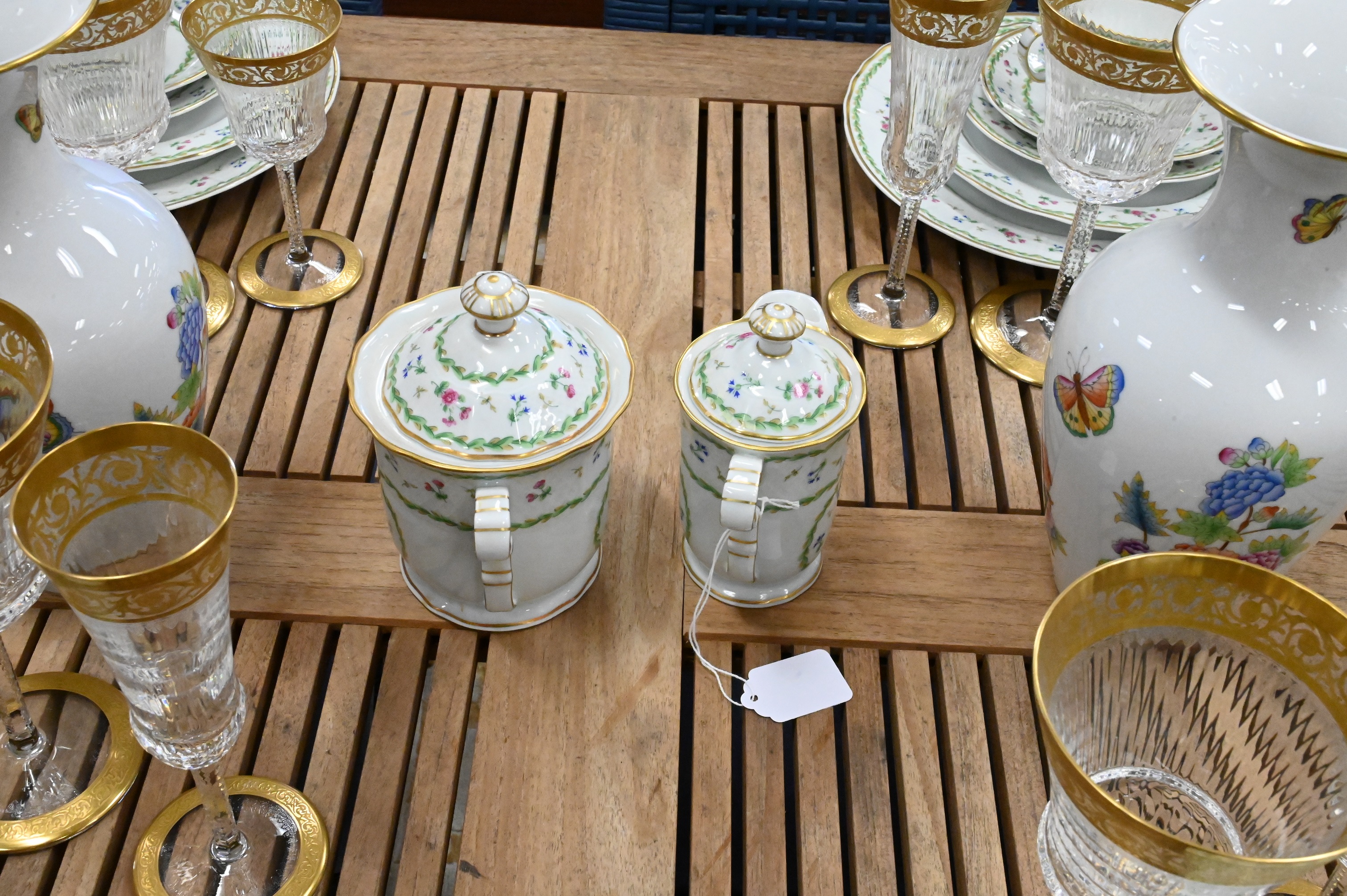 to include pair of Herend Queen Victoria vases, 12 teacups, 13 teacup saucers, 12 bread and butter plates, 12 luncheon plates diameter 8 1/2 inches, 12 dinner plates diameter 10 1/2 inches, one cream, and one sugar