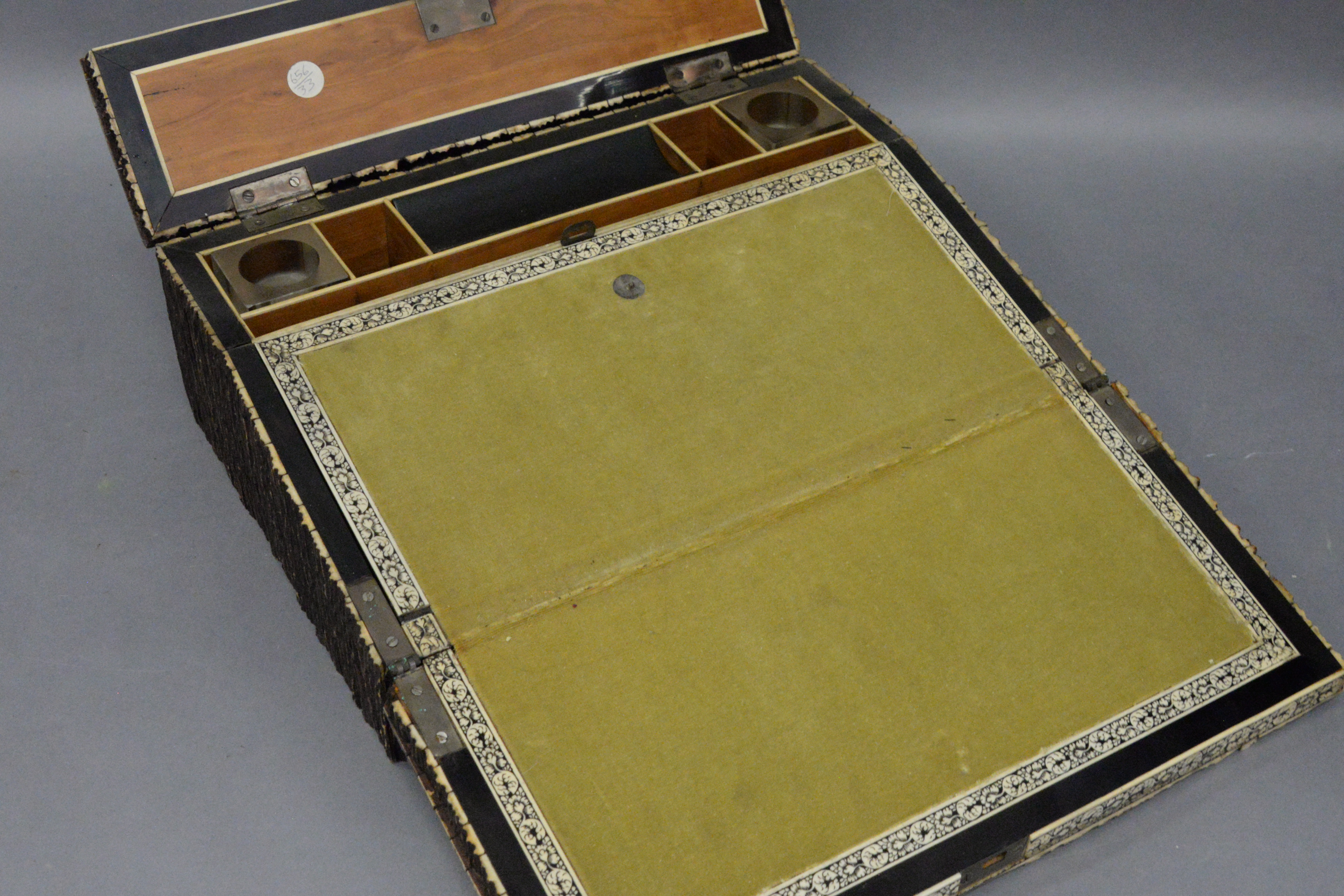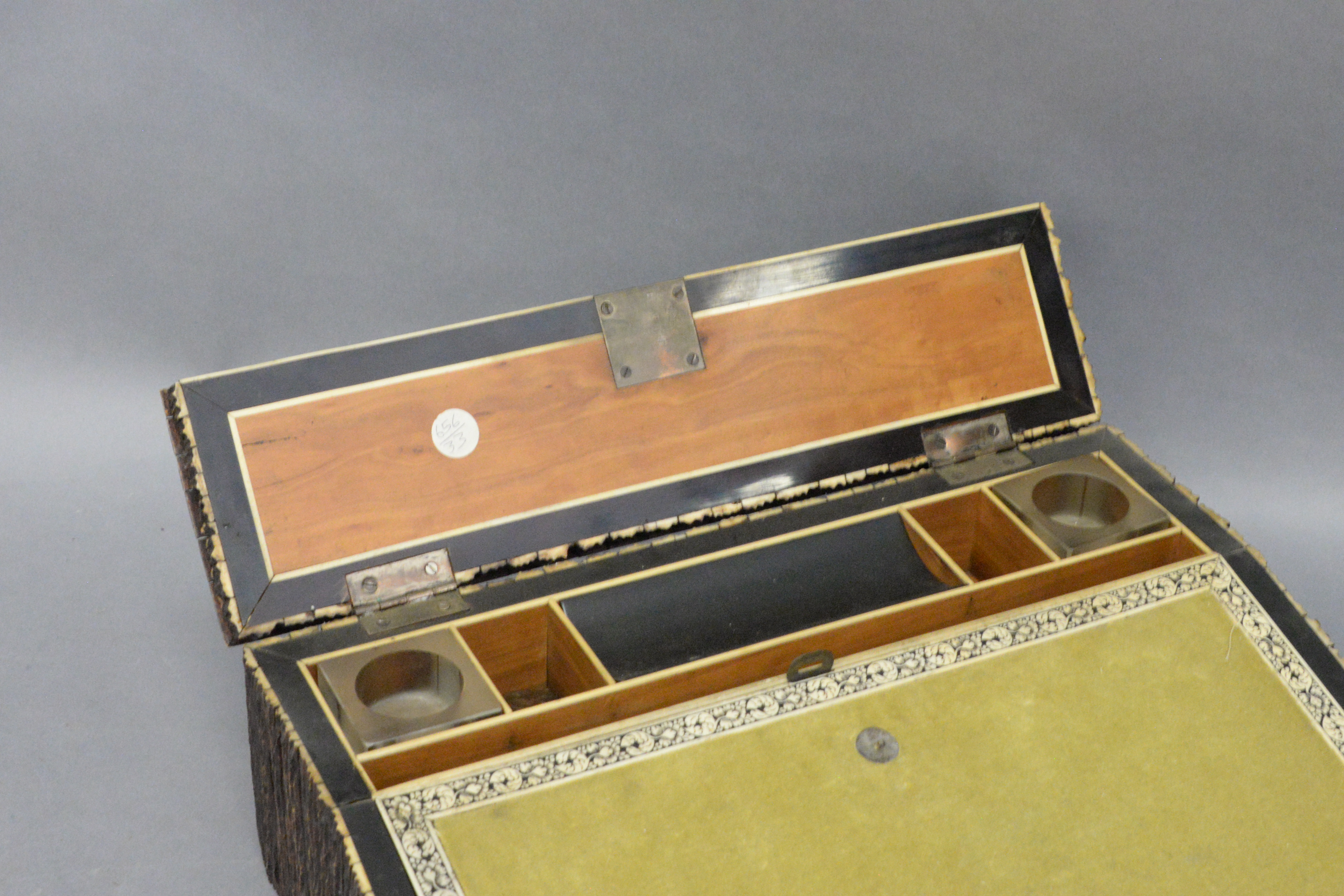 Anglo Indian Antler Lap Desk, having deer/elk antler parels, fitted bone inlaid interior, height 5 inches, width 15 1/2 inches