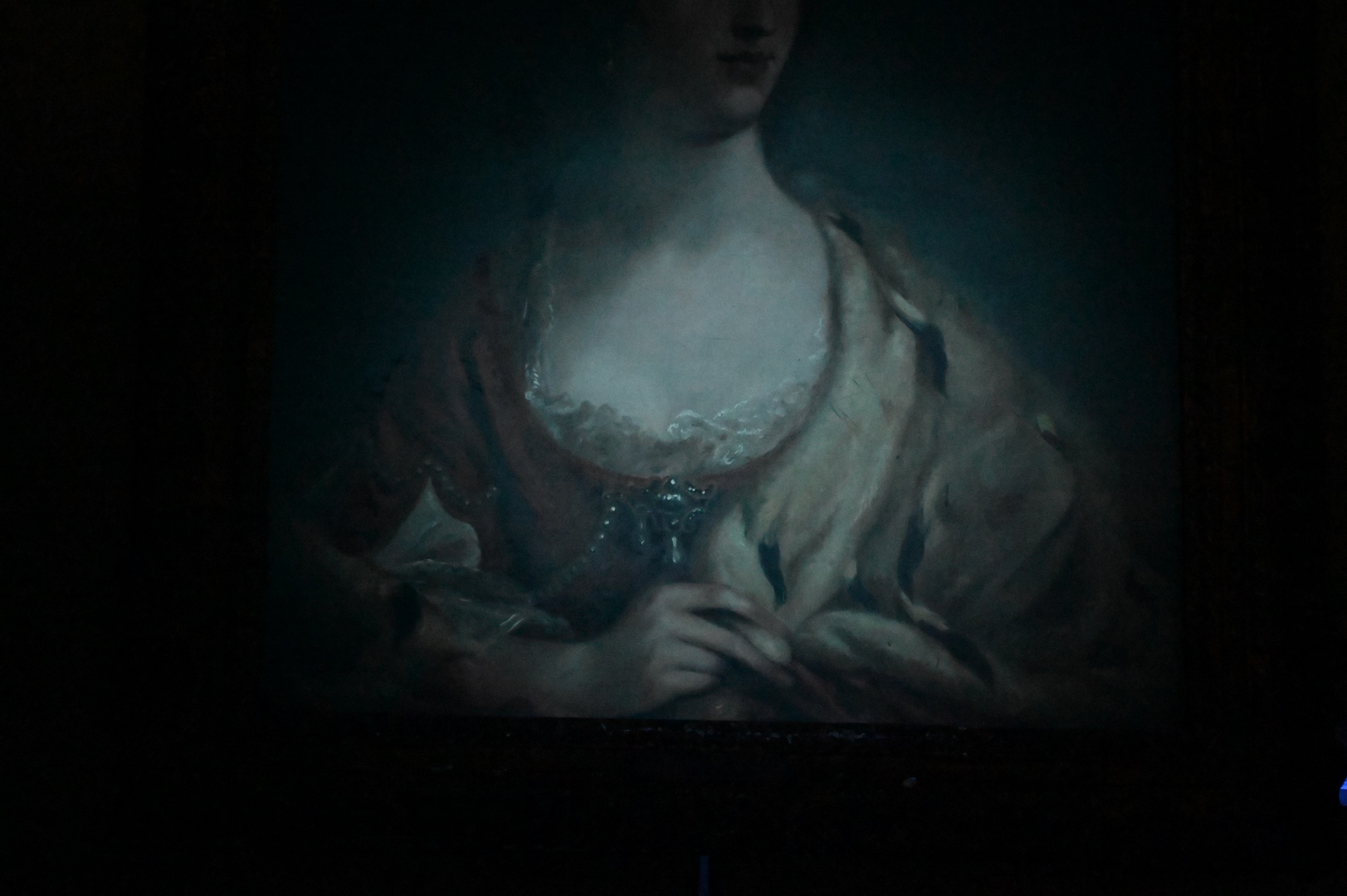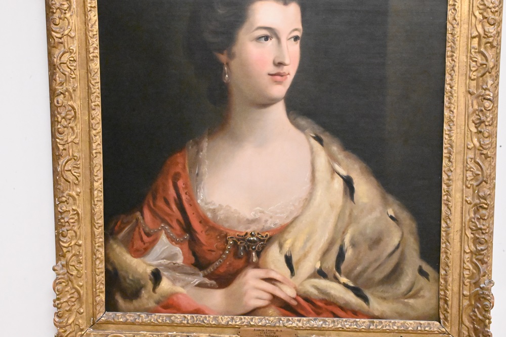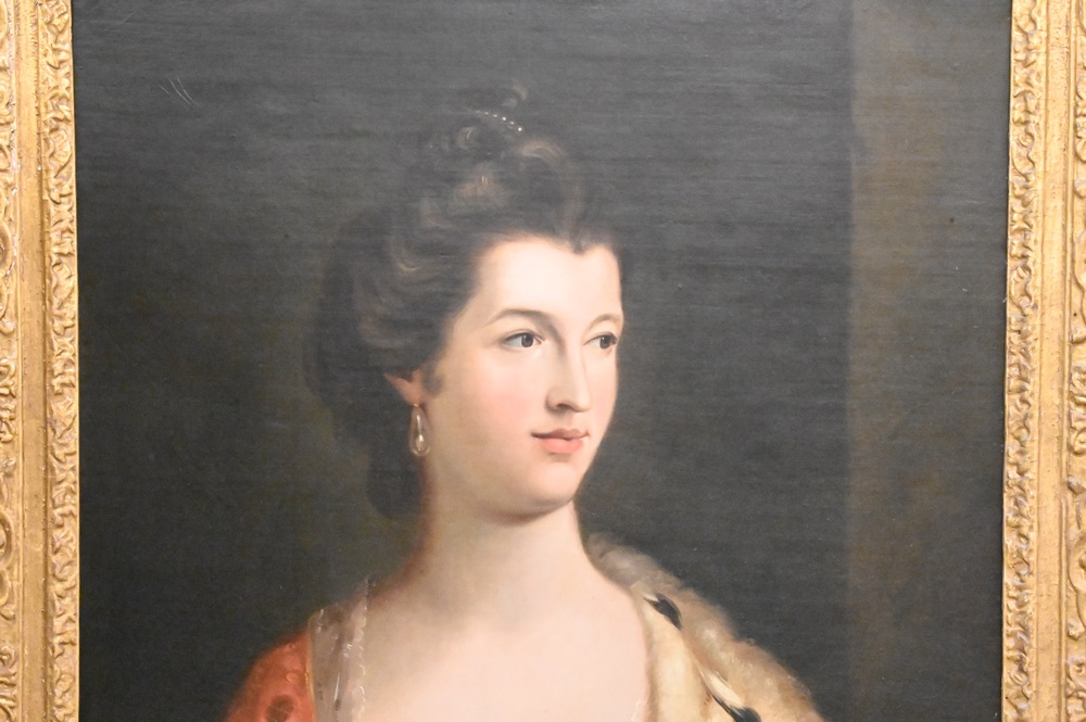 Attributed to Frances Cotes (1725 – 1770), portrait of Mrs. MacDonald, wearing an ermine cloak over a red dress decorated with pearls, oil on canvas, in 18th century frame, relined, sight size 30″ x 25 1/4″. Provenance: Hermione, Countess of Durham, Christie’s New York 6/15/77. Christie’s New York sale #8234, 10/5/95, Lot 202.