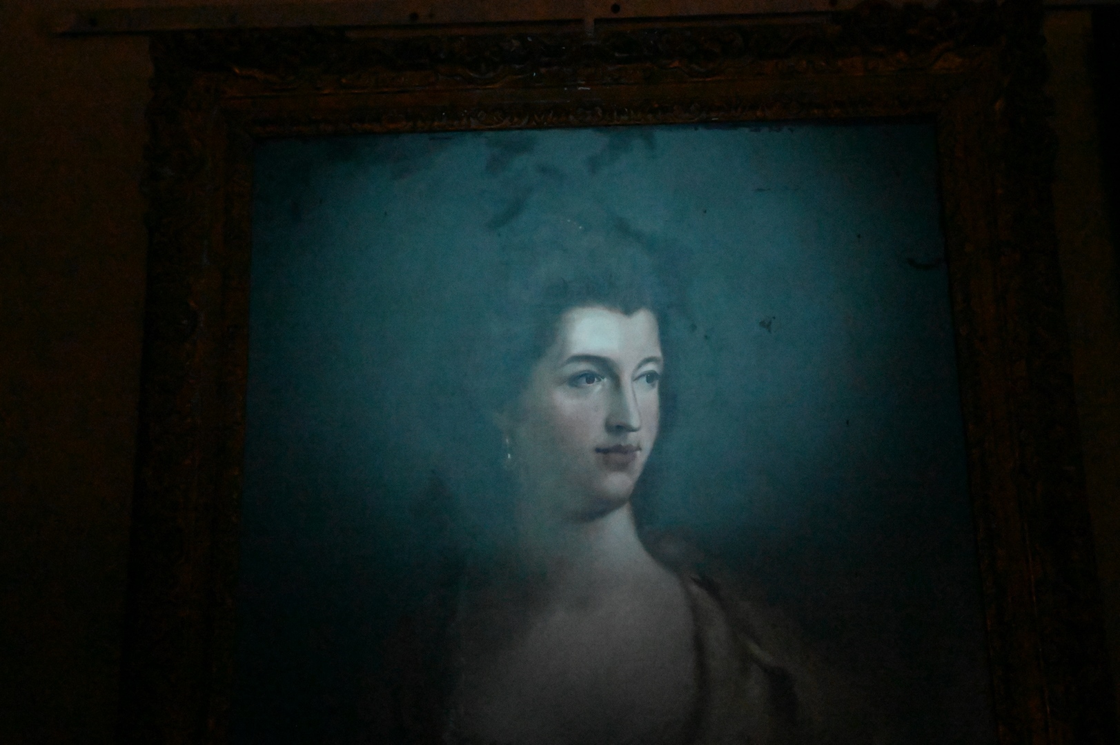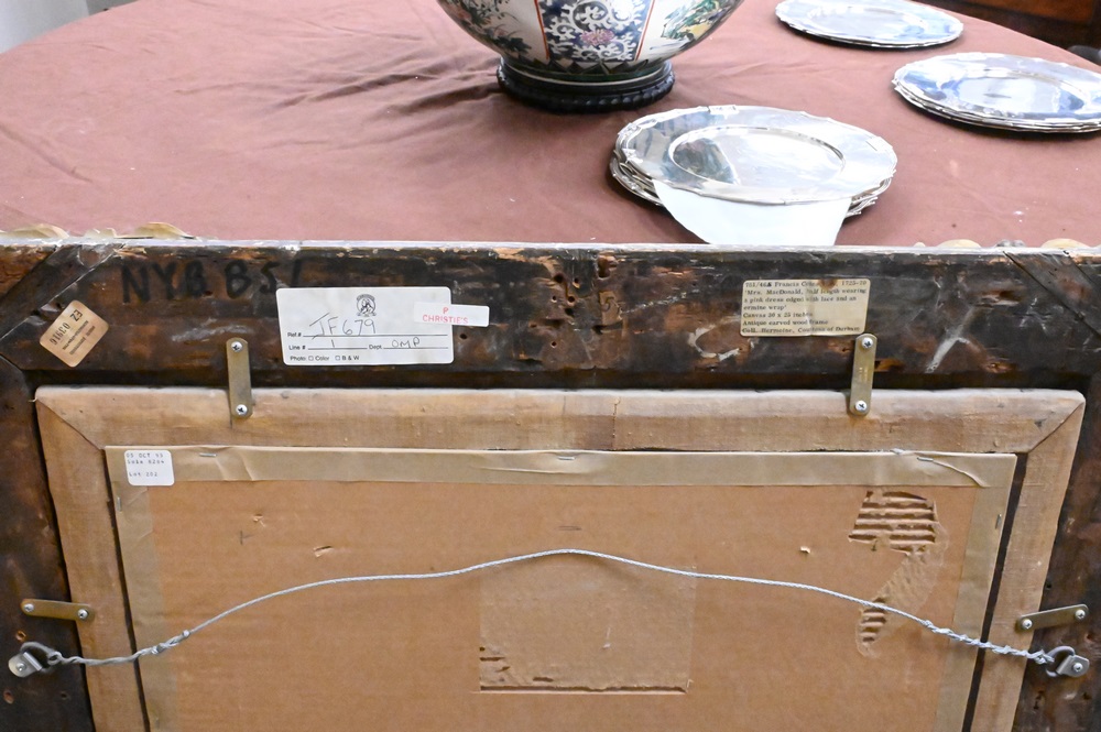 Lot 377: Attributed to Frances Cotes (1725 – 1770), portrait of Mrs. MacDonald, wearing an ermine cloak over a red dress decorated with pearls, oil on canvas, in 18th century frame, relined, sight size 30″ x 25 1/4″. Provenance: Hermione, Countess of Durham, Christie’s New York 6/15/77. Christie’s New York sale #8234, 10/5/95, Lot 202.