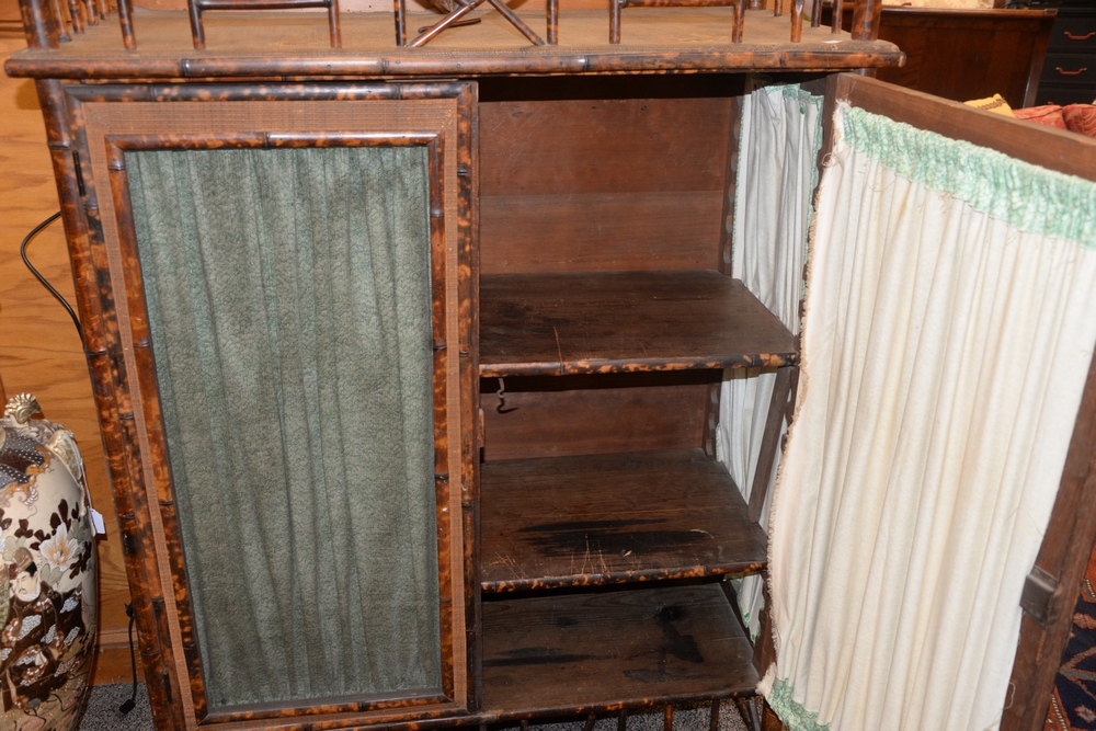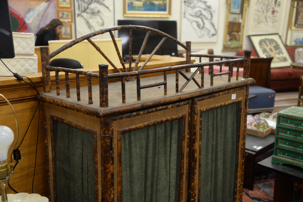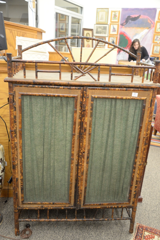 Lot 377: Bamboo Two Door Cabinet, having high gallery over two mesh doors opening to three interior shelves, height 60 inches, width 40 inches.