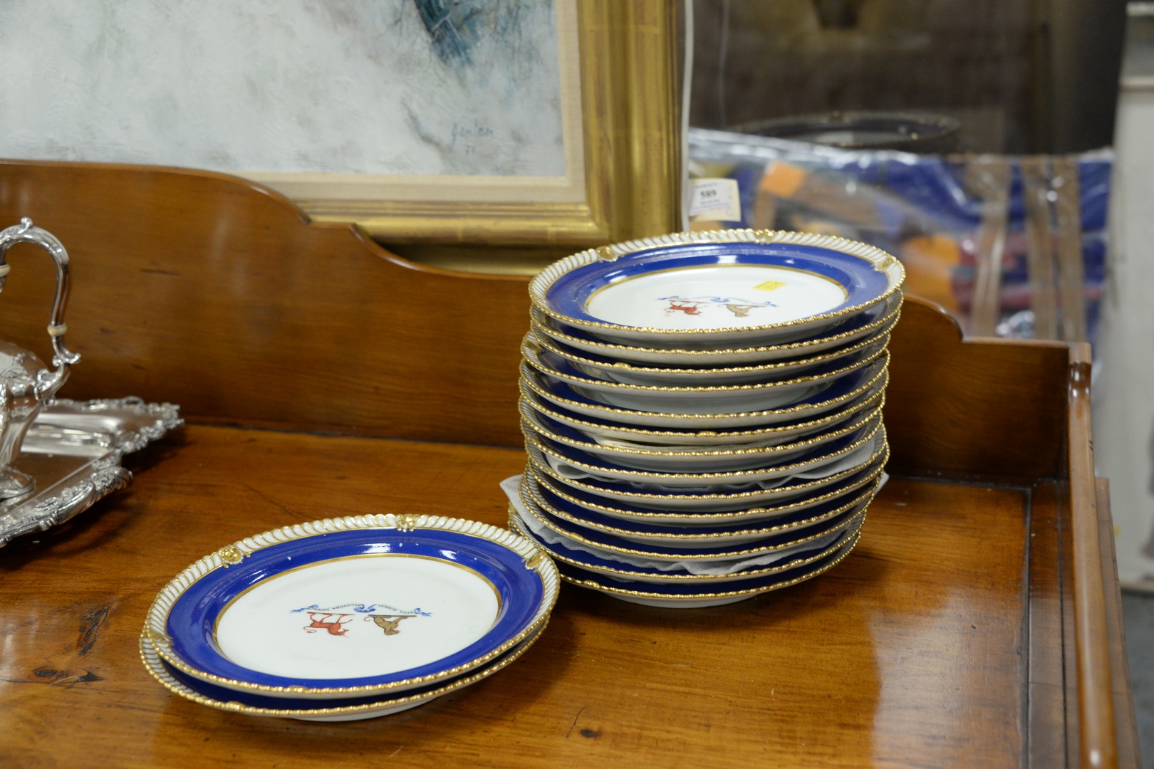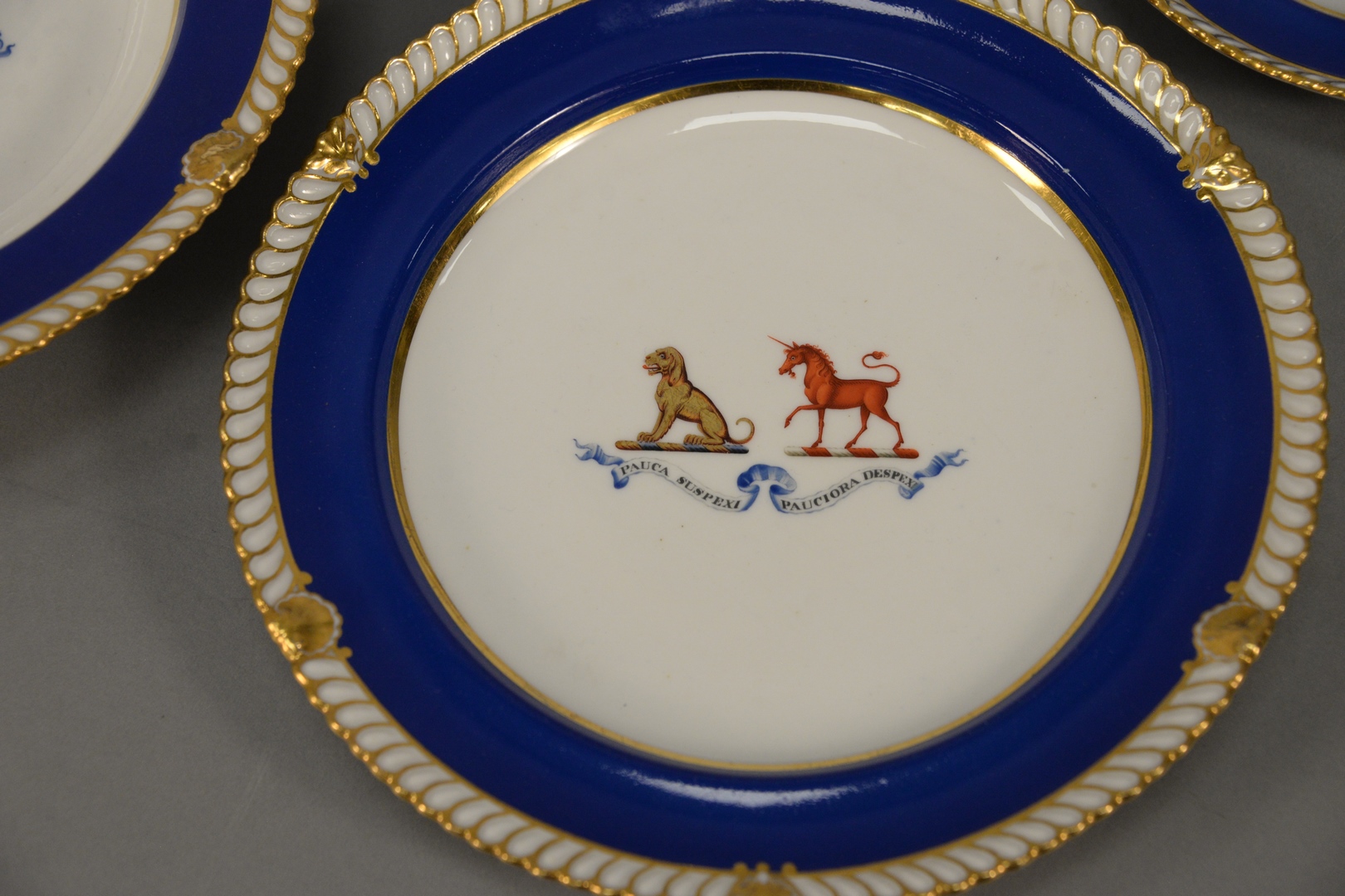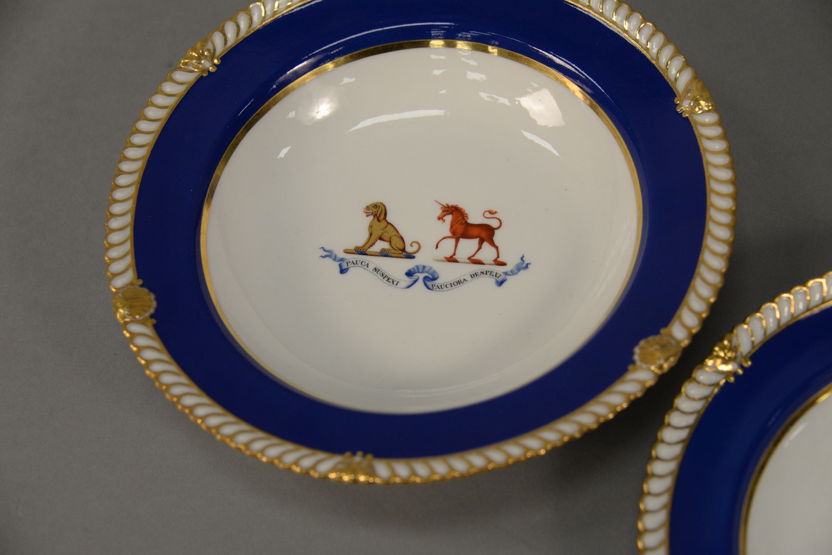 Chamberlain’s Worcester Porcelain Armorial Decorated Fifty-Eight Piece Partial Service Set 19th century England gilded with cobalt blue border, central crest mark of gilt dog and red unicorn, banner marked Pauca Suspexi, Pauciora Despexi, to include 35 dinner plates, 11 luncheon plates, 12 bowls dinner plate diameter 9 1/2 inches, there are five broken plates and one broken bowl Provenance: Estate from Sutton Place, N.Y. name withheld by request