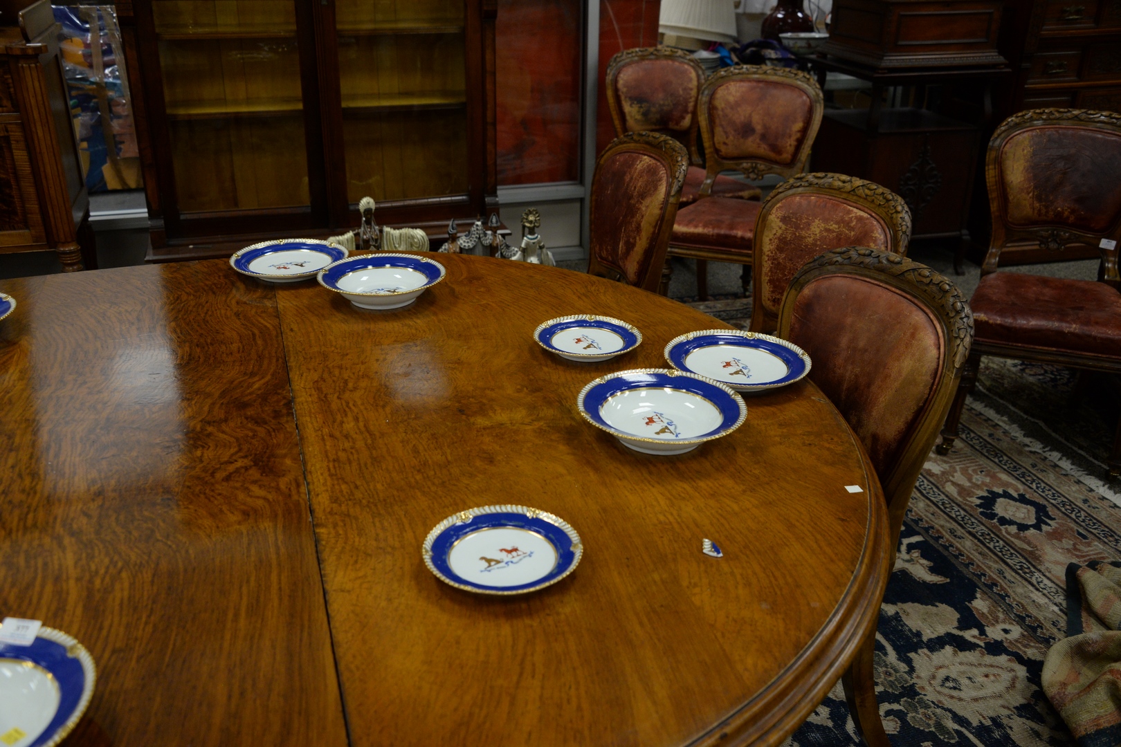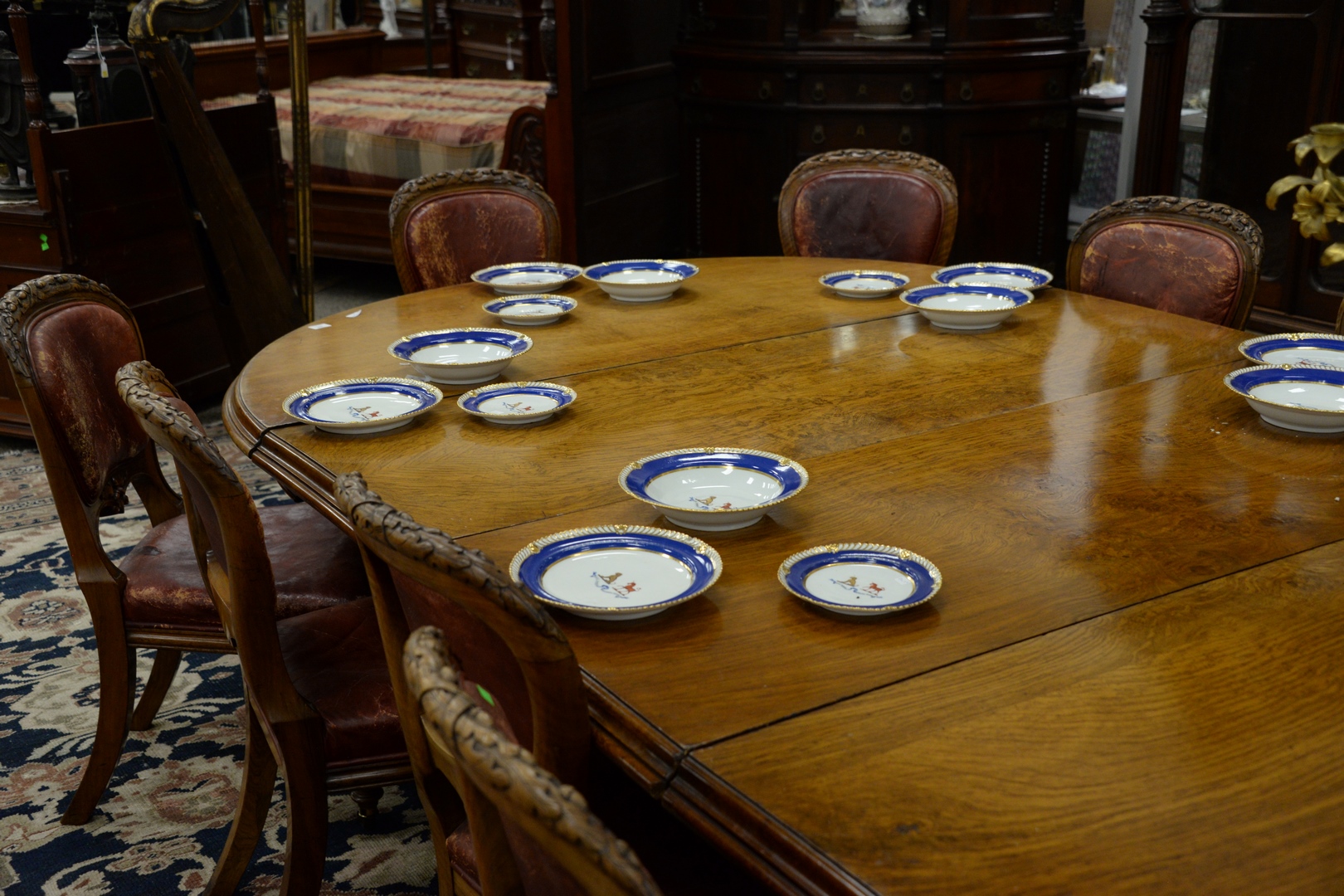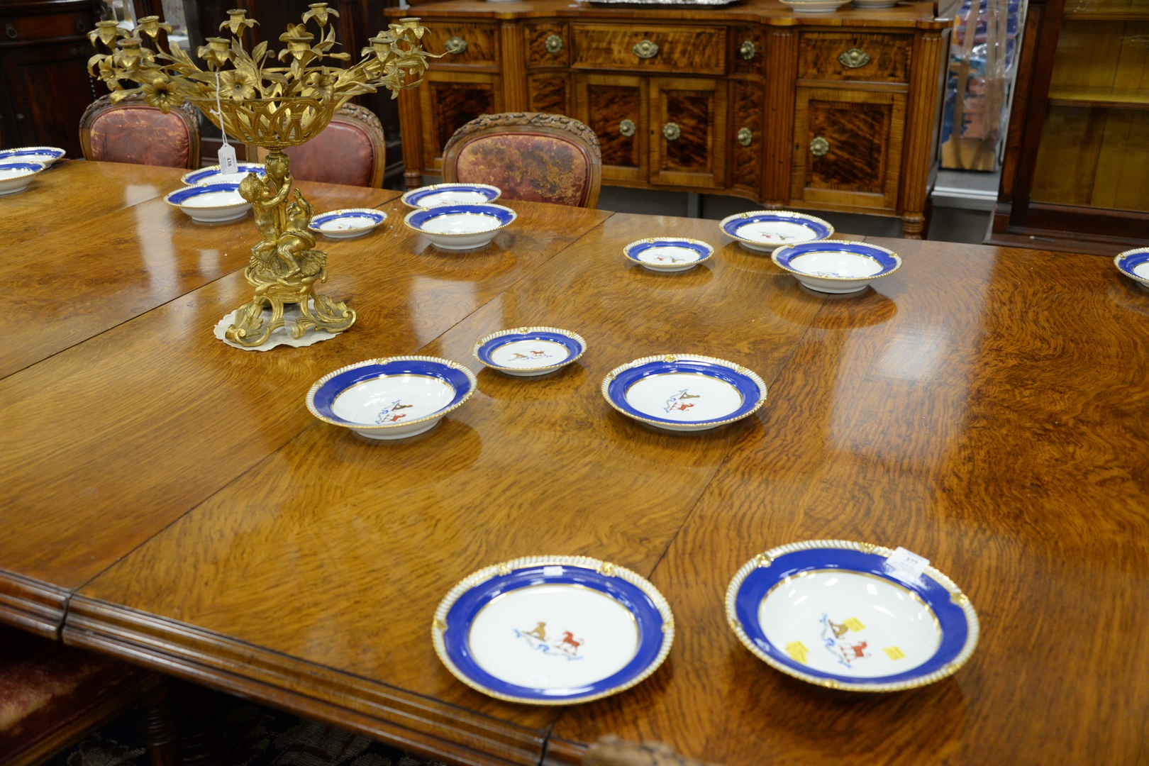 Chamberlain’s Worcester Porcelain Armorial Decorated Fifty-Eight Piece Partial Service Set 19th century England gilded with cobalt blue border, central crest mark of gilt dog and red unicorn, banner marked Pauca Suspexi, Pauciora Despexi, to include 35 dinner plates, 11 luncheon plates, 12 bowls dinner plate diameter 9 1/2 inches, there are five broken plates and one broken bowl Provenance: Estate from Sutton Place, N.Y. name withheld by request