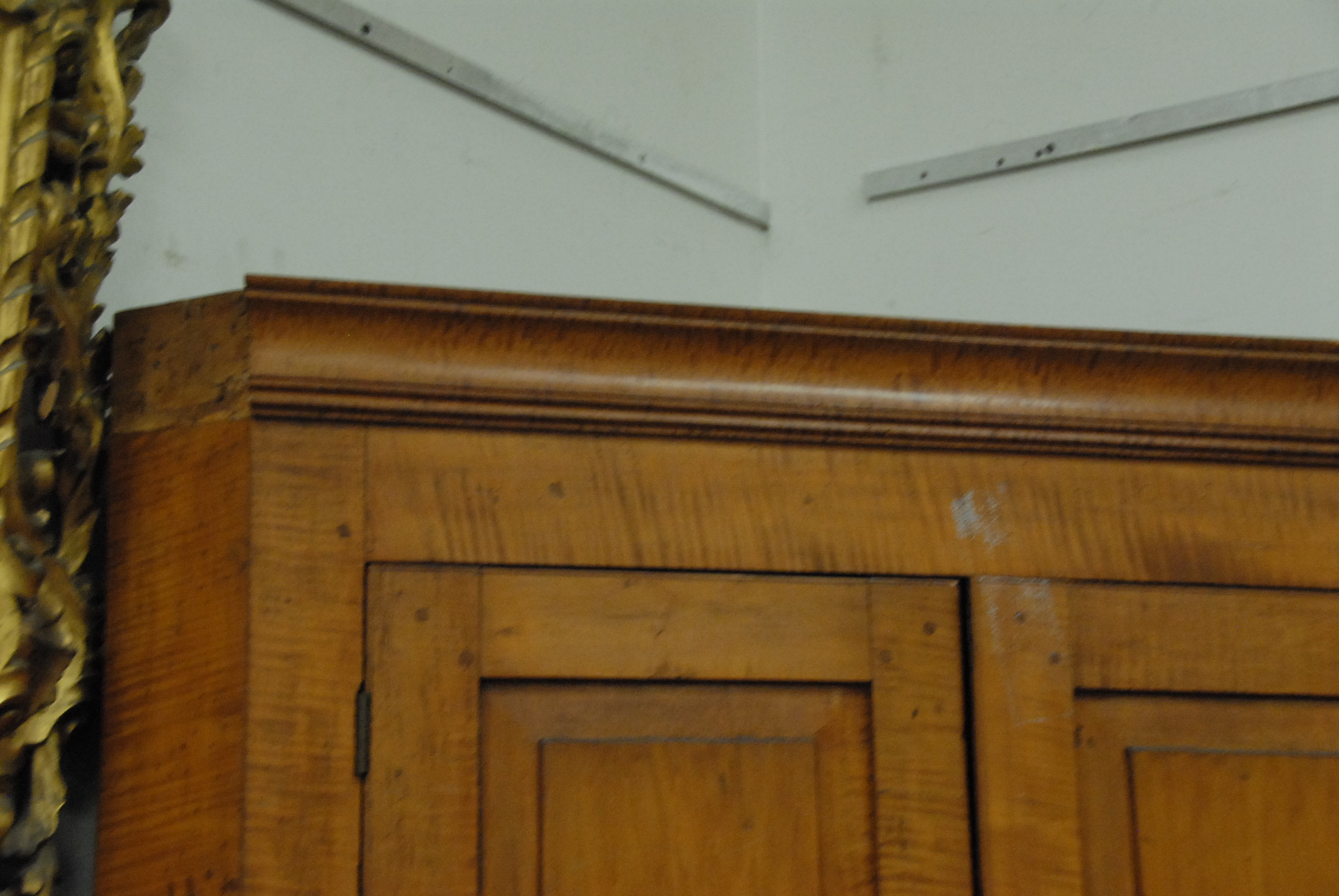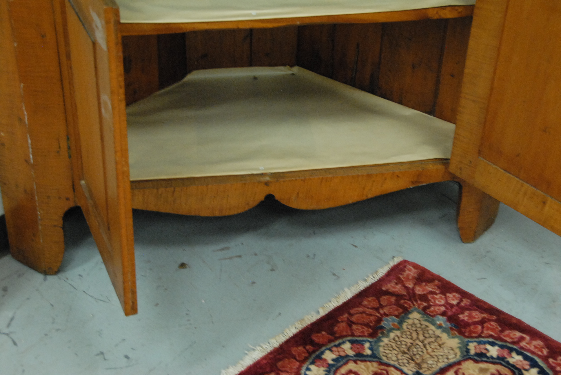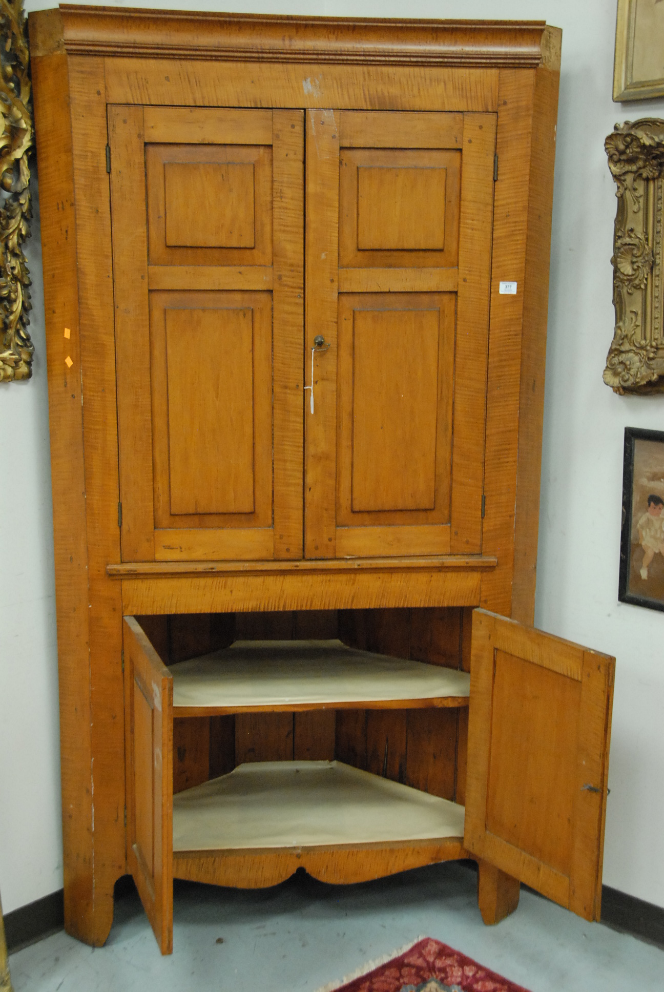 Lot 377: Chippendale tiger maple corner cupboard having carved cornice molding over two doors, each with two raised panels over two raised panel doors on cut out bracket base, late 18th to early 19th century. ht. 84in. wd. 46in. dp. 24in.