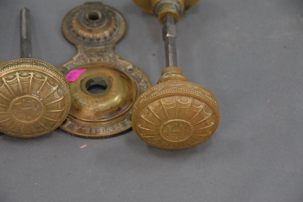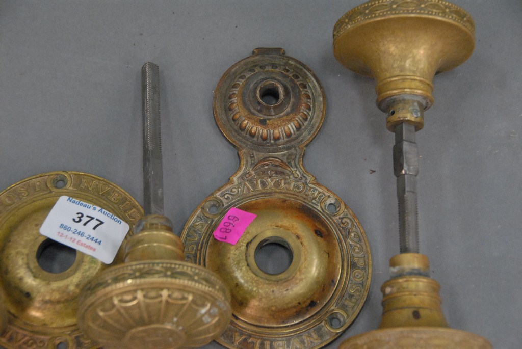 Five brass door knobs.