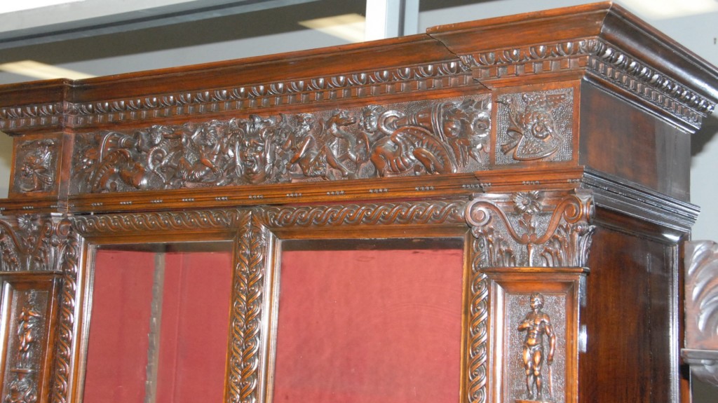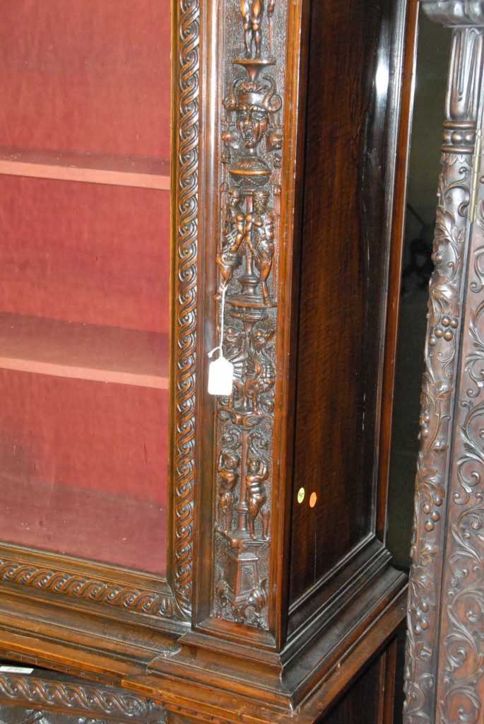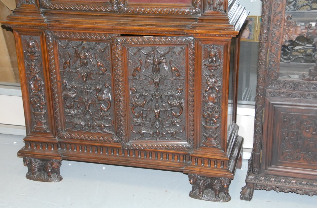 German or Italian cabinet in two parts, upper section having two glass doors on base with two carved doors. Top, sides, and bottom doors heavily carved with putti, men, birds, and animals all set on double lion feet. height 6ft.11in. width 47in. depth 18in.