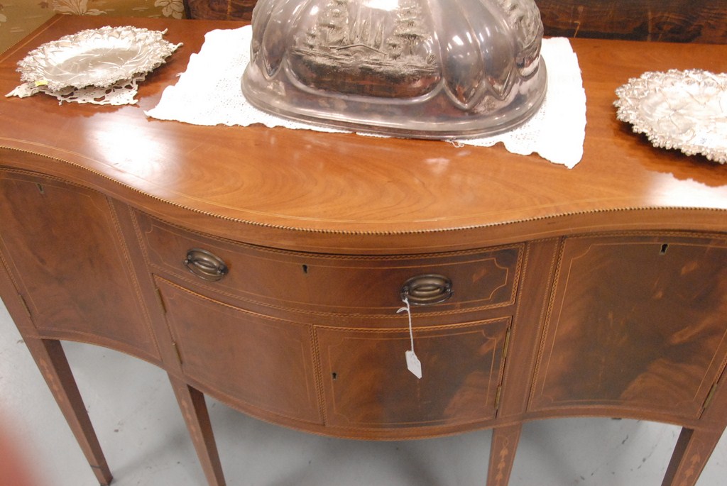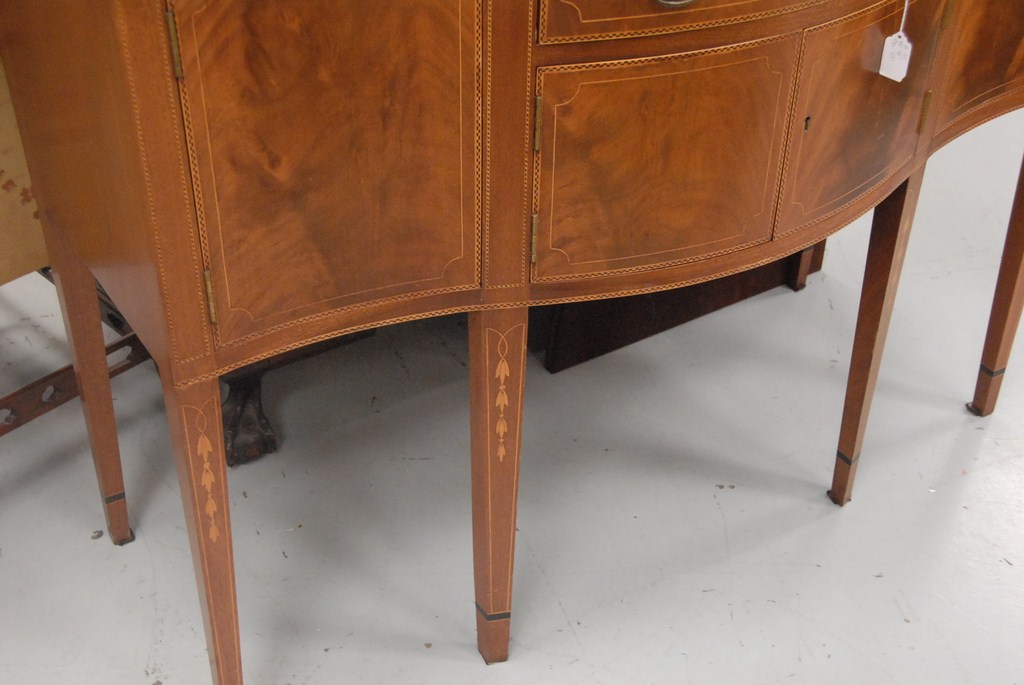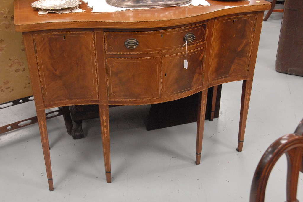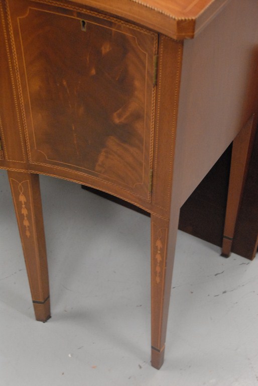 Kittinger mahogany sideboard, diminutive in size with serpentine top over conforming case having one drawer over two doors flanked by two doors all set on square tapered legs all with striped line and bellflower inlays, signed Kittenger Old Dominion 2207-Geo. ht. 37in. wd. 49in. dp. 22in.