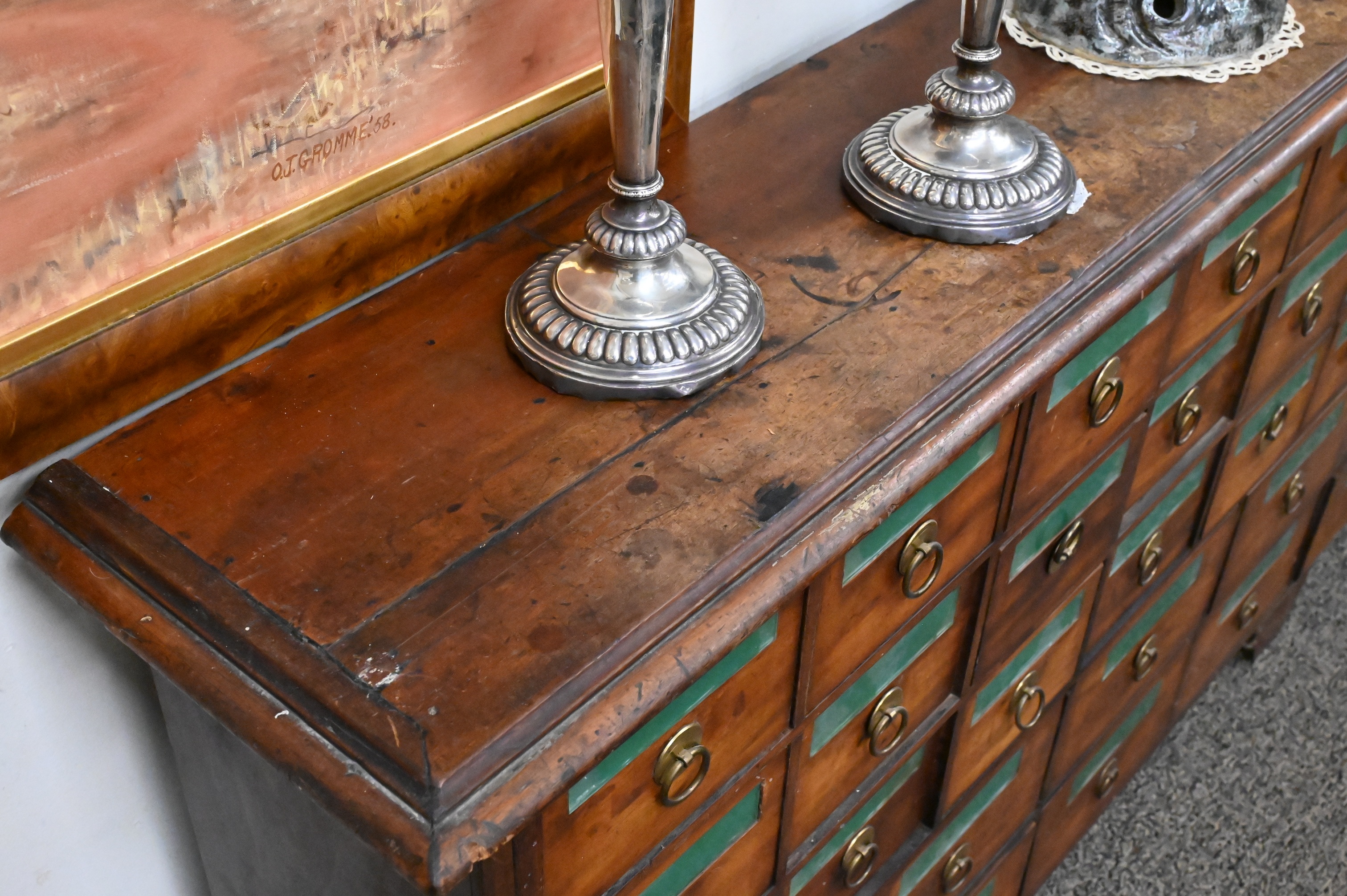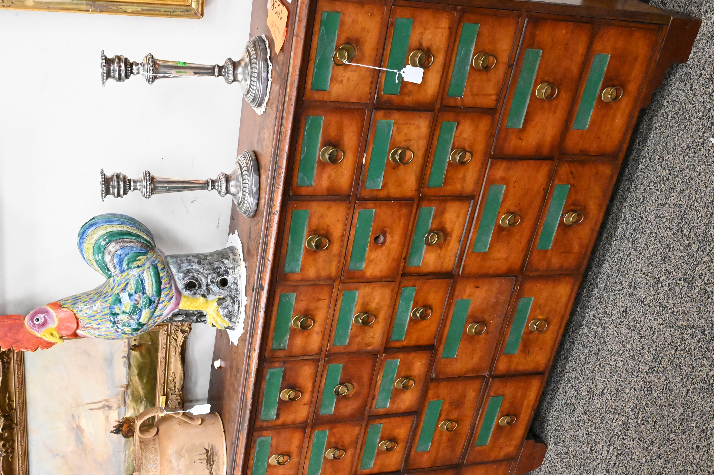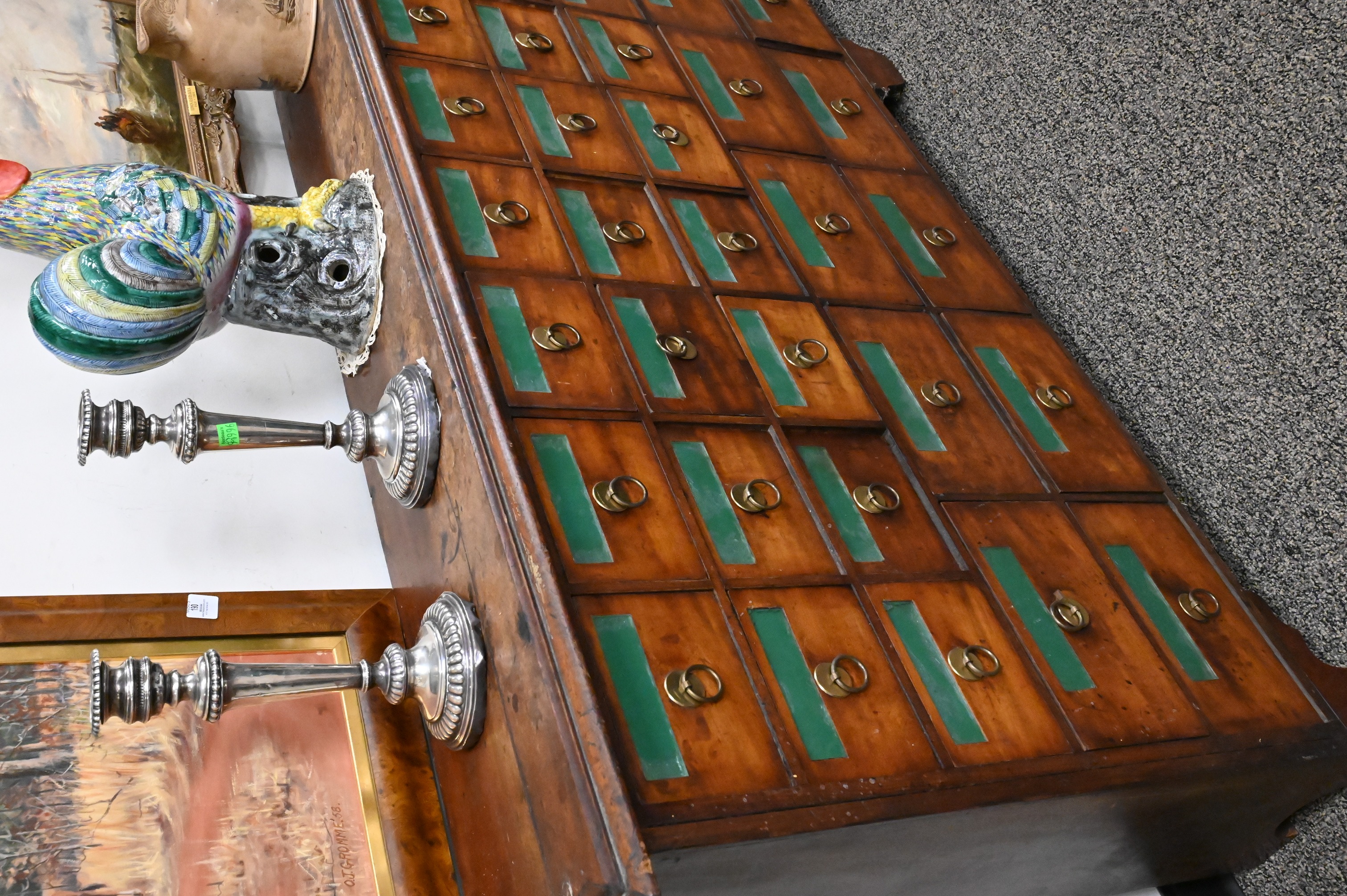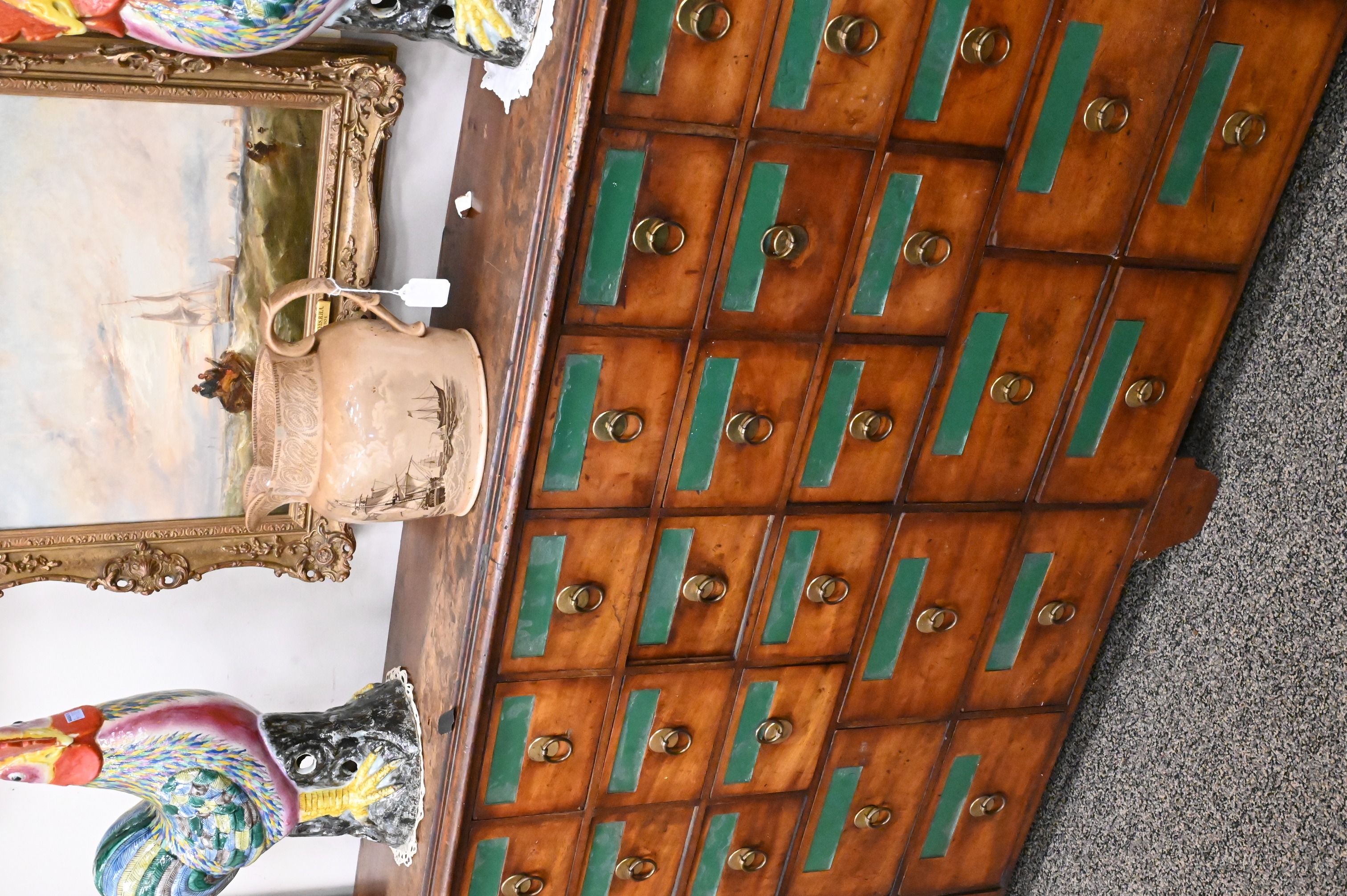 A monumental apothecary cabinet in mixed woods, fitted with 52 drawers, each with brass ring pulls and inset glass panels where labels were once displayed. The long rectangular case, originally with a top, is raised on bracket feet.