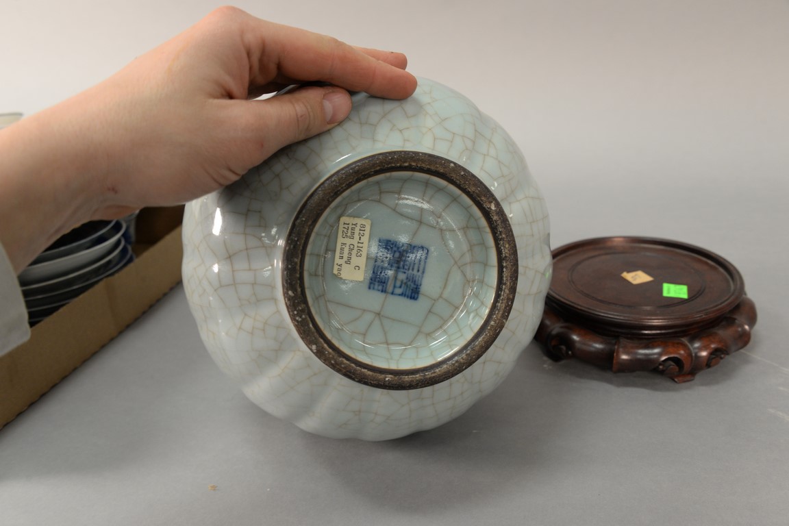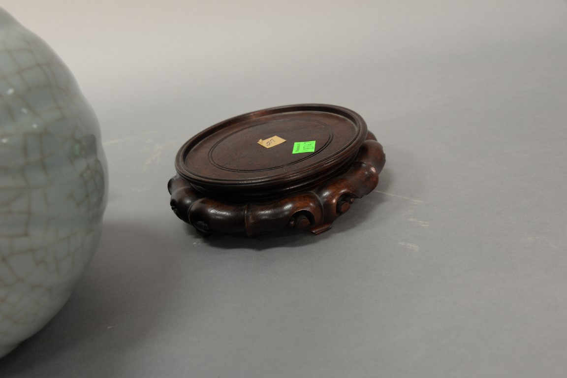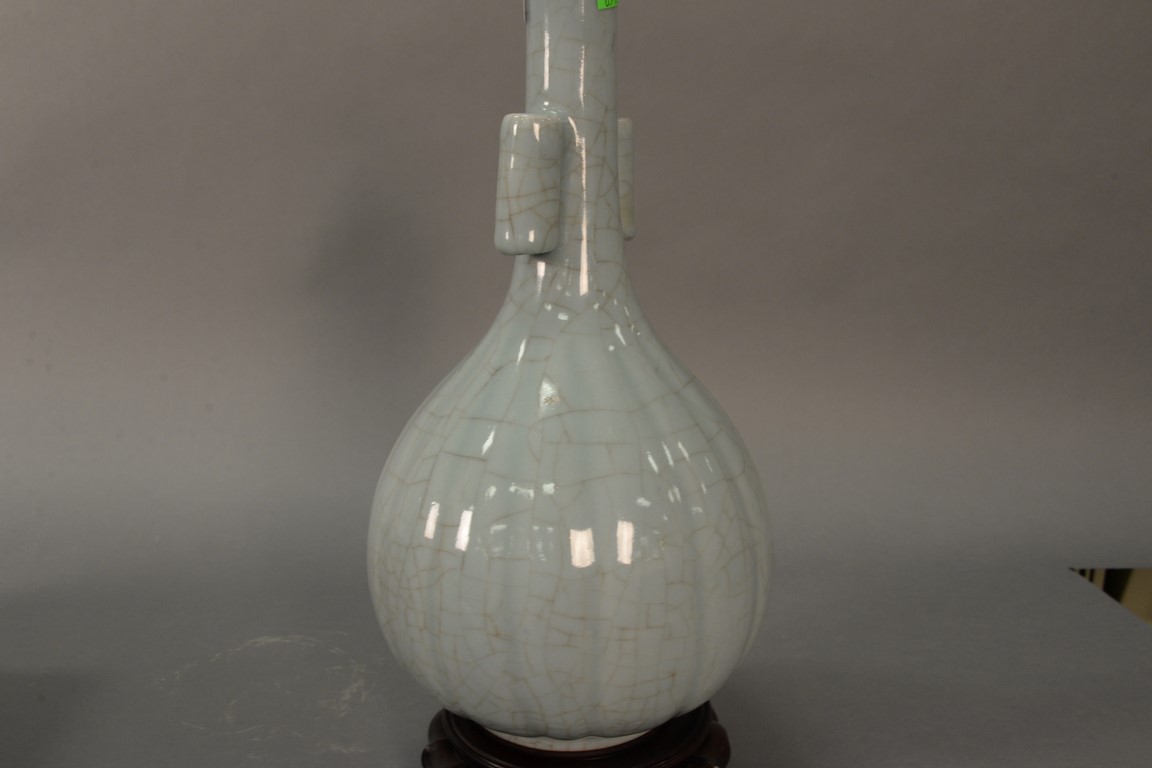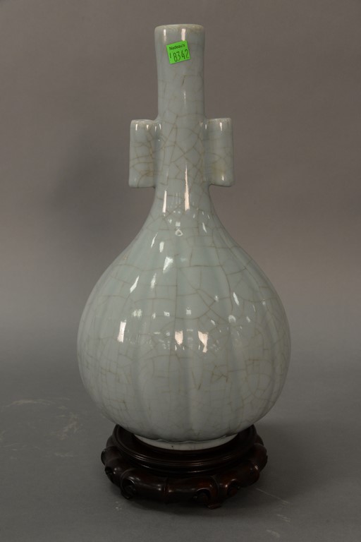 Lot 377: Large Chinese crackle glazed vase, celedon green glaze with bottle form body and long slender neck mounted with tube handles, having…