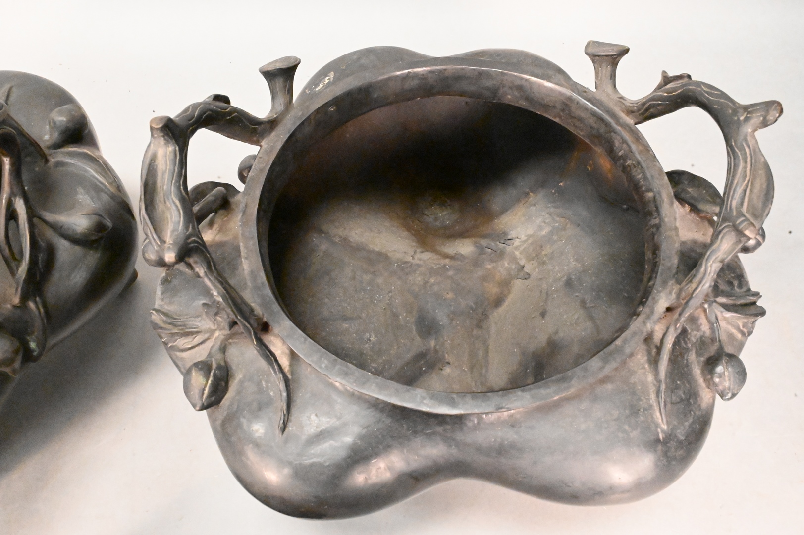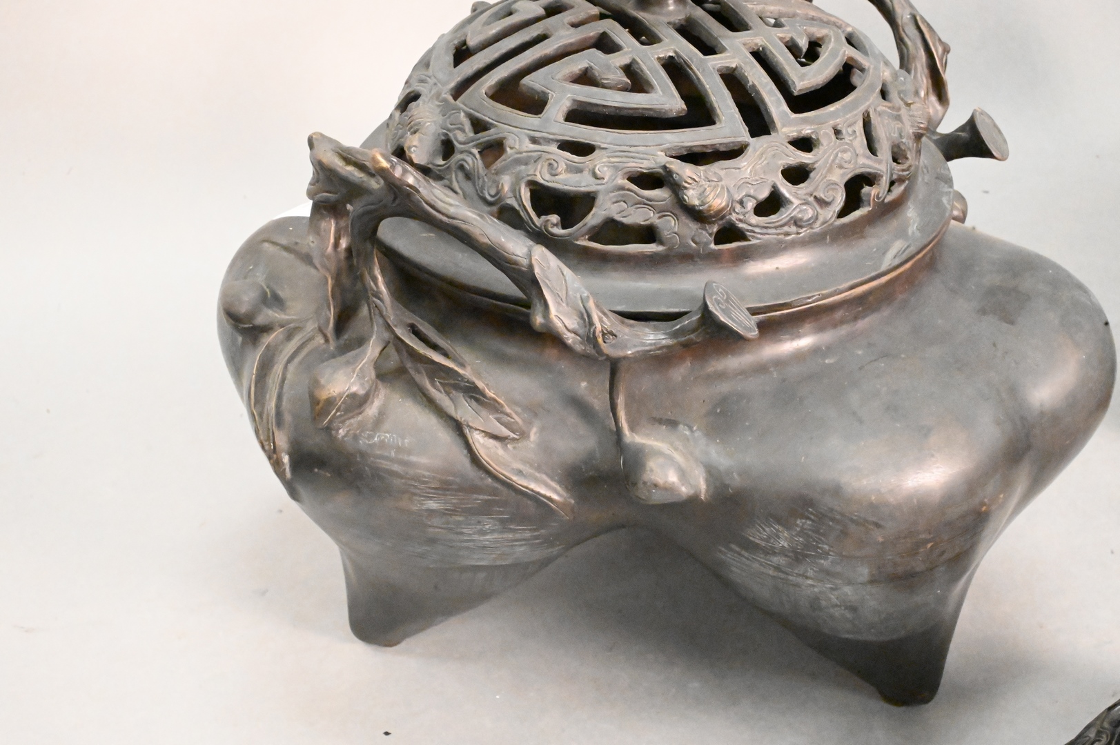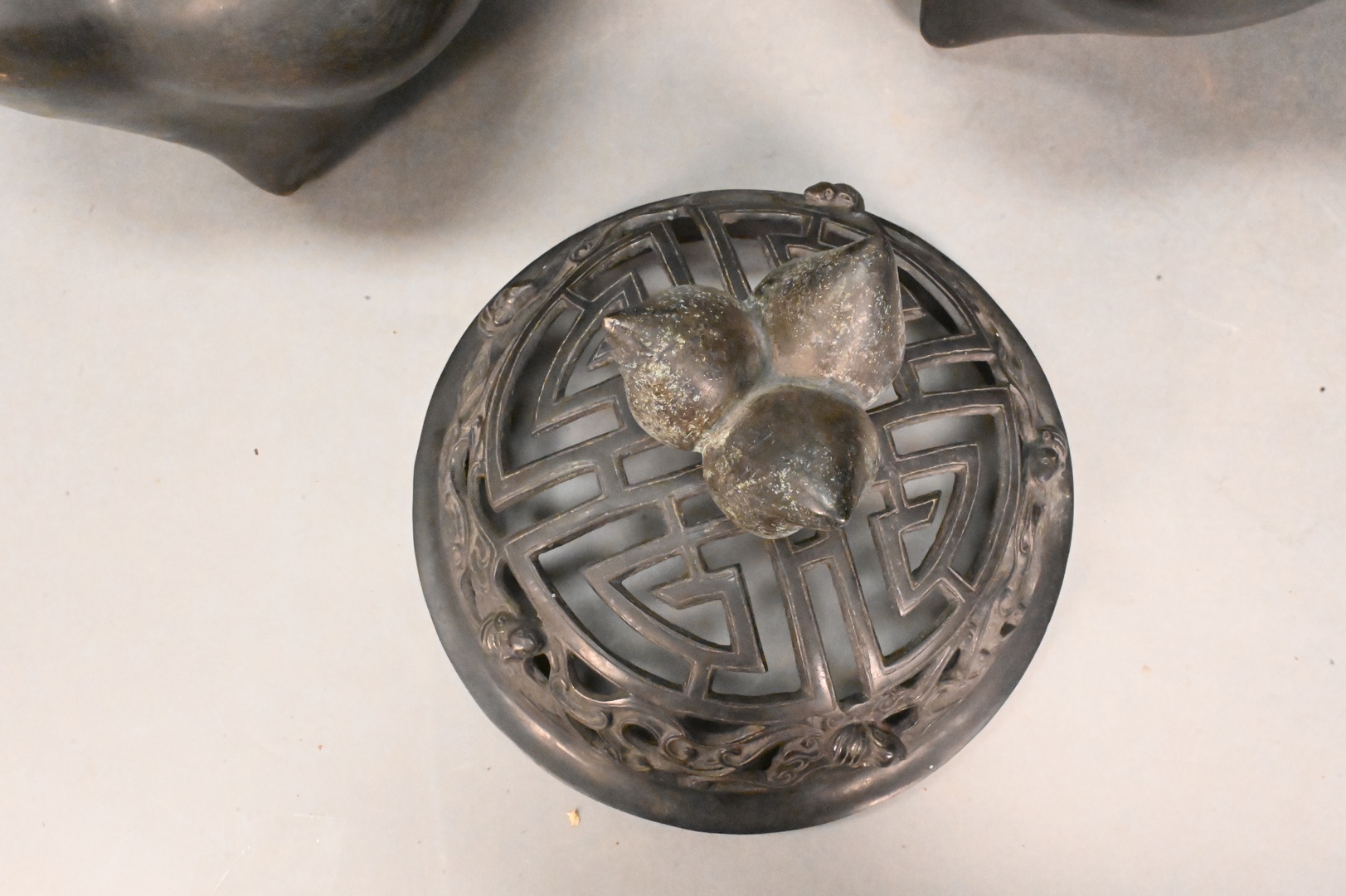 Large Pair of Bronze Covered Censers, China, 20th century, in archaic shape of a tripod ding, height 12 inches, diameter 12 inches.