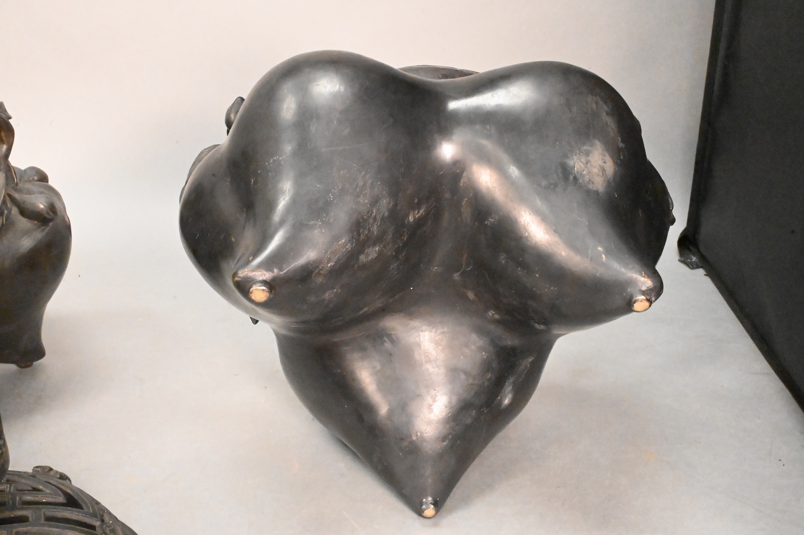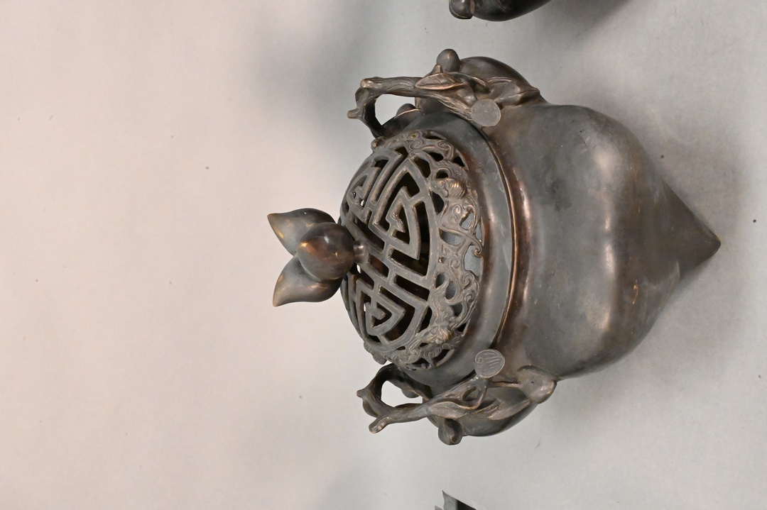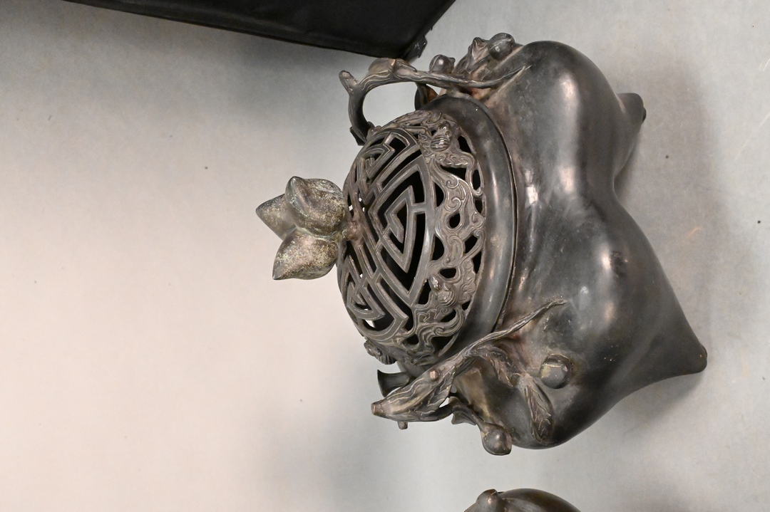 Large Pair of Bronze Covered Censers, China, 20th century, in archaic shape of a tripod ding, height 12 inches, diameter 12 inches.