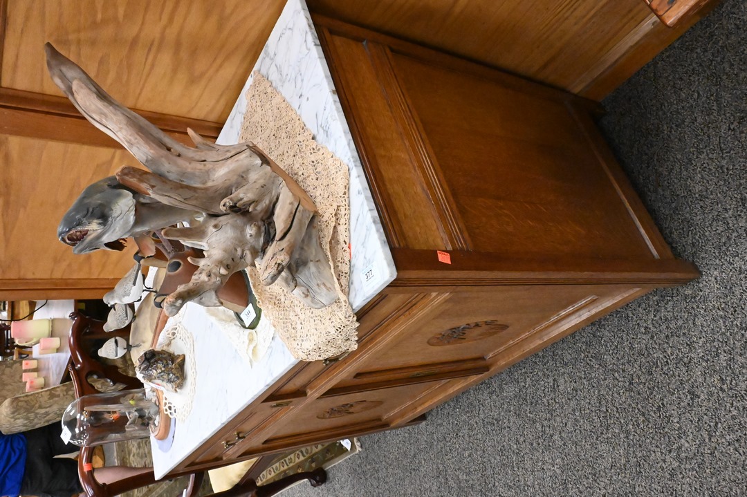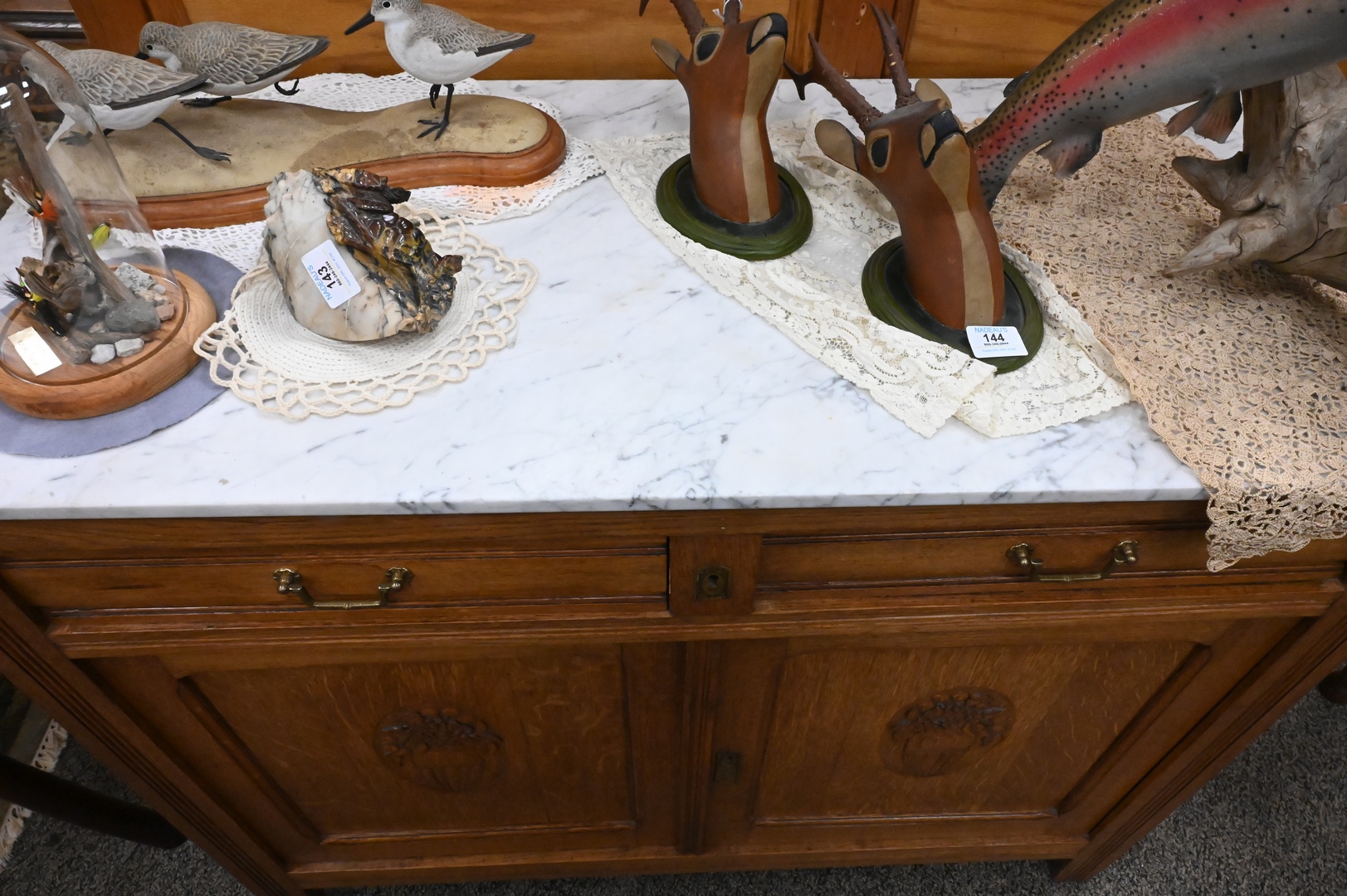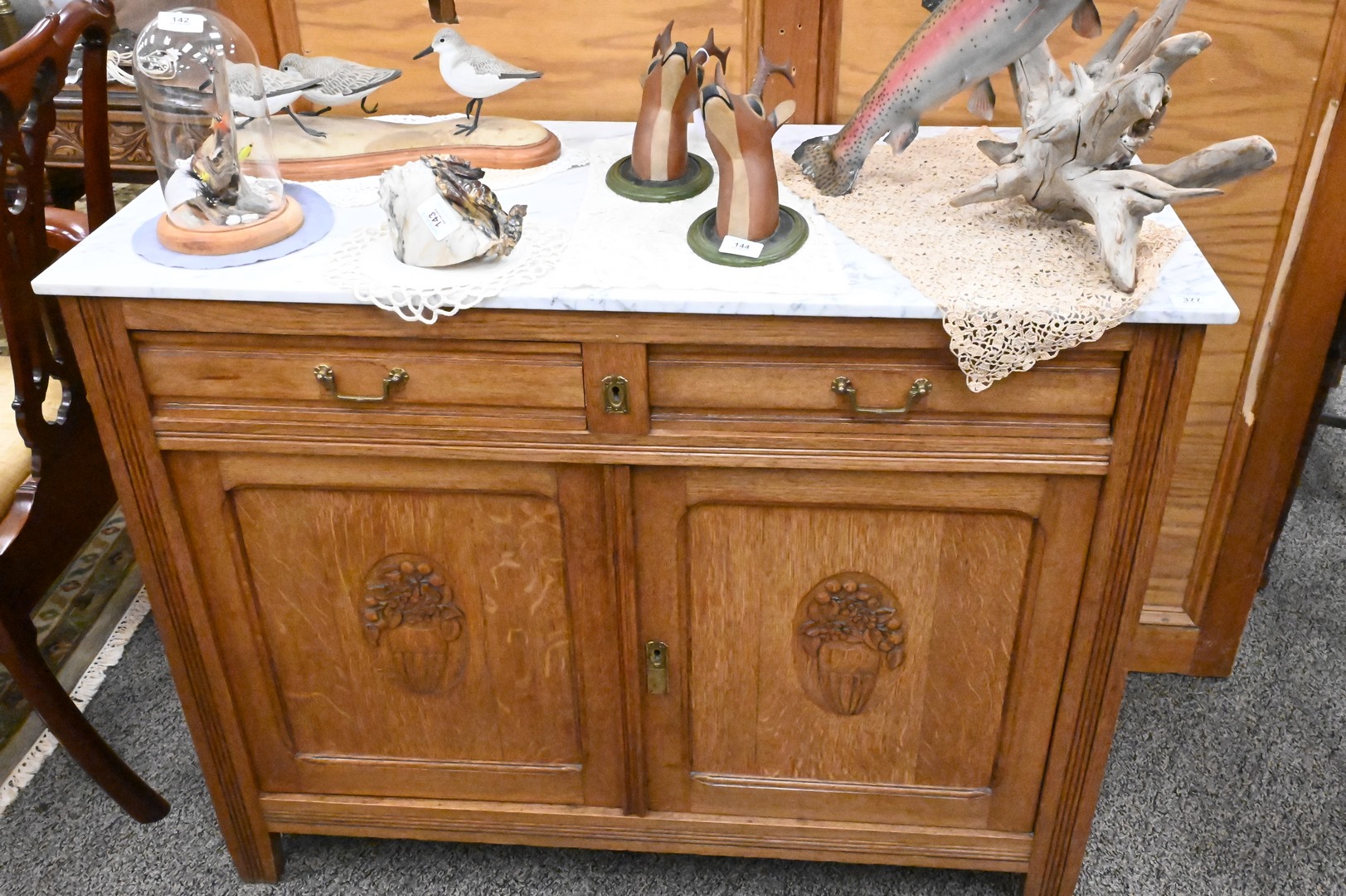 Oak Server, having marble top, height 34 inches, top 20″ x 43″.
