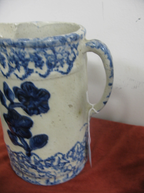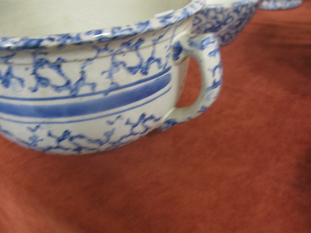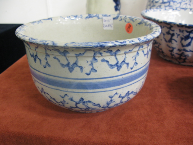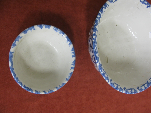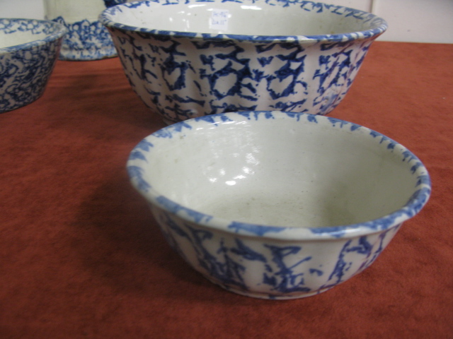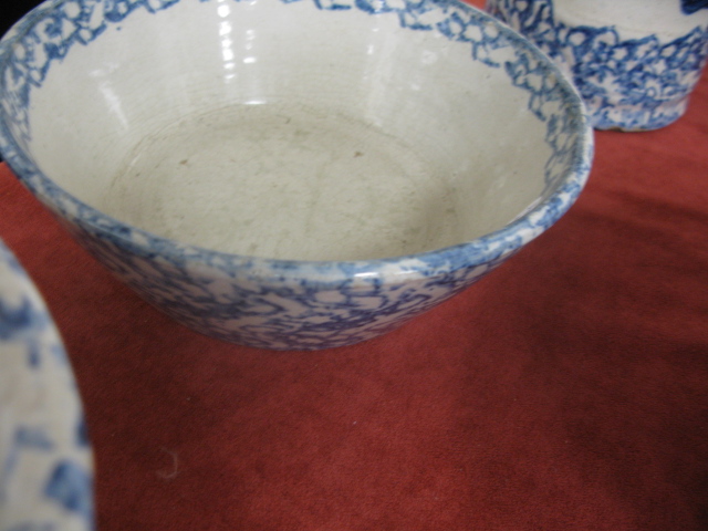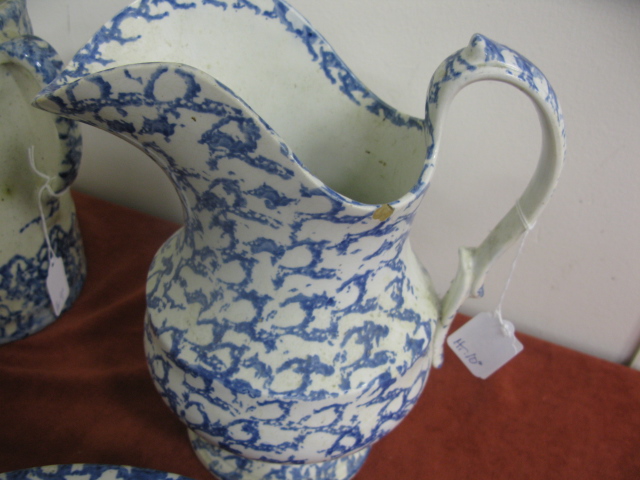 Six piece lot of sponge decorated stoneware, two pitchers and four bowls.