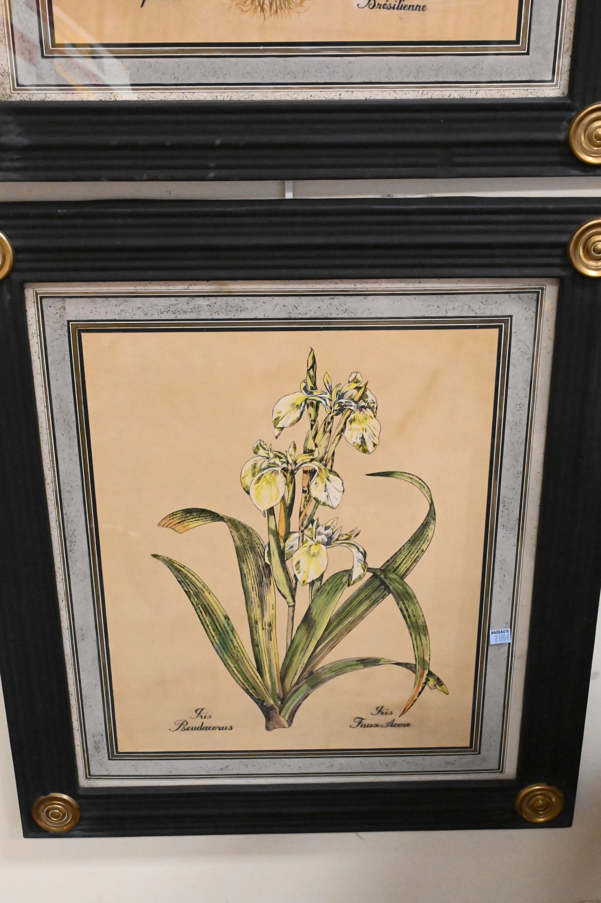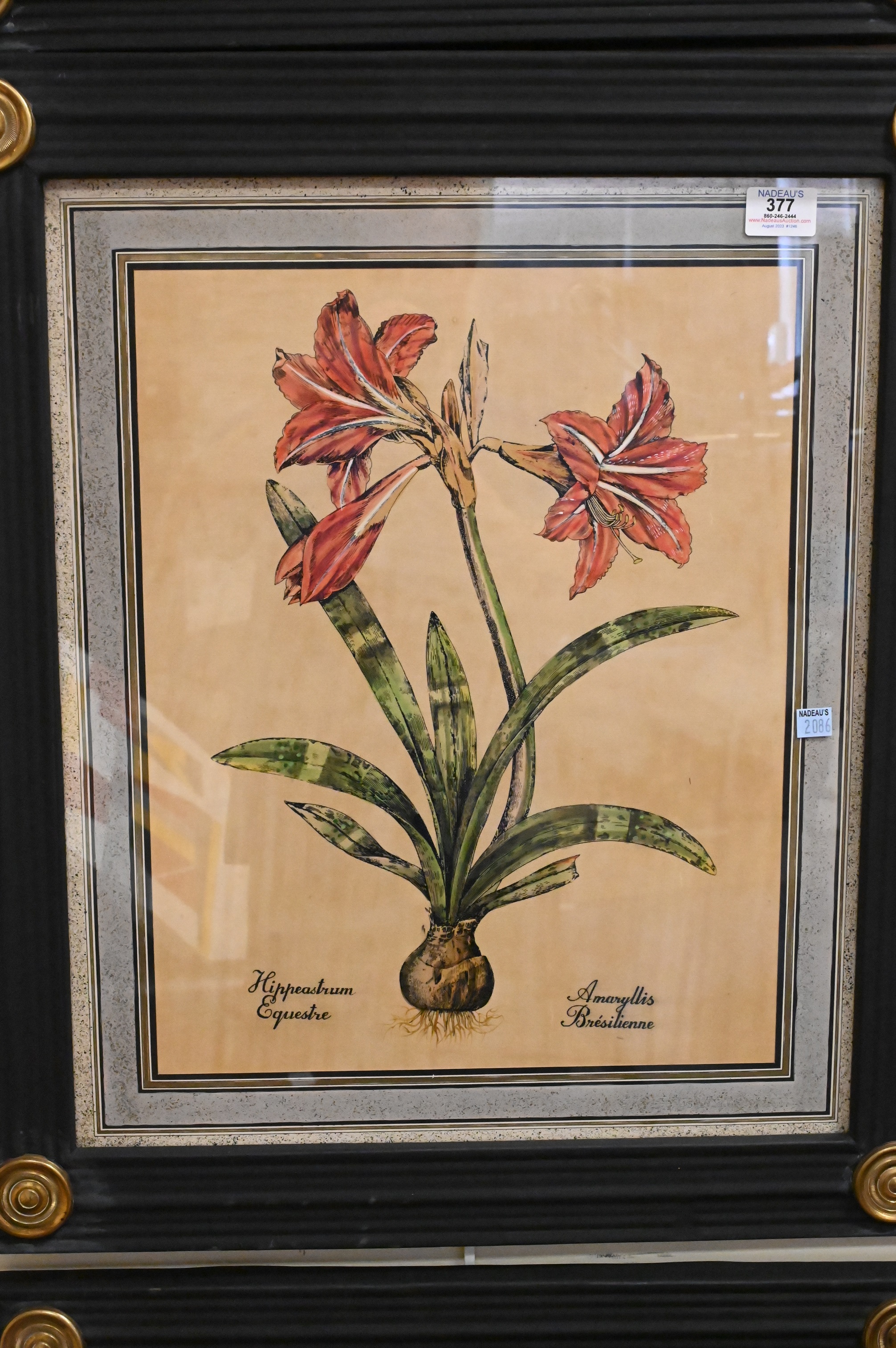 Three Hand Painted Botanicals on Antique Paper to include, “Ixia a Grande Fleur”, “Iris Faux Acore” along with, “Amaryllis Bresilienne all 18″ x 14”