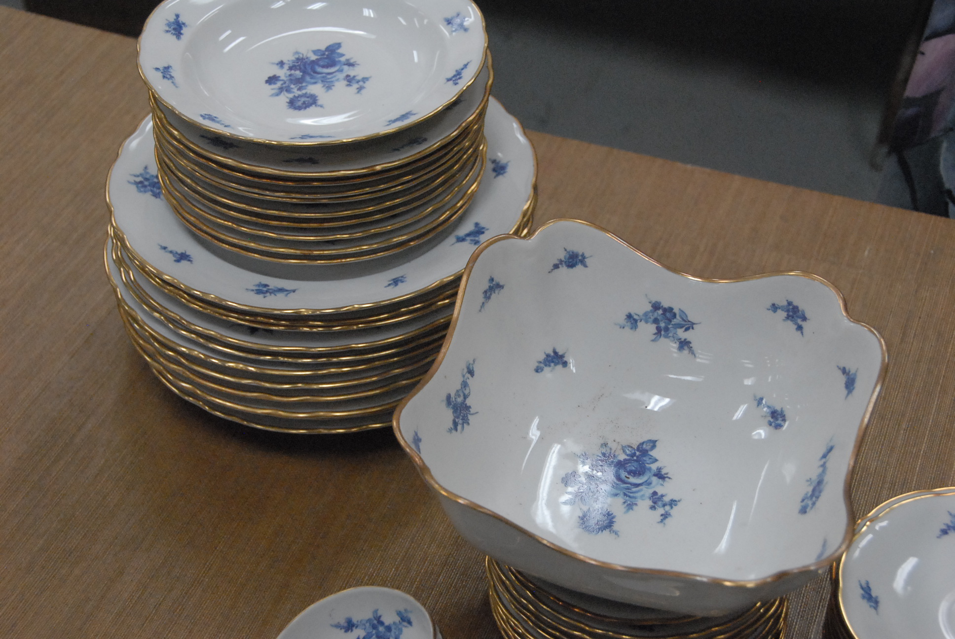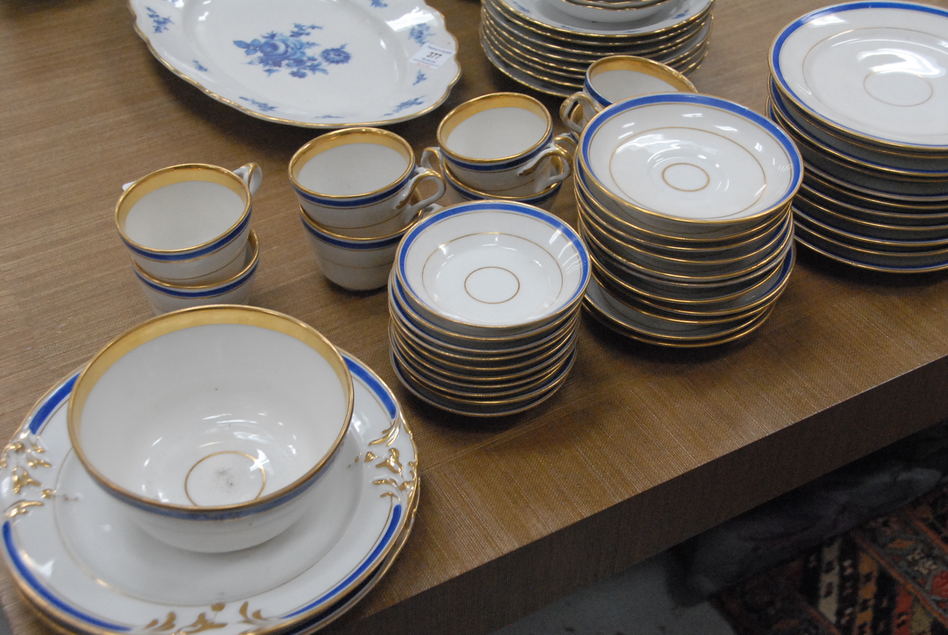 Lot 377: Two partial china sets to include 72 pieces of Bavarian German Blue Flowers and 47 pieces of Blue and gold rimmed set.