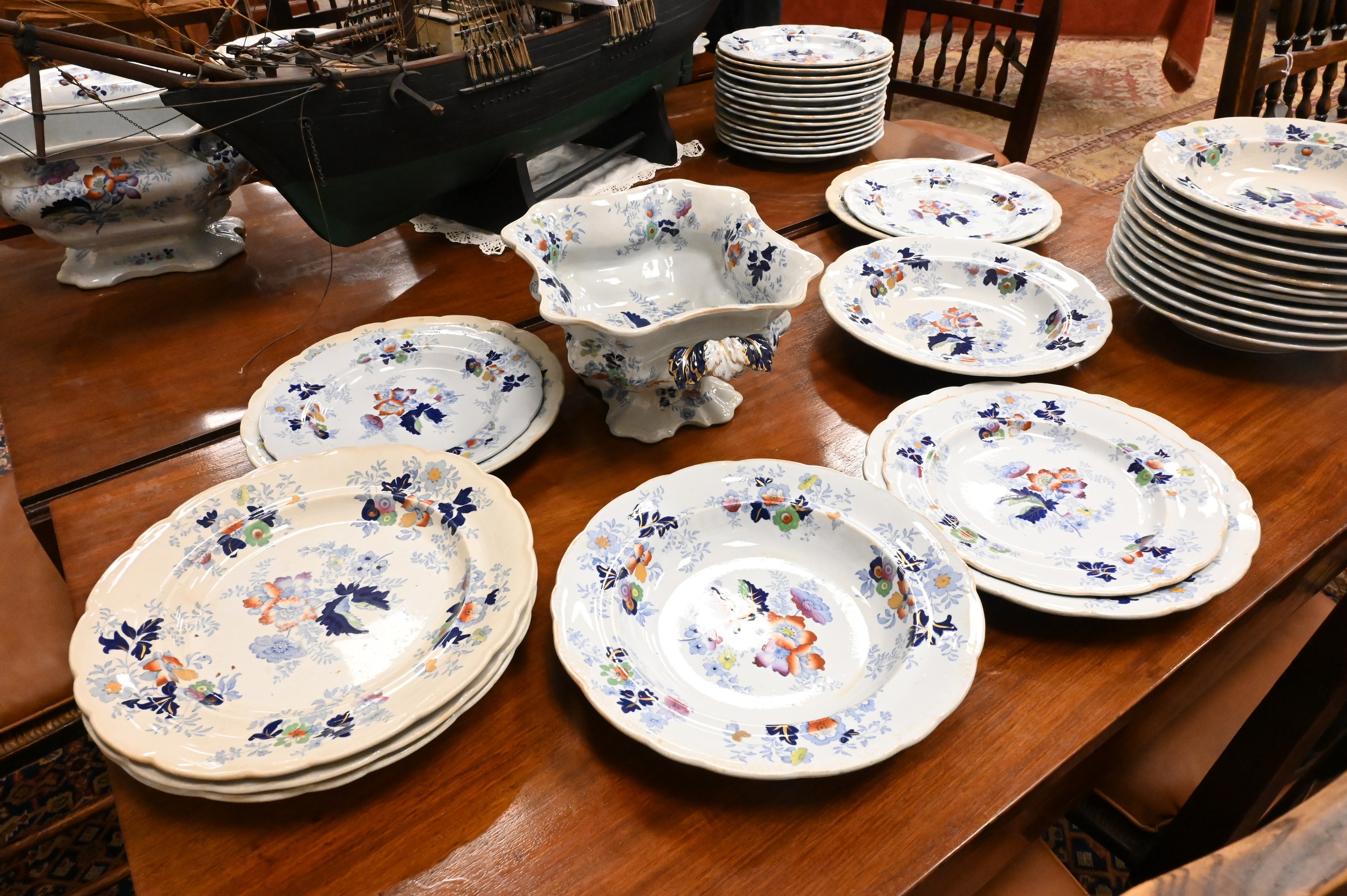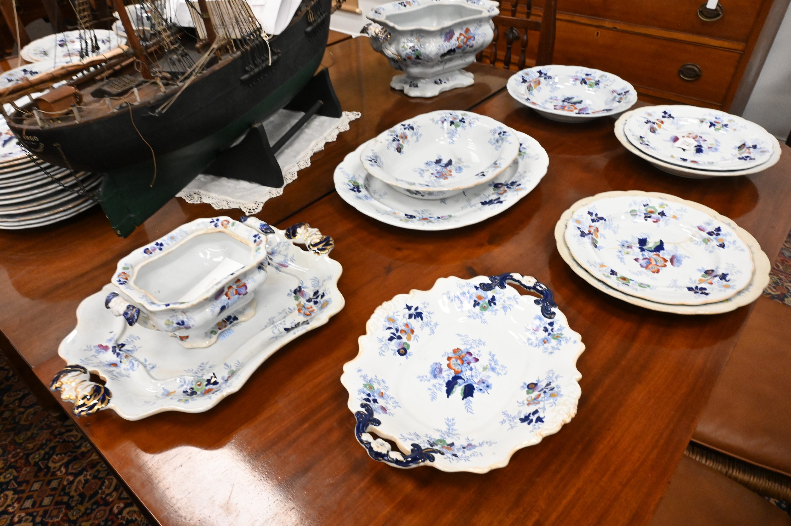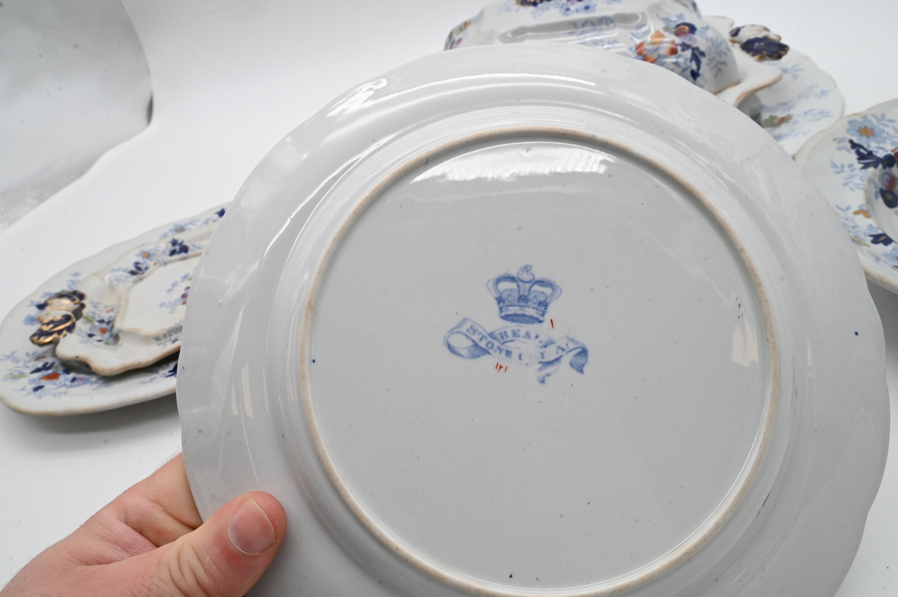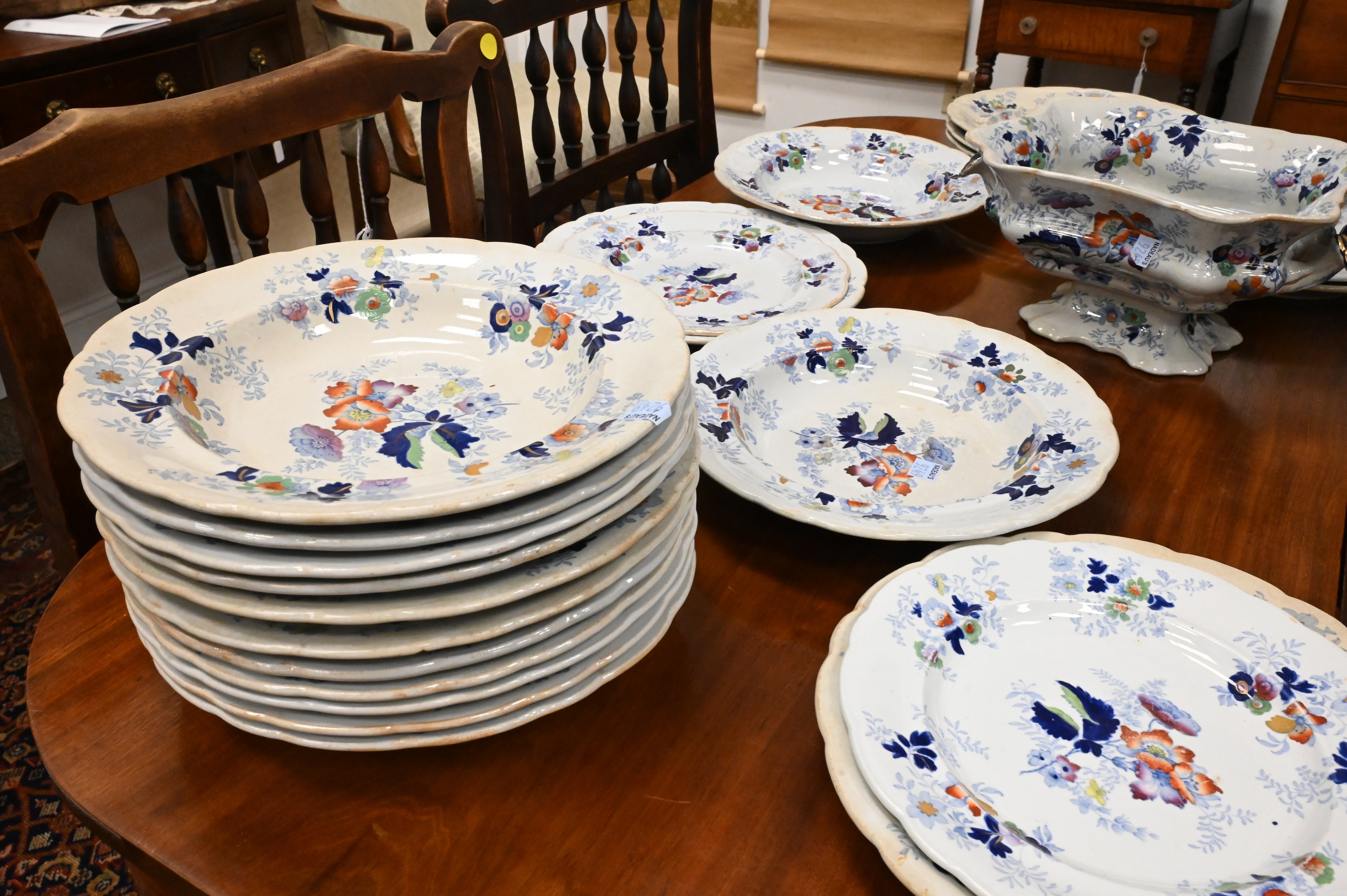 Including a 6 dinner plates, 19 luncheons plates, 16 soups, 4 covered and open compotes along with 7 additional serving pieces each decorated with scattered polychrome floral sprays in the Imari palette of iron red and cobalt blue with gilt highlights. Undersides with blue printed crown and banner marks reading “Real Stone China.” England, mid-19th century.